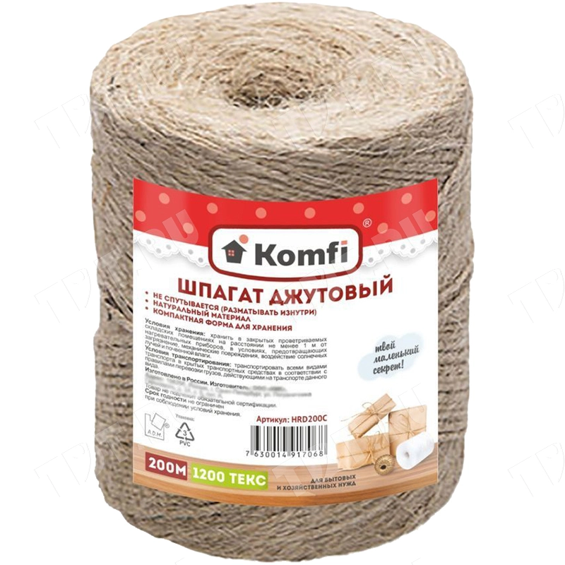 Джутовый шпагат Komfi намоткой 200 м, диаметром нити 2 мм, плотностью 1200 текс. Натуральная веревка изготовлена из крученого джута. Производится в России.
