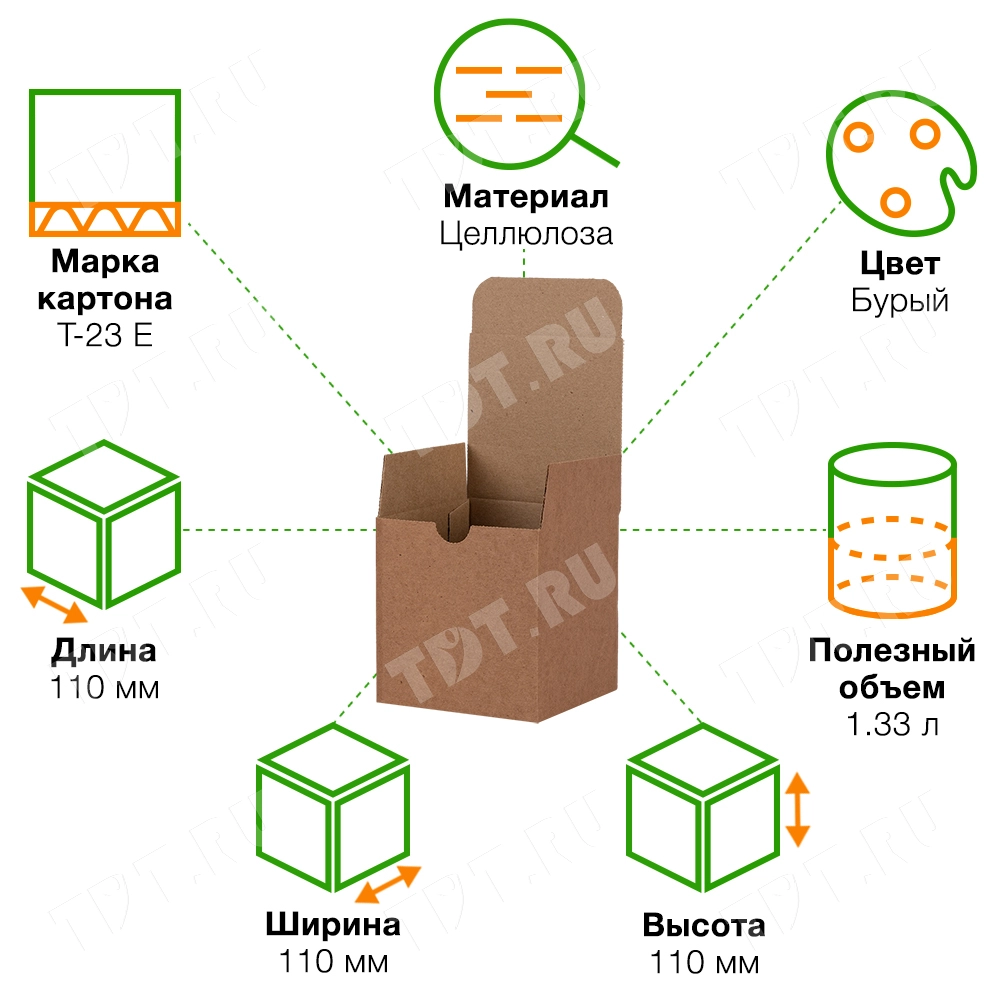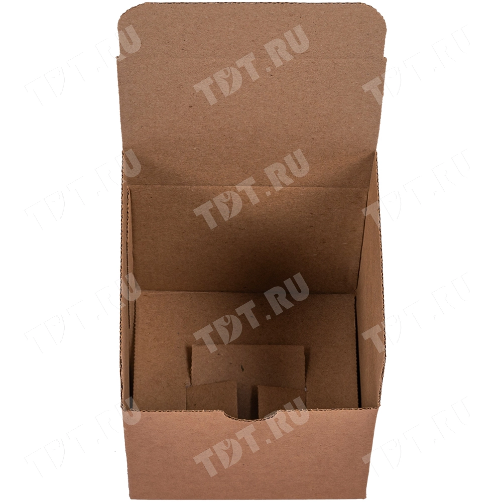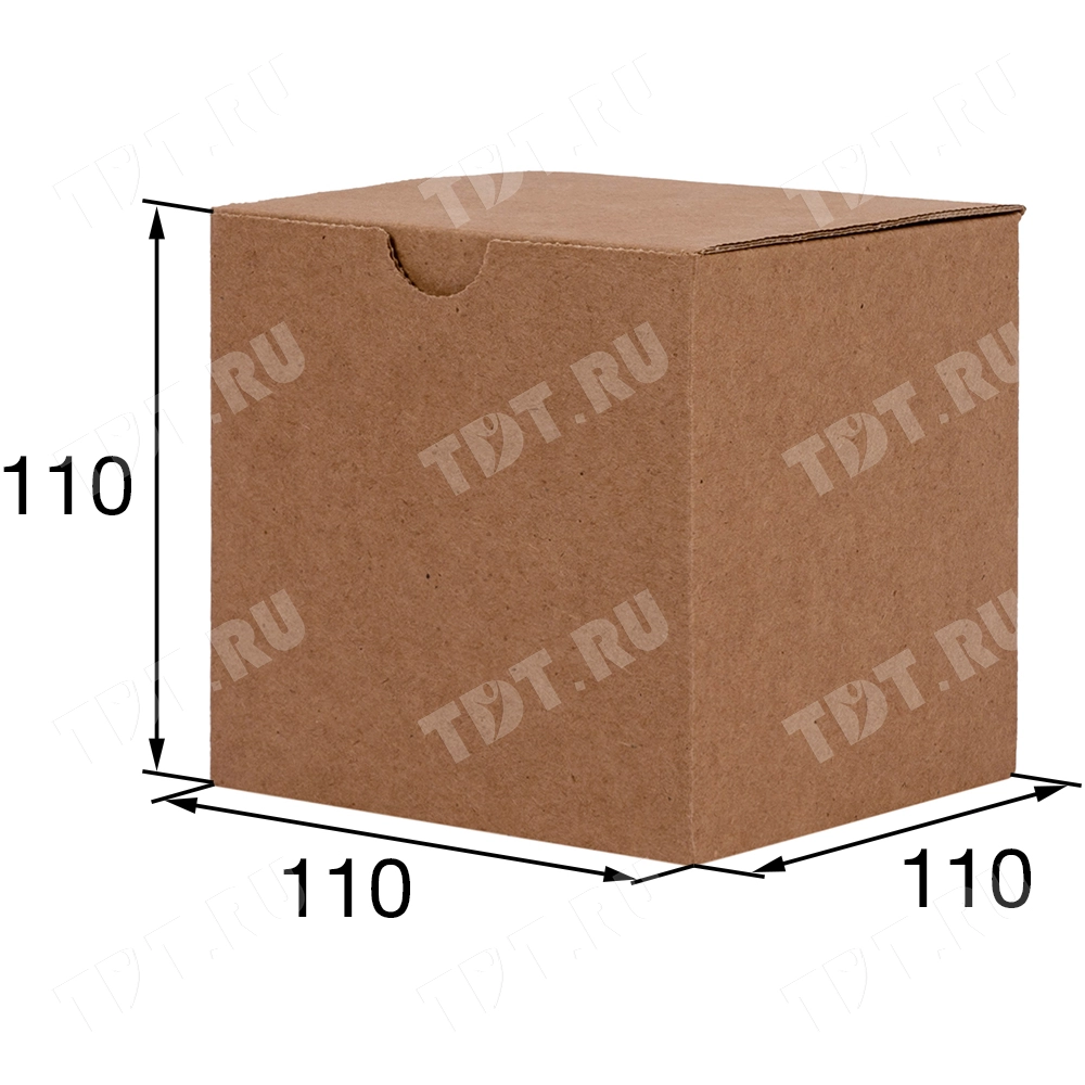 Коробка №236 «Ласточкин хвост» бурого цвета, длиной 110 мм, шириной 110 мм и высотой 110 мм. Изготовлена из микрогофрокартона Т-23 Е. Полезный объём — 1.33 л.