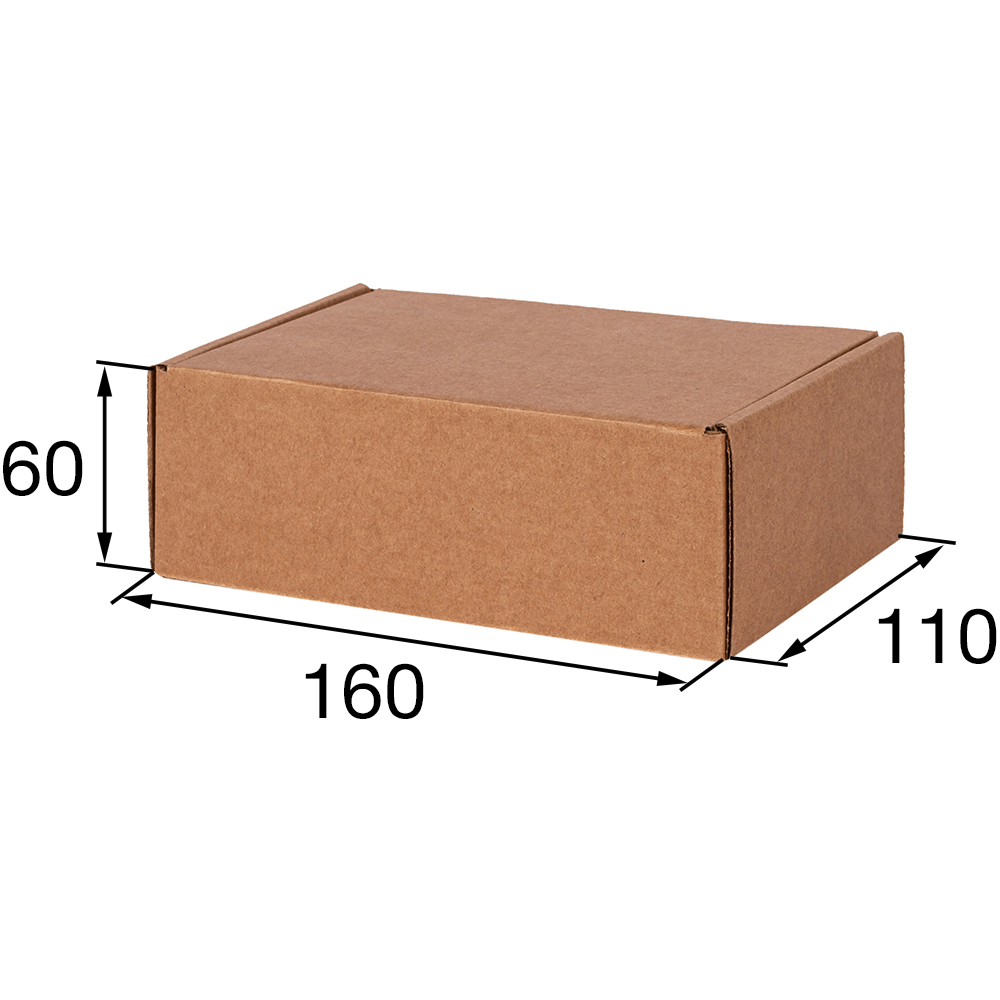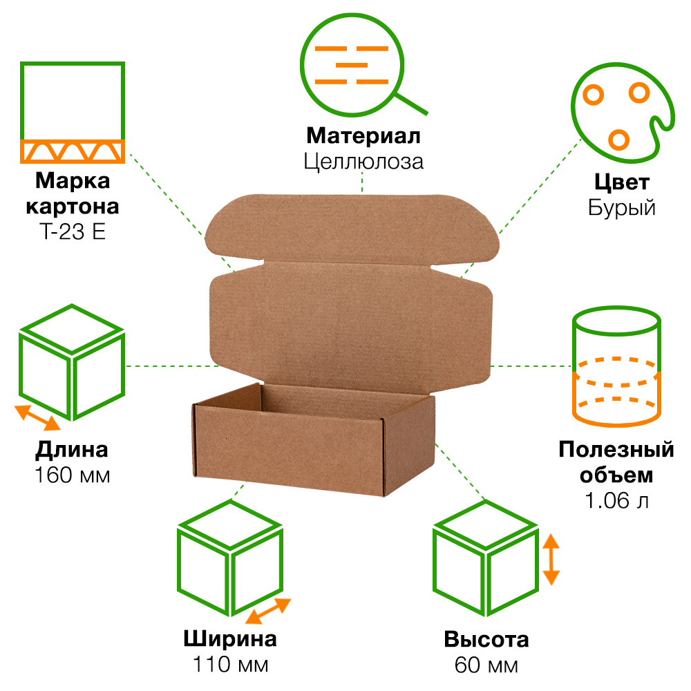 Самосборная коробка №237 бурого цвета, длиной 160 мм, шириной 110 мм и высотой 60 мм. Изготовлена из микрогофрокартона Т-23 Е. Полезный объём — 1.06 л.
