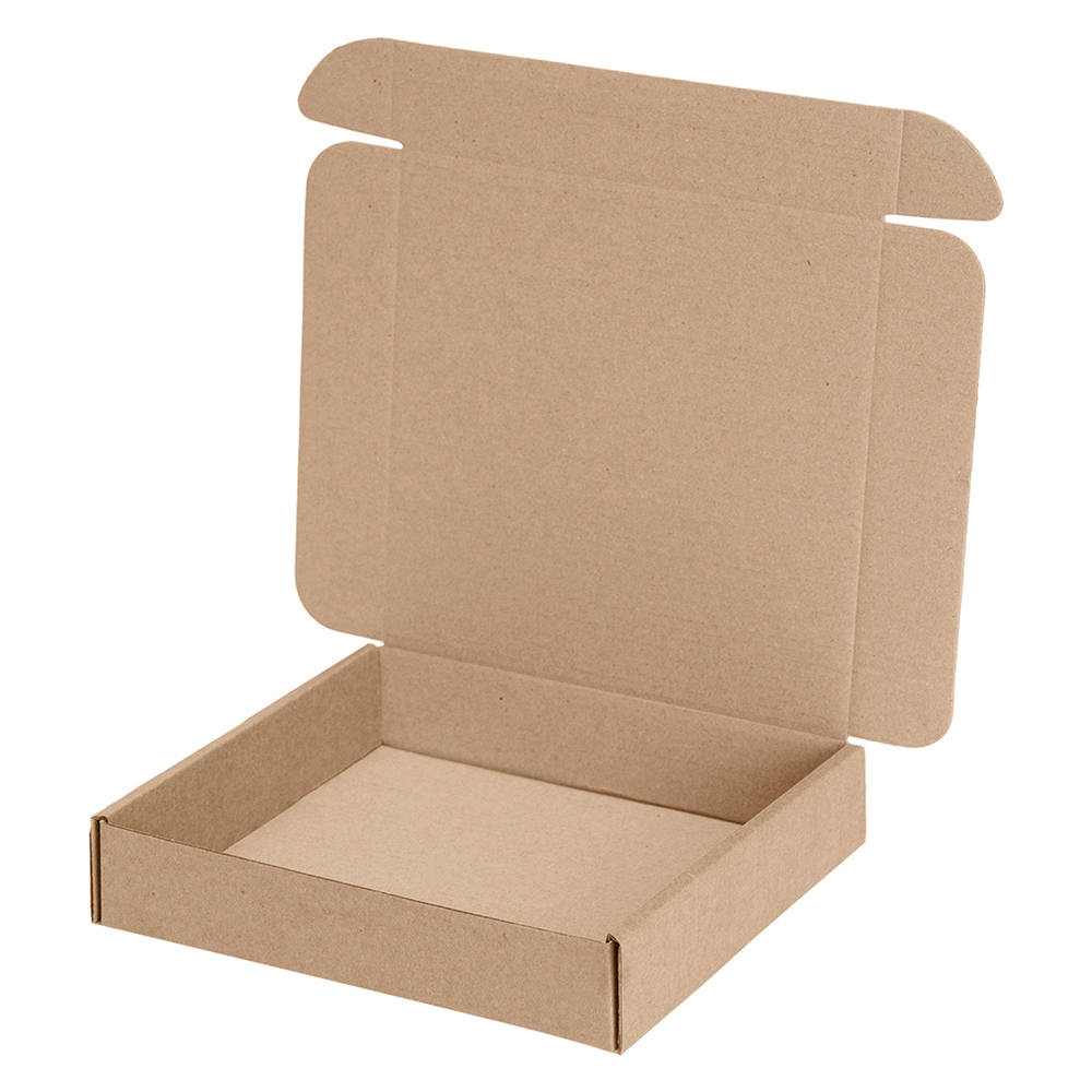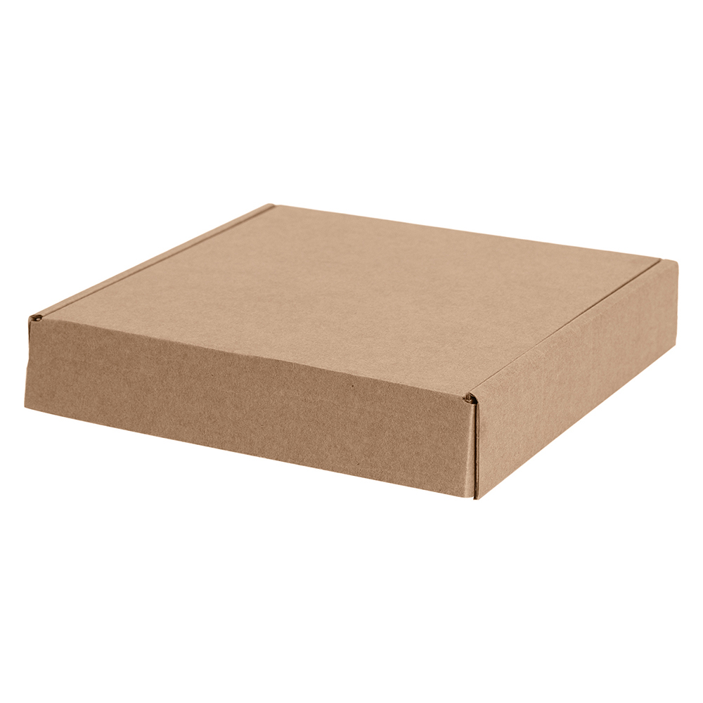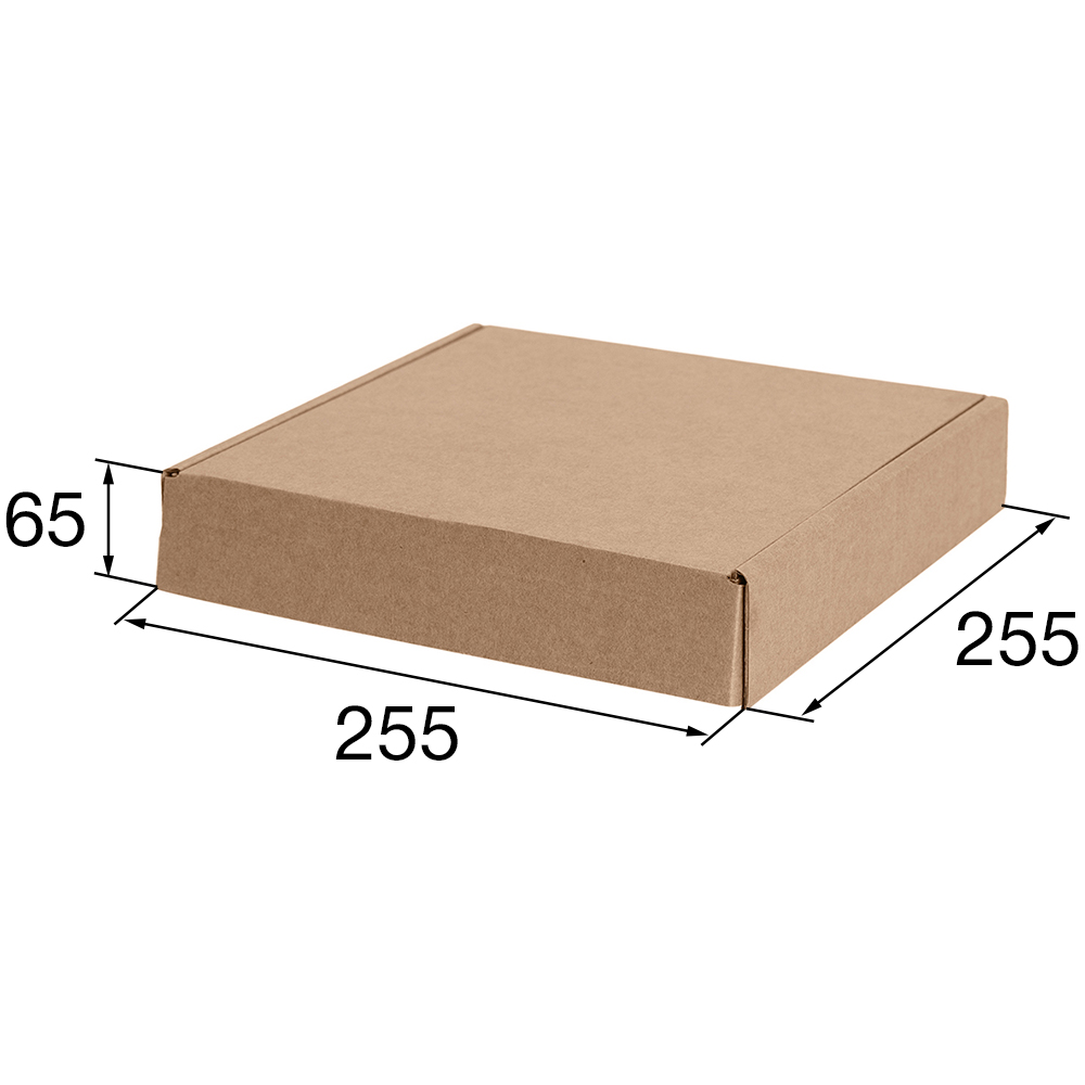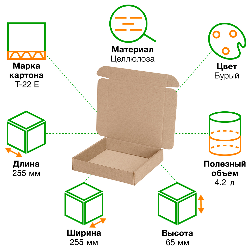 Короб №209 (премиум) бурого цвета, длиной 255 мм, шириной 255 мм и высотой 65 мм. Изготовлен из микрогофрокартона Т-22 Е. Полезный объём — 4.2 л.