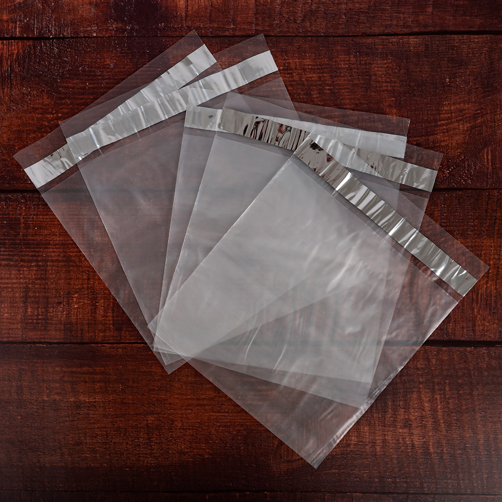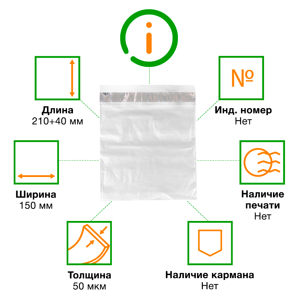 Прозрачный курьер-пакет без кармана, без печати, длиной 210+40 мм, шириной 150 мм, толщиной 50 мкм. В упаковке 100 штук.