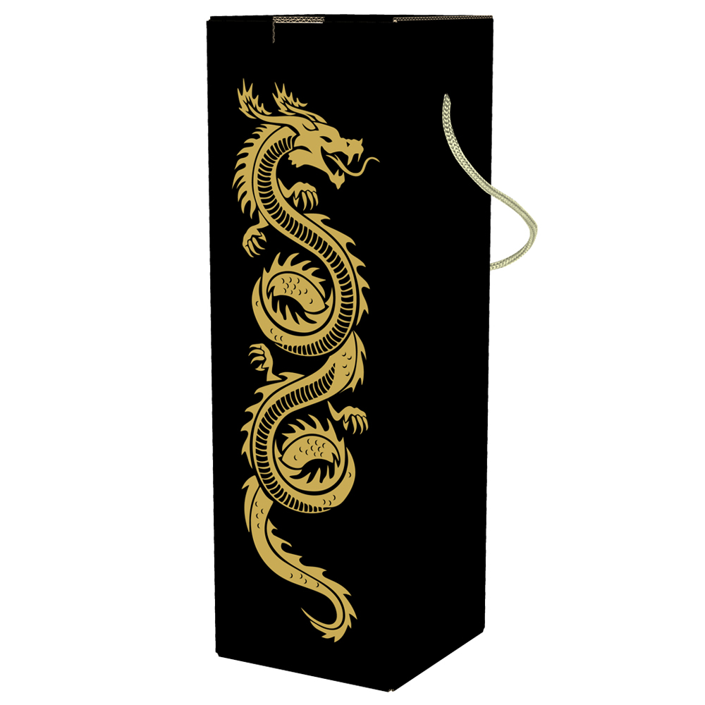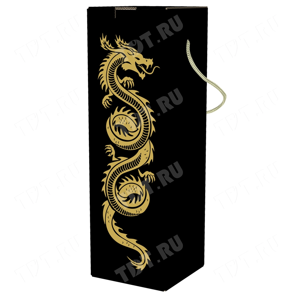 Подарочная коробка для бутылки шампанского «Дракон на черном», длиной 110 мм, шириной 110 мм и высотой 370 мм, веревочная ручка. Тематическая надпись: «С Новым годом!». Изготовлена из картона. Полезный объём — 4.48 л.