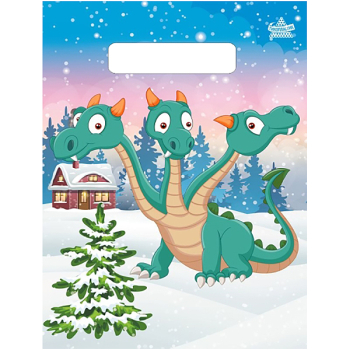 Полиэтиленовые пакеты с вырубной неусиленной ручкой «Веселый Горыныч» с новогодним рисунком, длиной 25 см, шириной 19 см, толщиной 30 мкм, в упаковке 100 штук. Производятся в России.