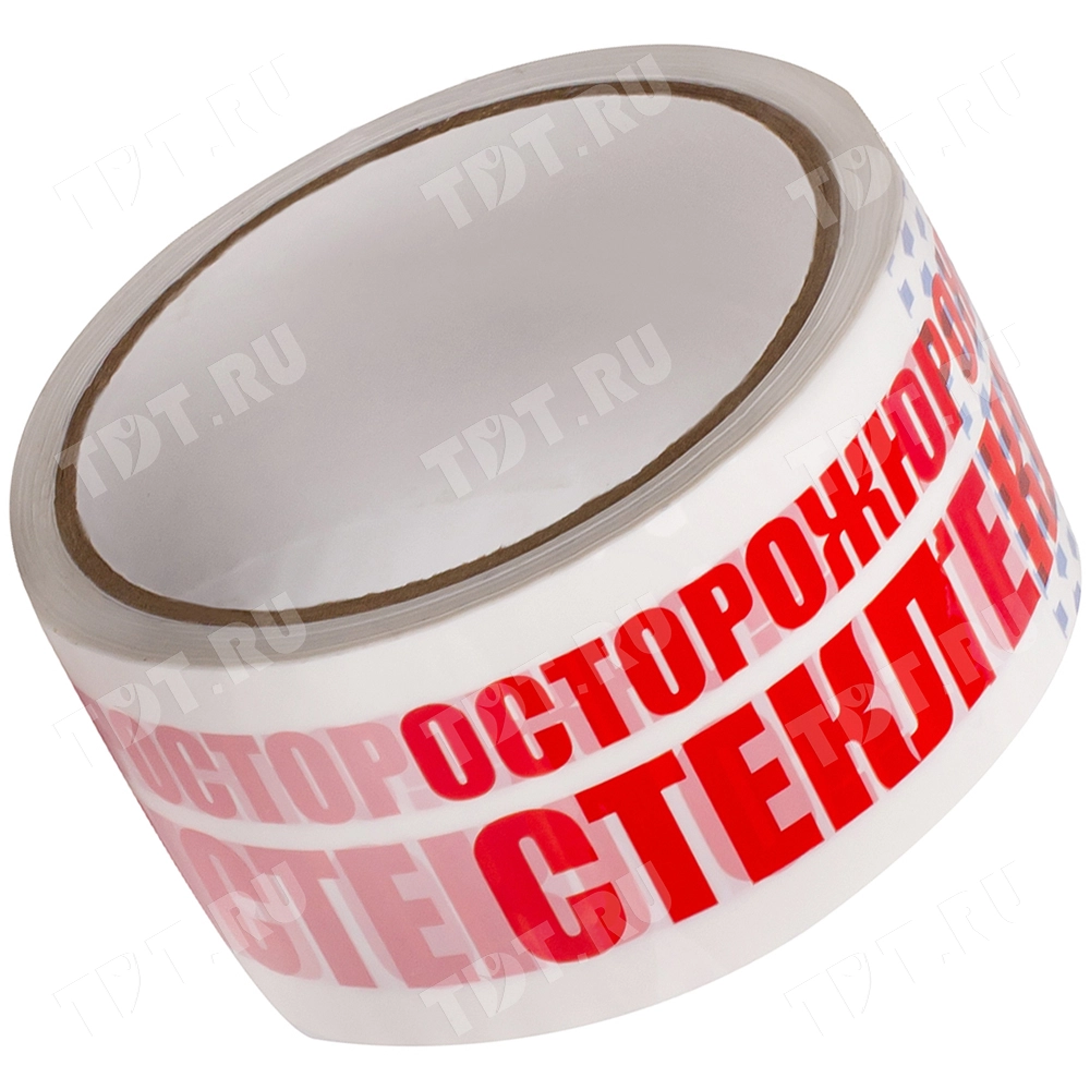 Белая клейкая лента с красной надписью «Осторожно стекло» шириной 48 мм, диаметром втулки 76 мм, намоткой 66 метров, толщиной 45 мкм. Изготовлена на основе полипропилена.