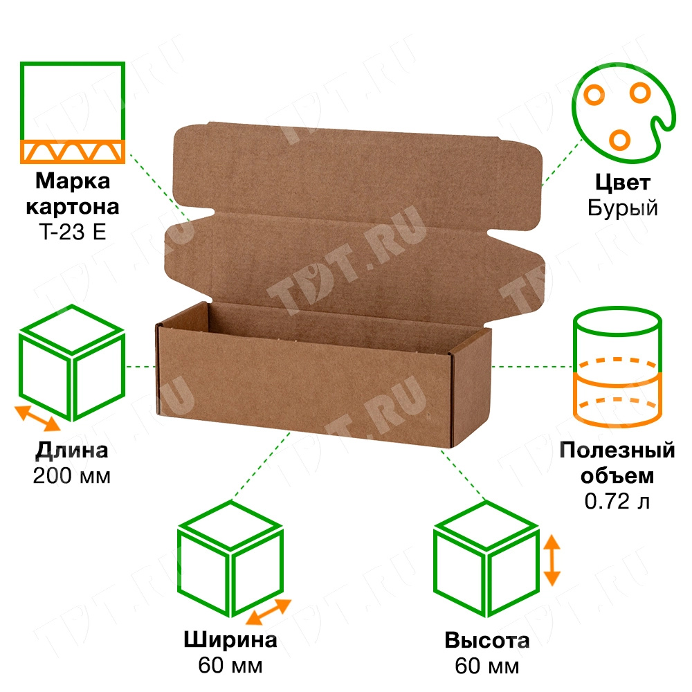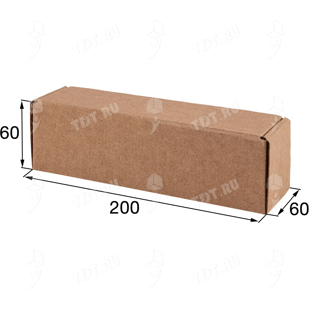 Короб «Тубус» бурый, длиной 200 мм, шириной 60 мм и высотой 60 мм. Изготовлен из трёхслойного картона Т-23 Е. Полезный объём — 0.72 л.