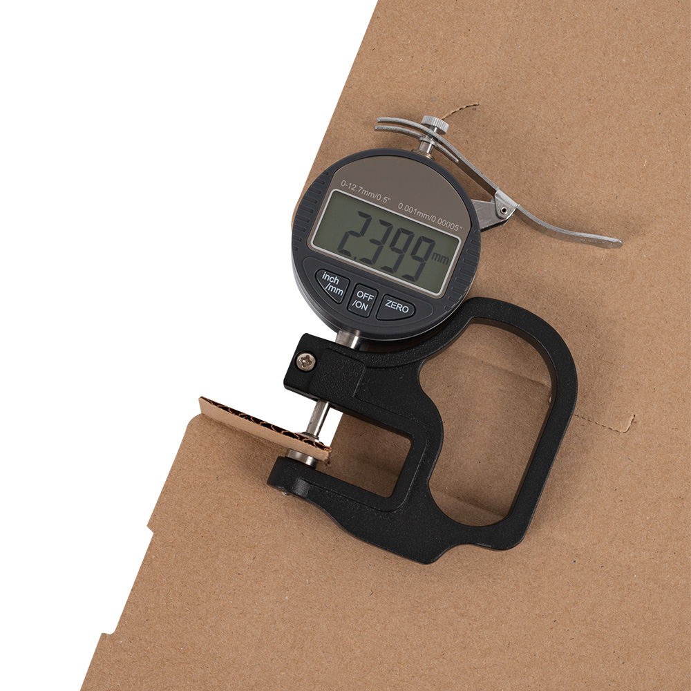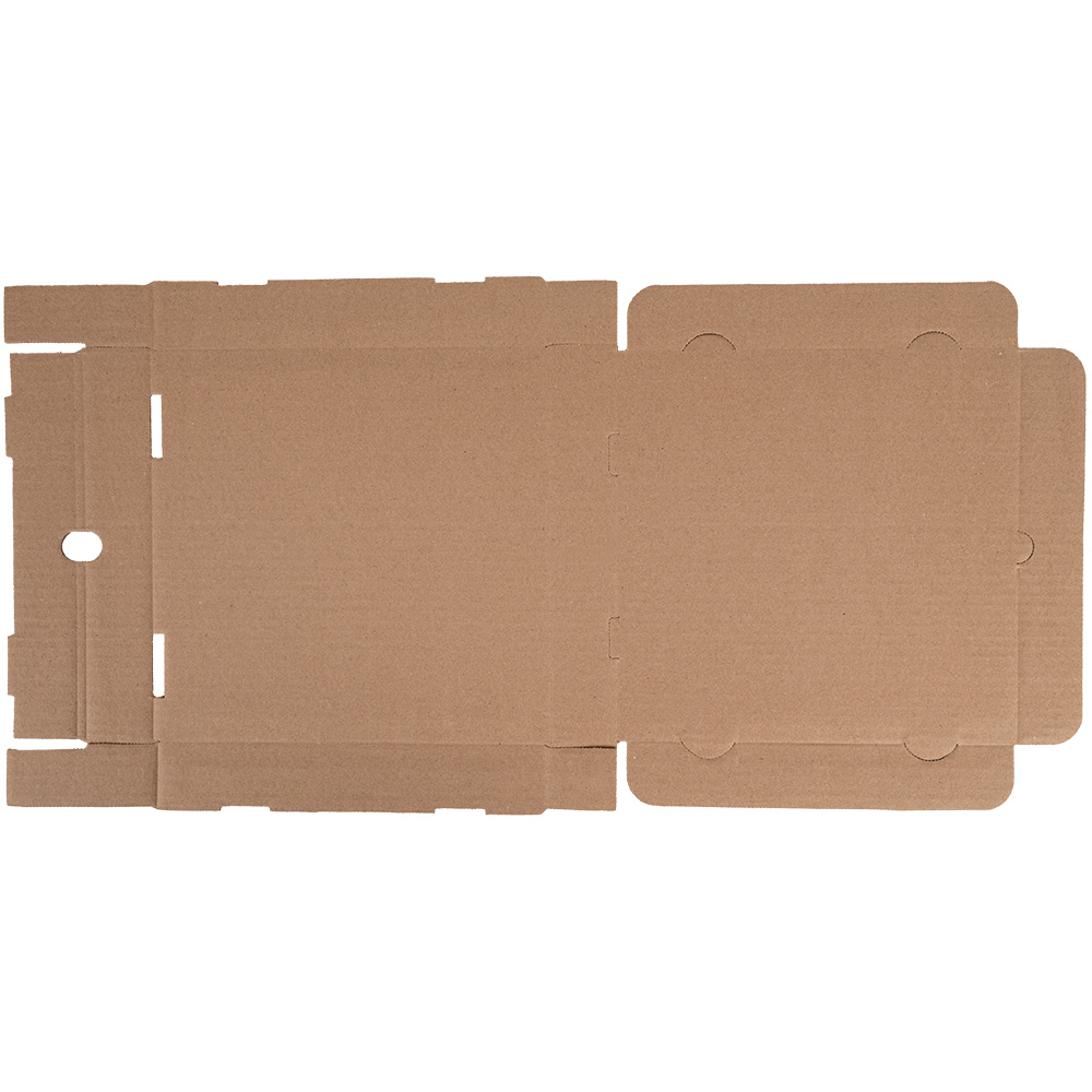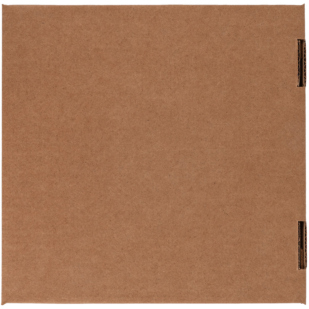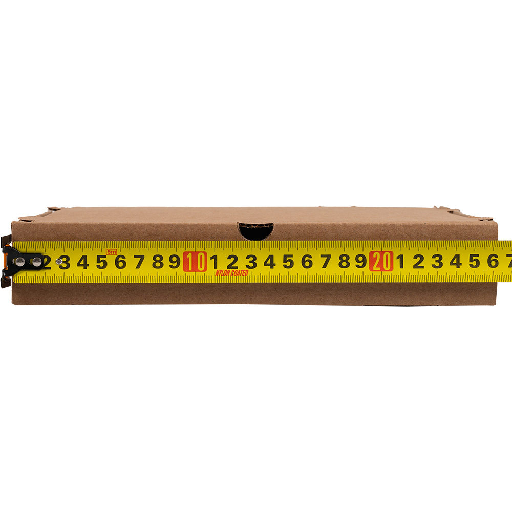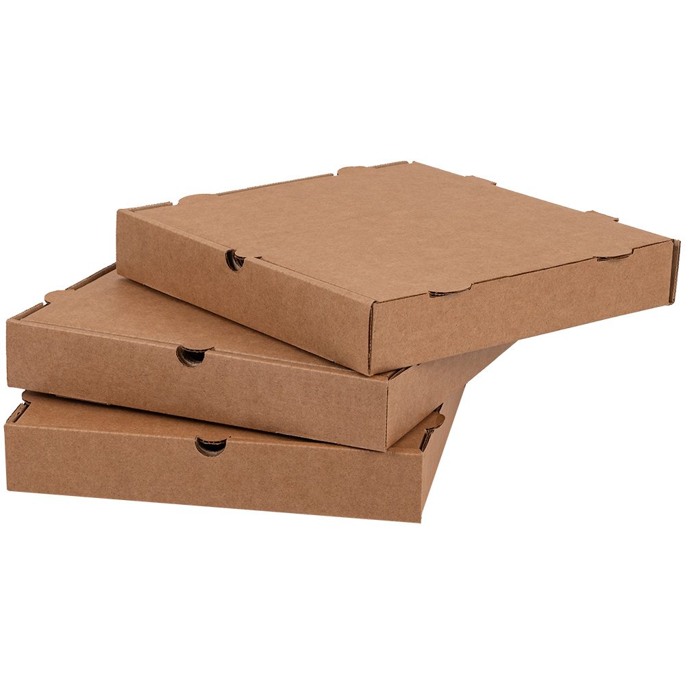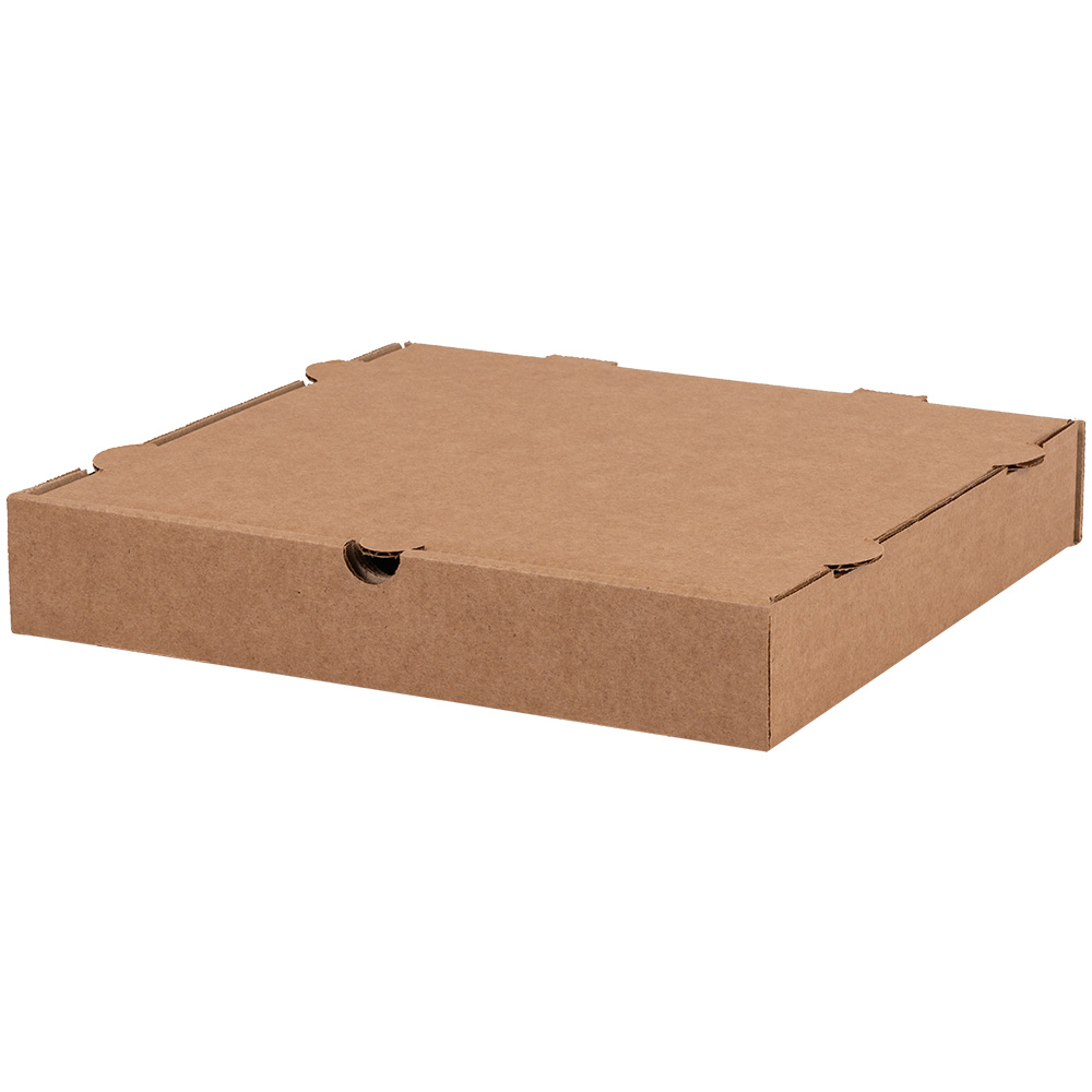 Бурая коробка для пиццы, длиной 250 мм, шириной 250 мм и высотой 40 мм. Изготовлена из трехслойного картона марки Т-23. Полезный объём — 2.5 л. Производится в России.