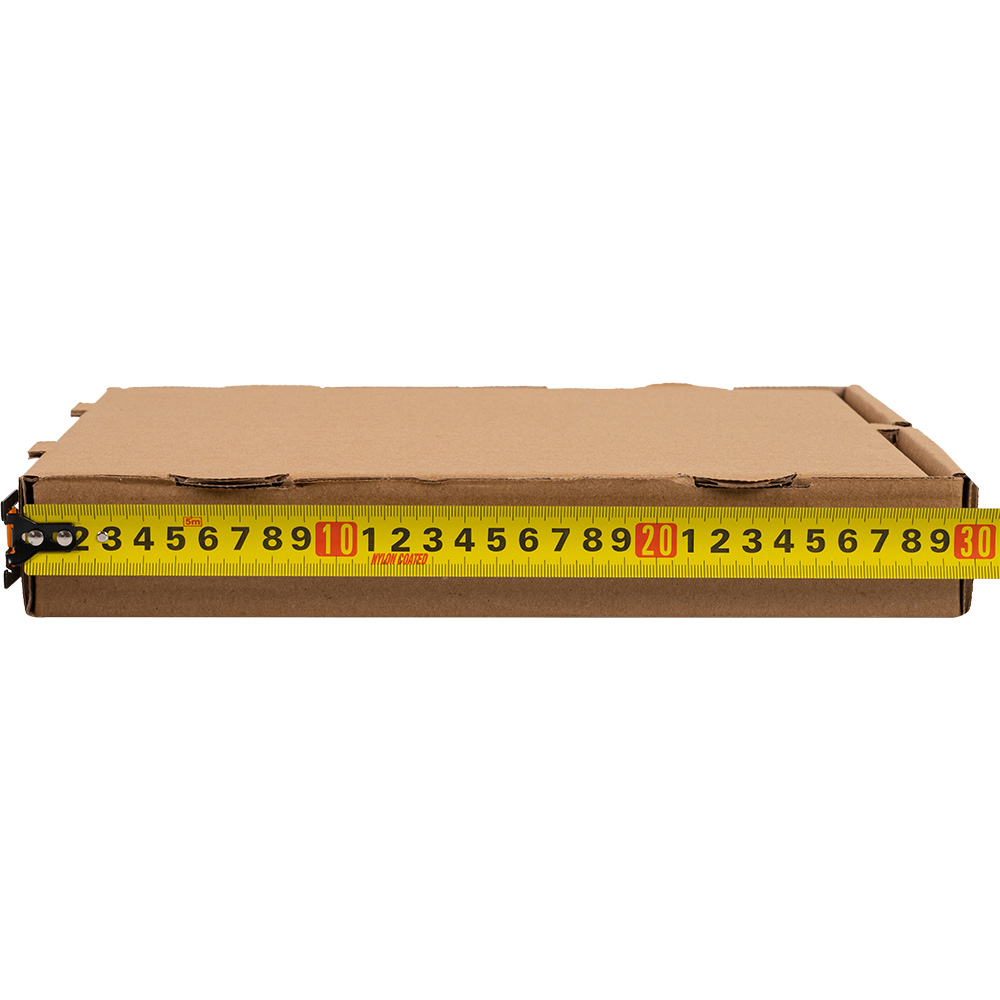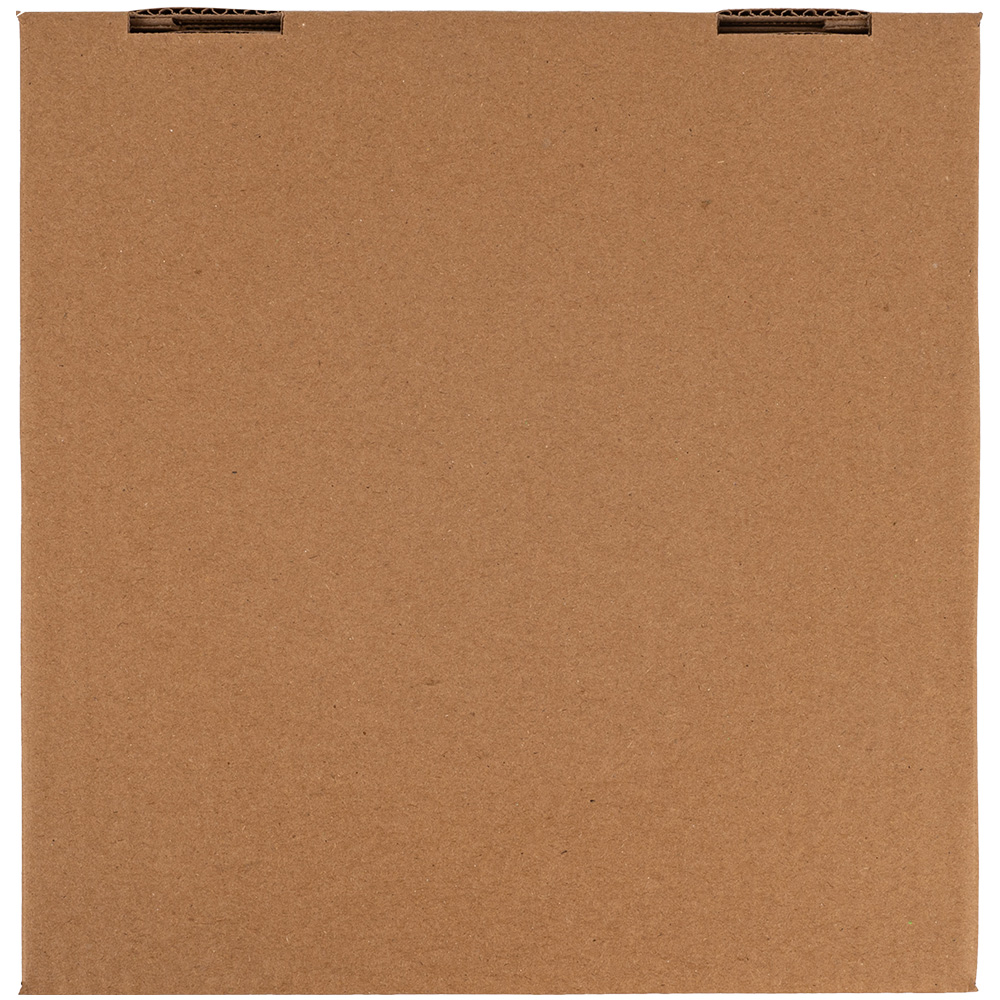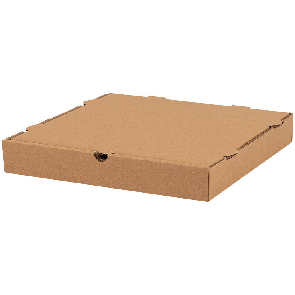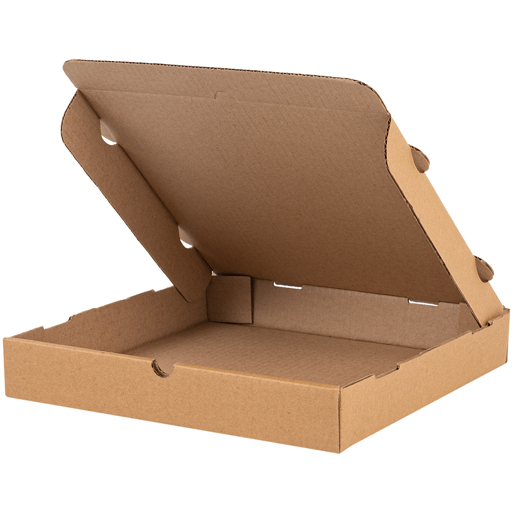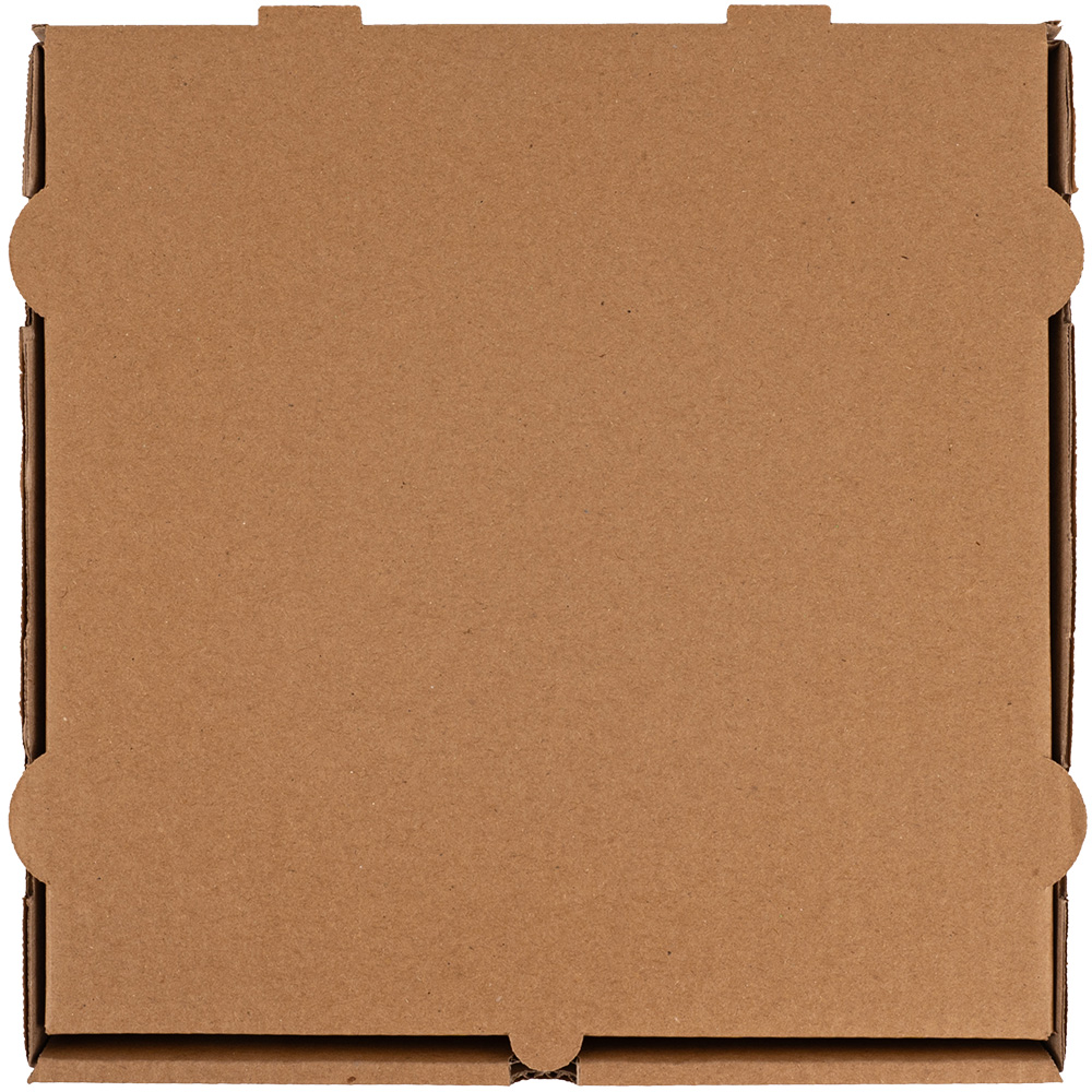 Бурая коробка для пиццы, длиной 280 мм, шириной 280 мм и высотой 40 мм. Изготовлена из трехслойного картона марки Т-23. Полезный объём — 3.14 л. Производится в России.