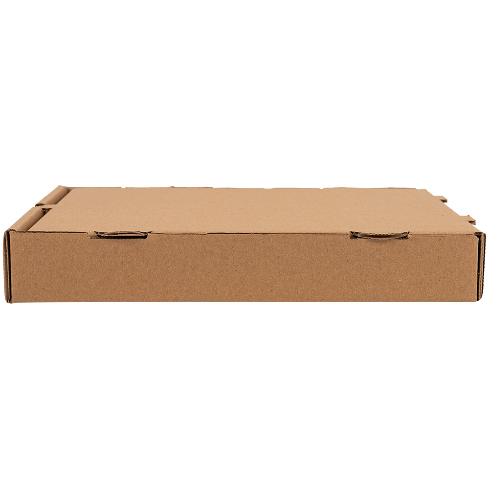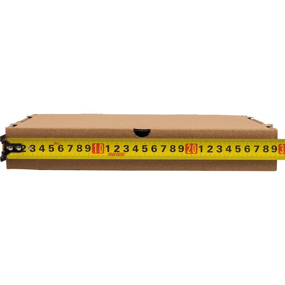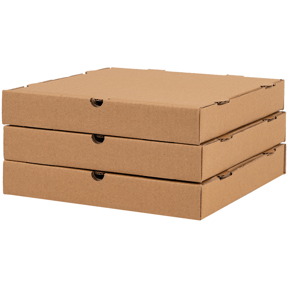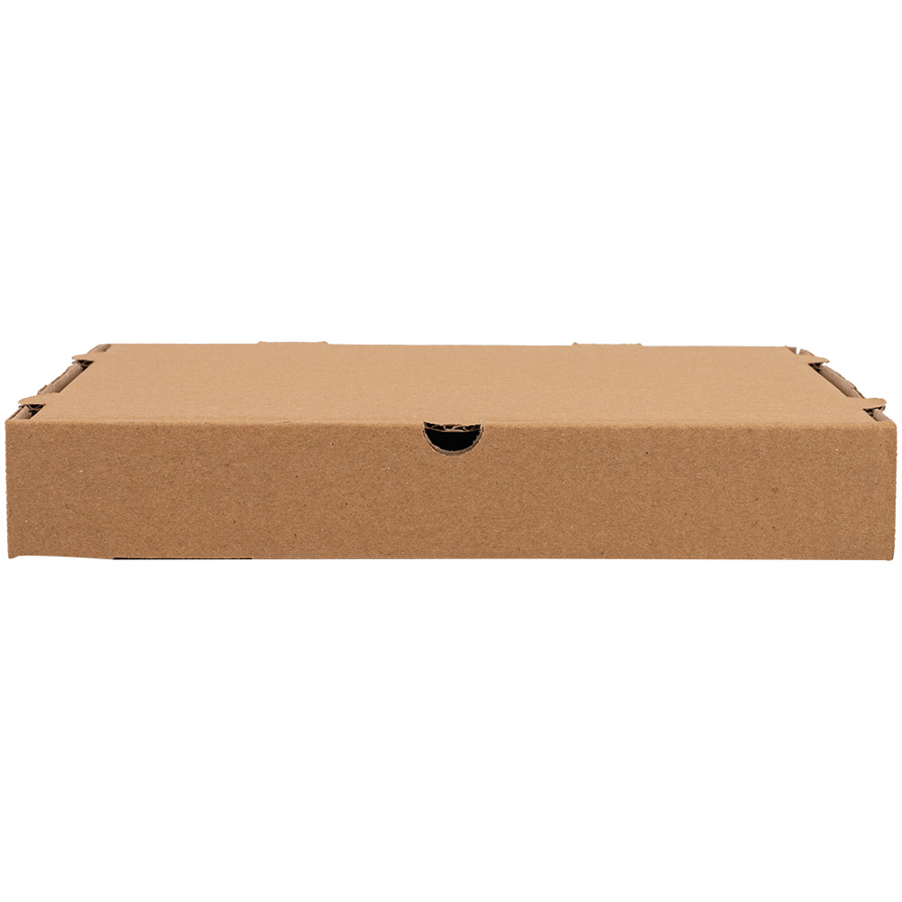 Бурая коробка для пиццы, длиной 280 мм, шириной 280 мм и высотой 40 мм. Изготовлена из трехслойного картона марки Т-23. Полезный объём — 3.14 л. Производится в России.