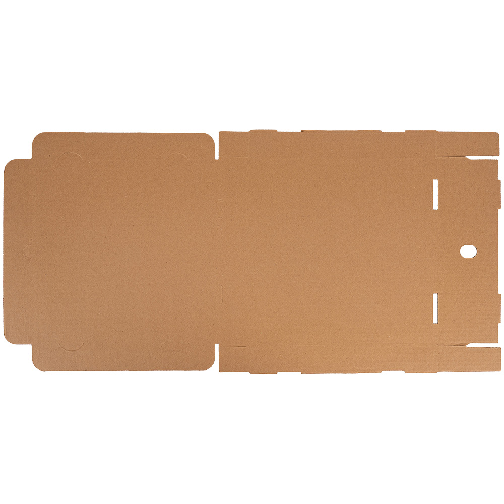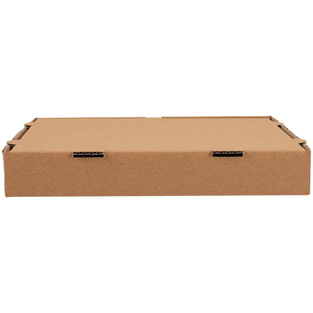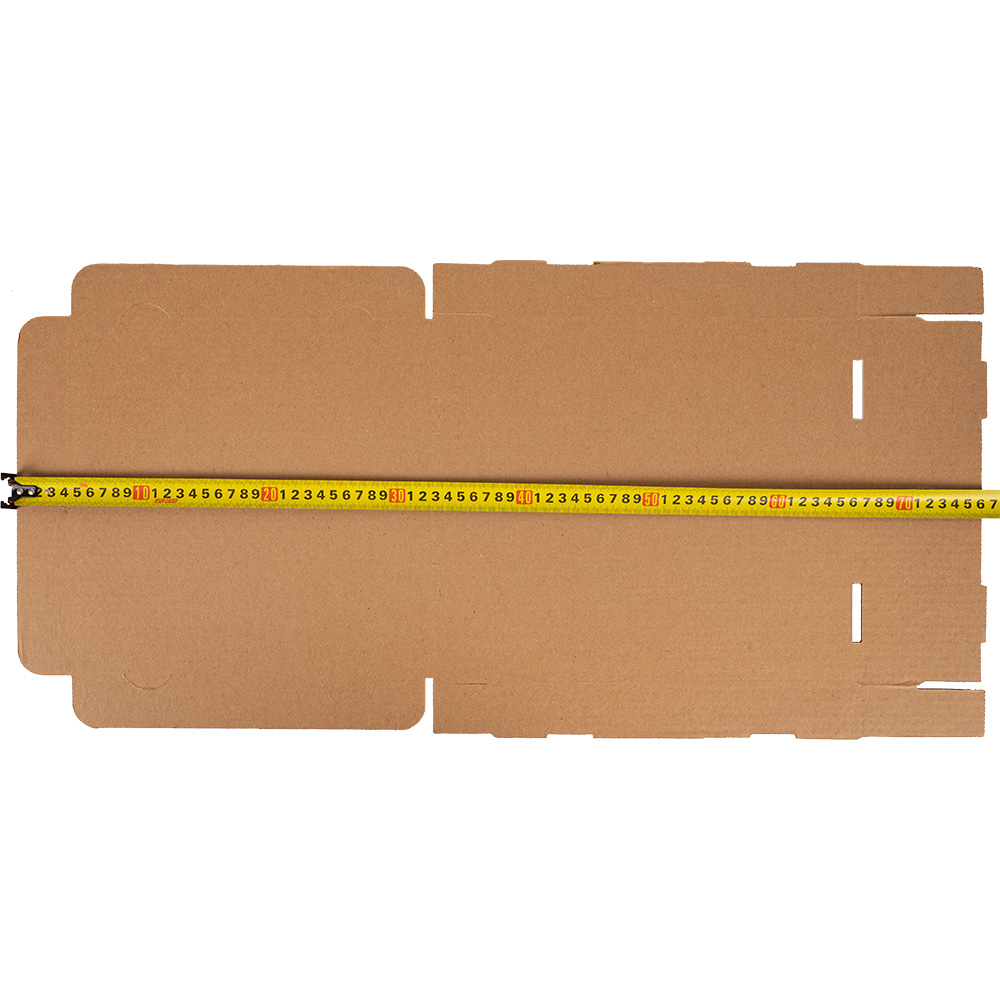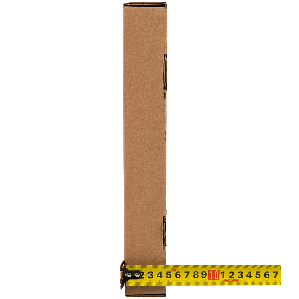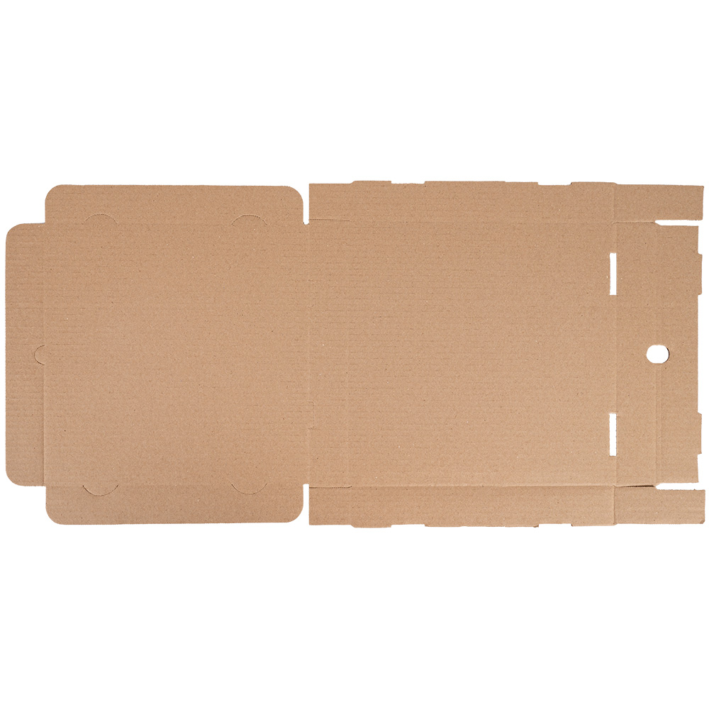 Бурая коробка для пиццы, длиной 280 мм, шириной 280 мм и высотой 40 мм. Изготовлена из трехслойного картона марки Т-23. Полезный объём — 3.14 л. Производится в России.