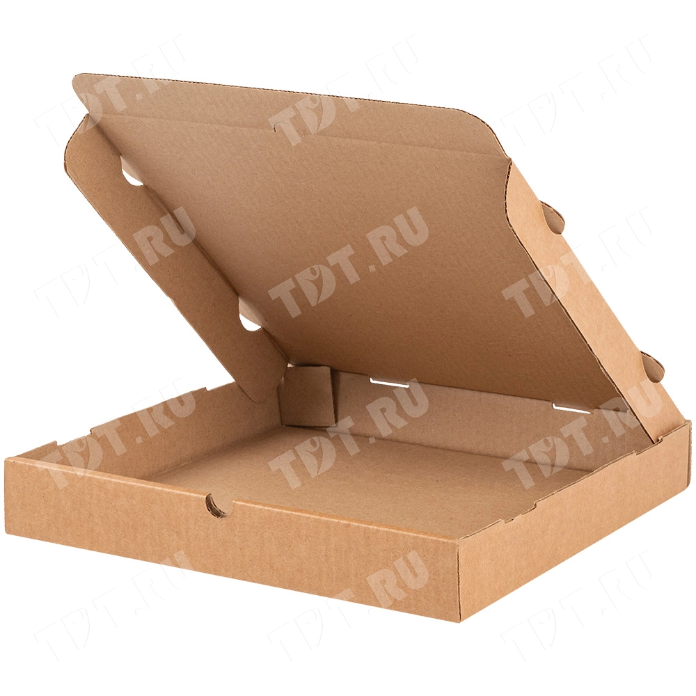 Бурая коробка для пиццы, длиной 310 мм, шириной 310 мм и высотой 33 мм. Изготовлена из трехслойного картона марки Т-23. Полезный объём — 3.17 л. Производится в России.