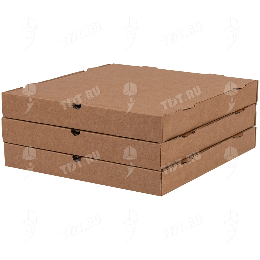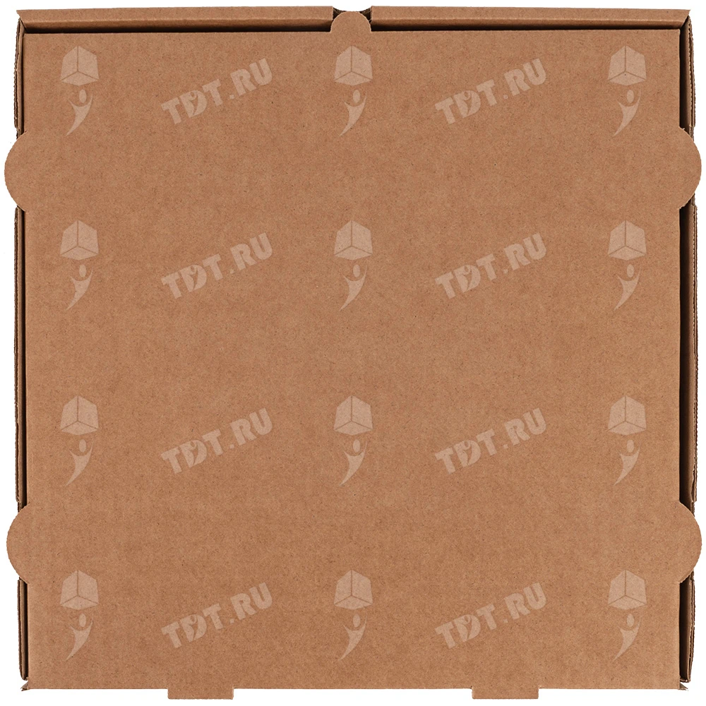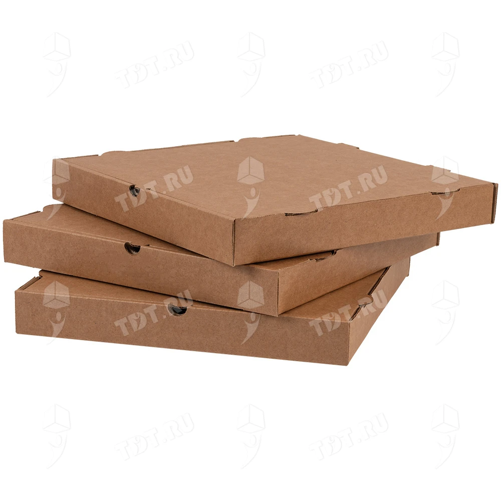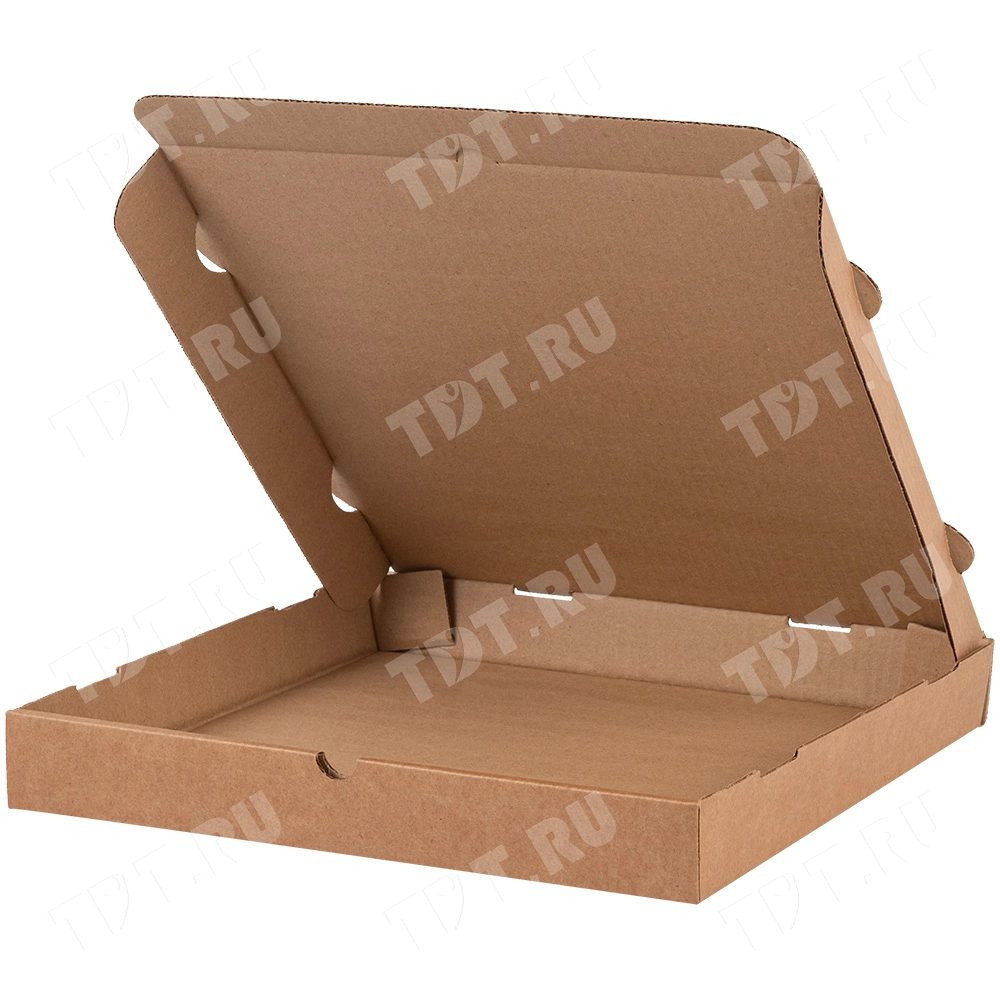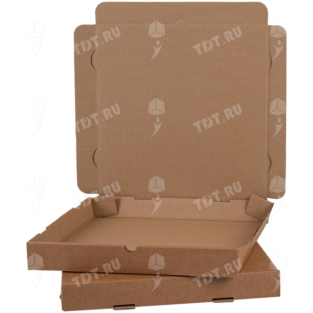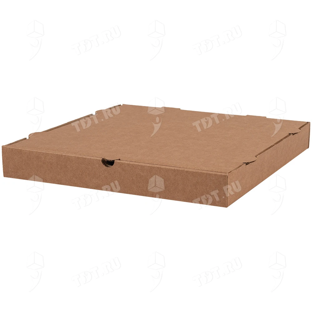 Бурая коробка для пиццы, длиной 330 мм, шириной 330 мм и высотой 40 мм. Изготовлена из трехслойного картона марки Т-23. Полезный объём — 4.36 л. Производится в России.