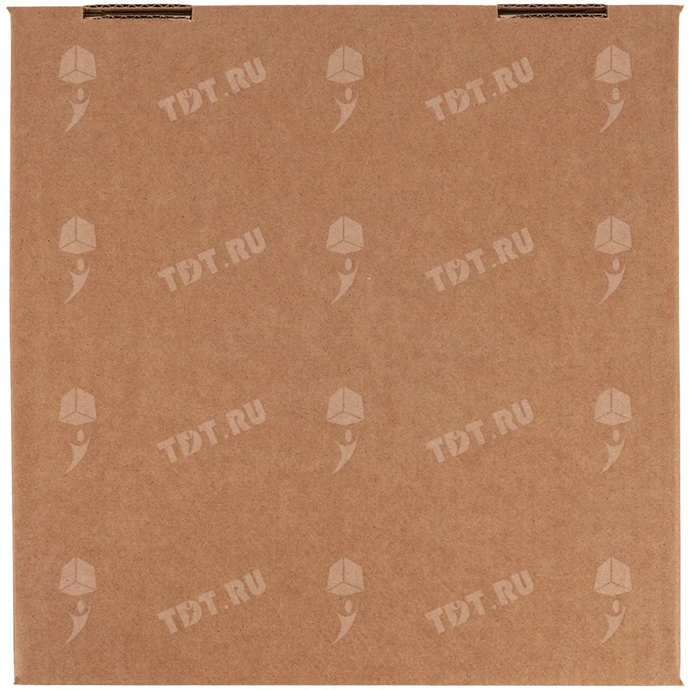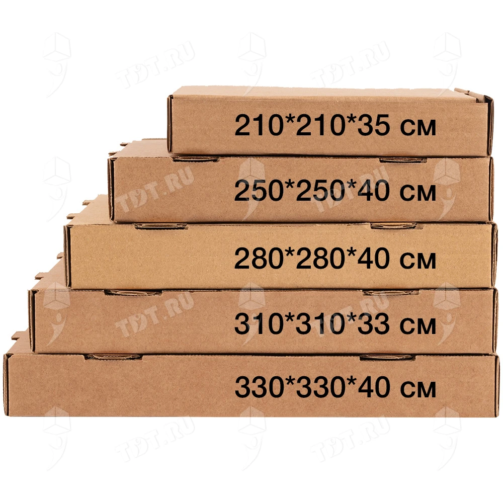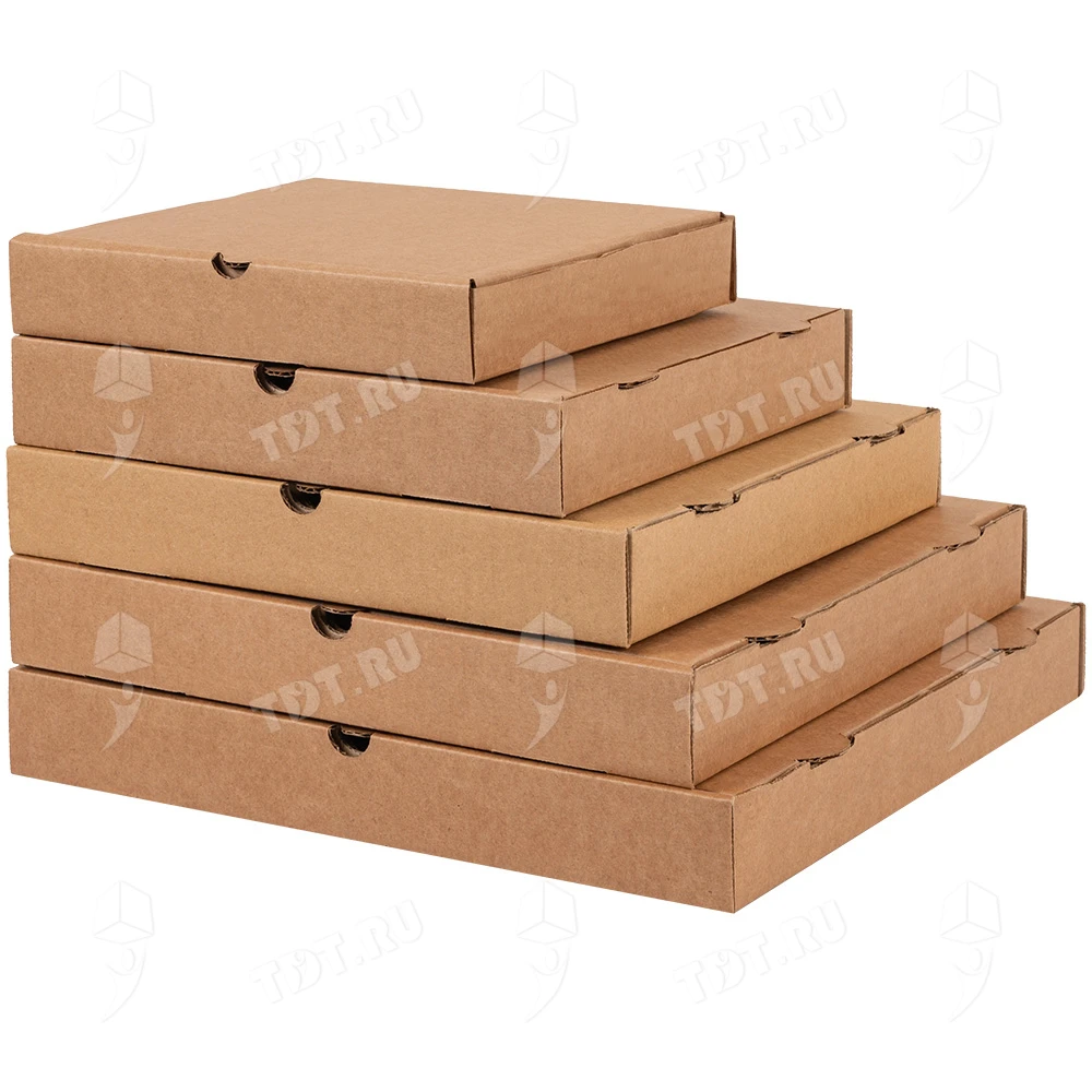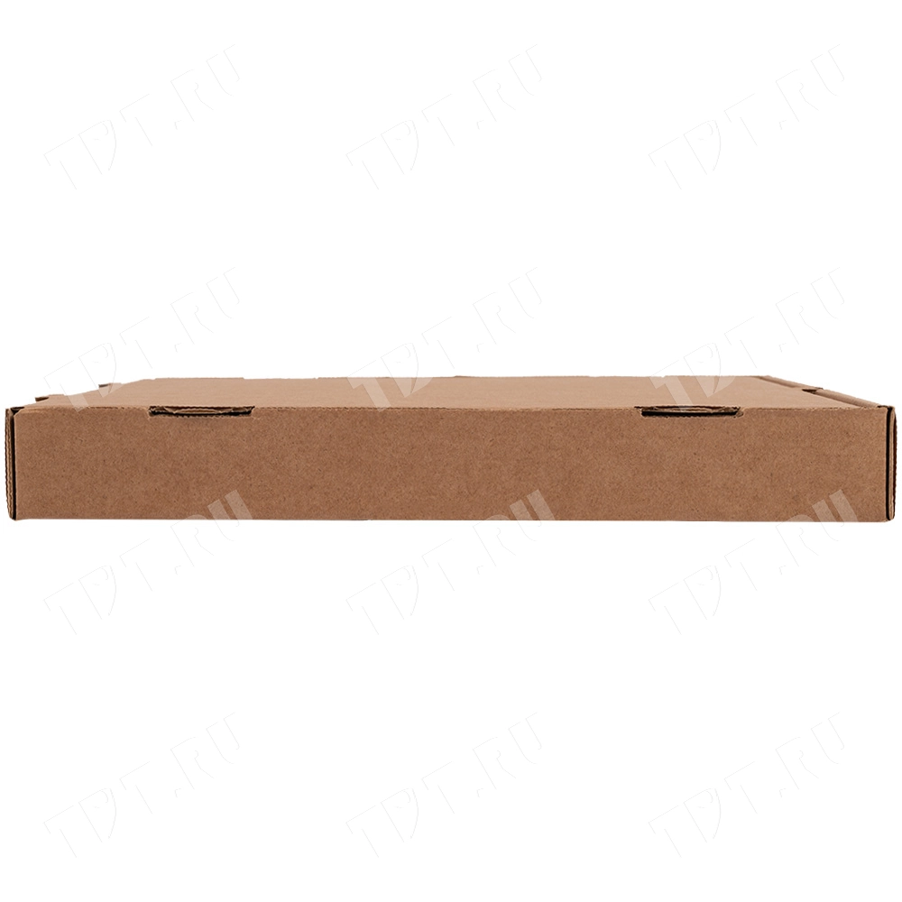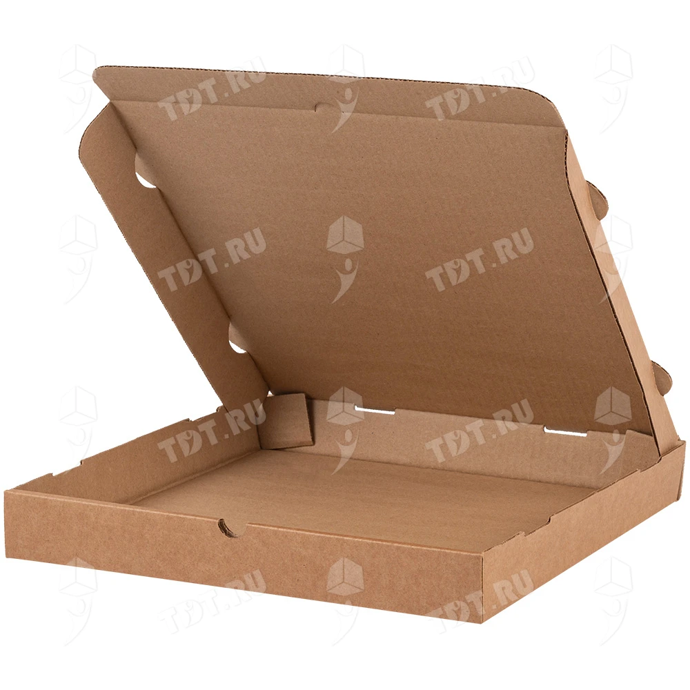 Бурая коробка для пиццы, длиной 330 мм, шириной 330 мм и высотой 40 мм. Изготовлена из трехслойного картона марки Т-23. Полезный объём — 4.36 л. Производится в России.