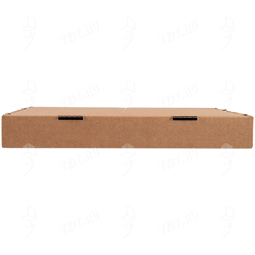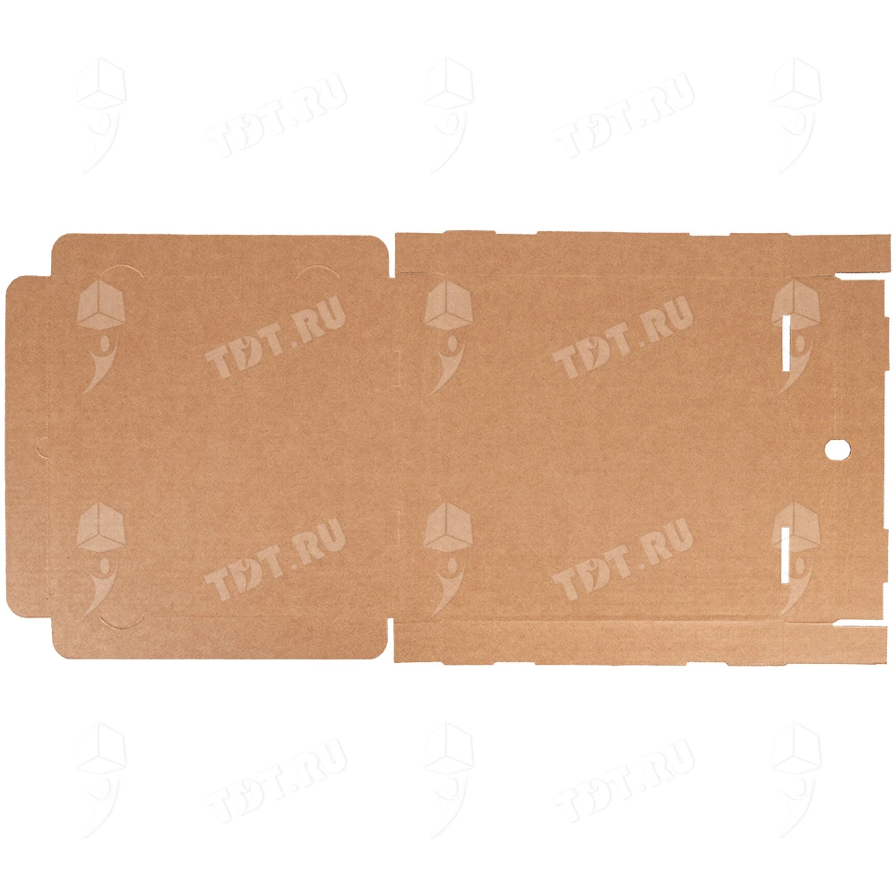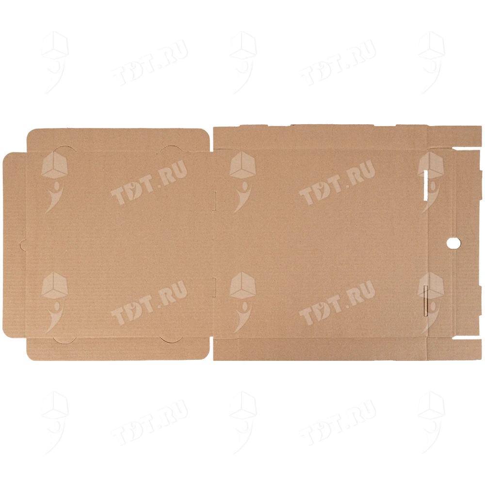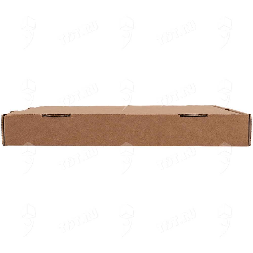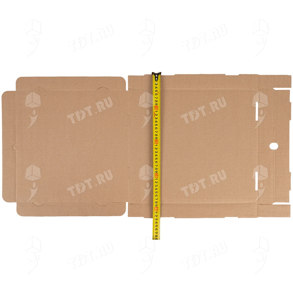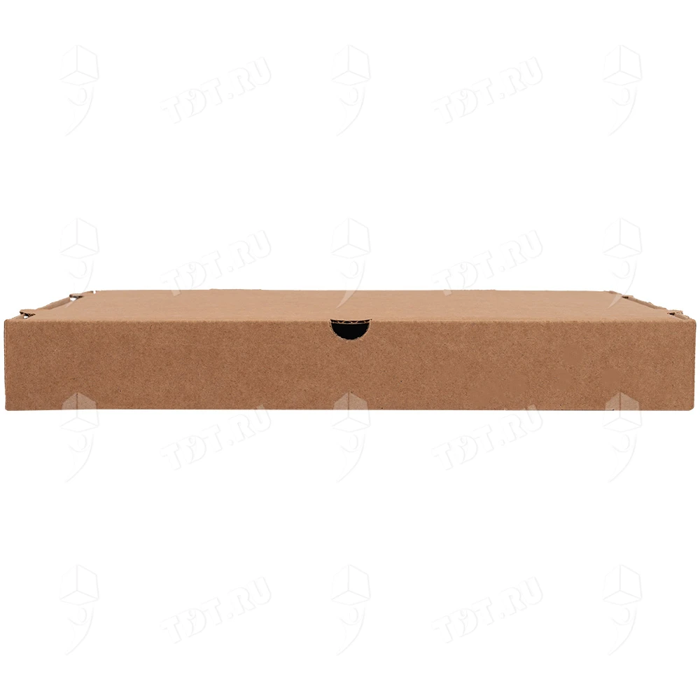 Бурая коробка для пиццы, длиной 330 мм, шириной 330 мм и высотой 40 мм. Изготовлена из трехслойного картона марки Т-23. Полезный объём — 4.36 л. Производится в России.