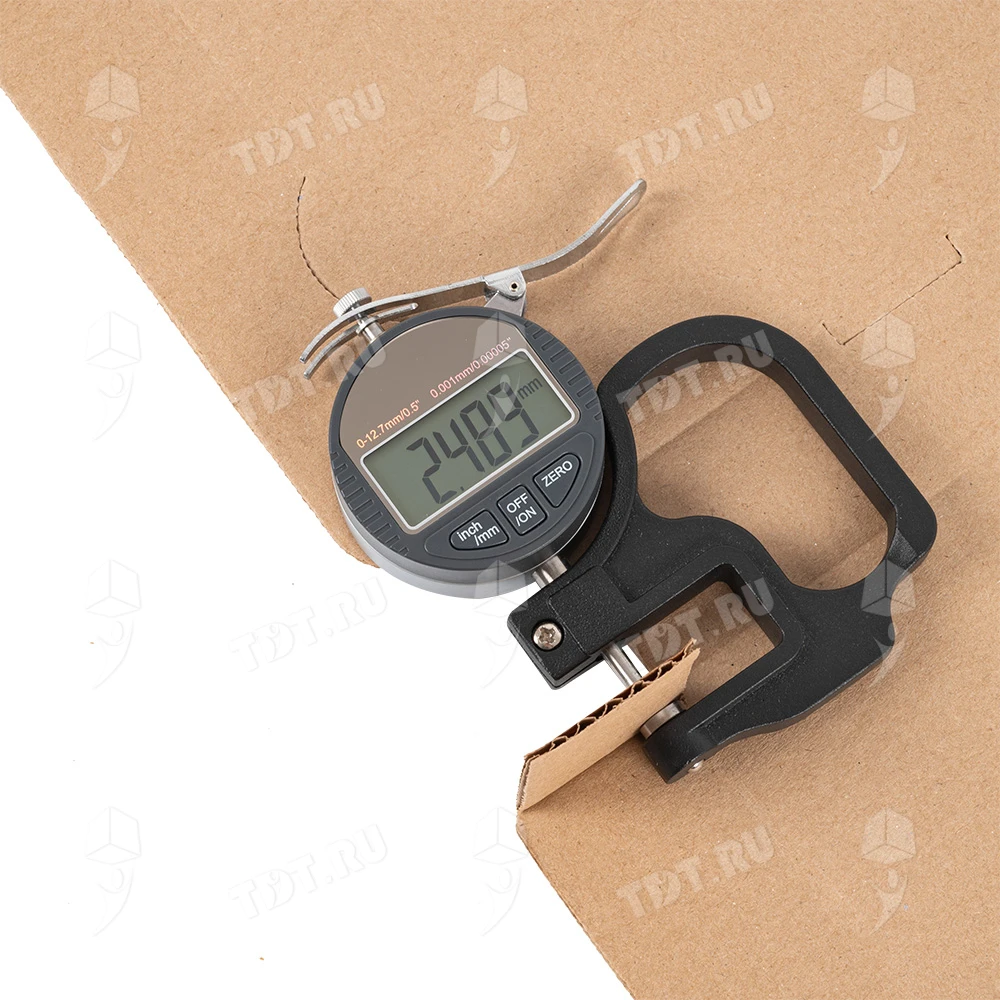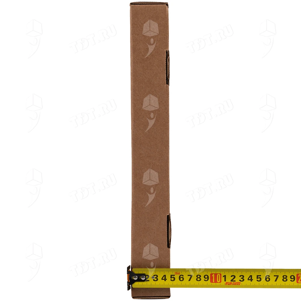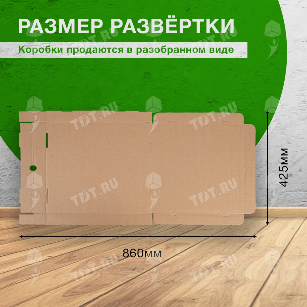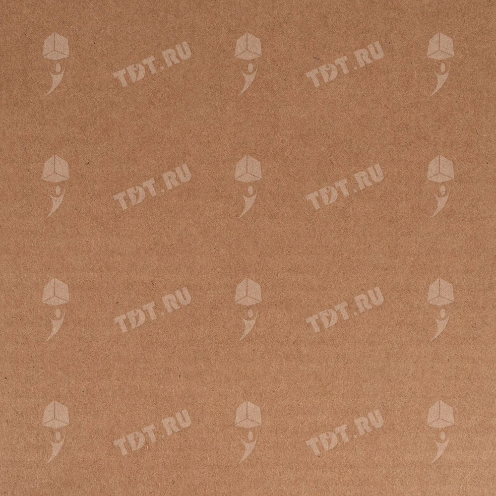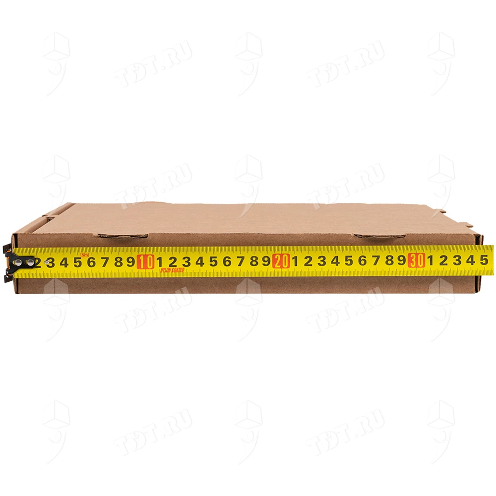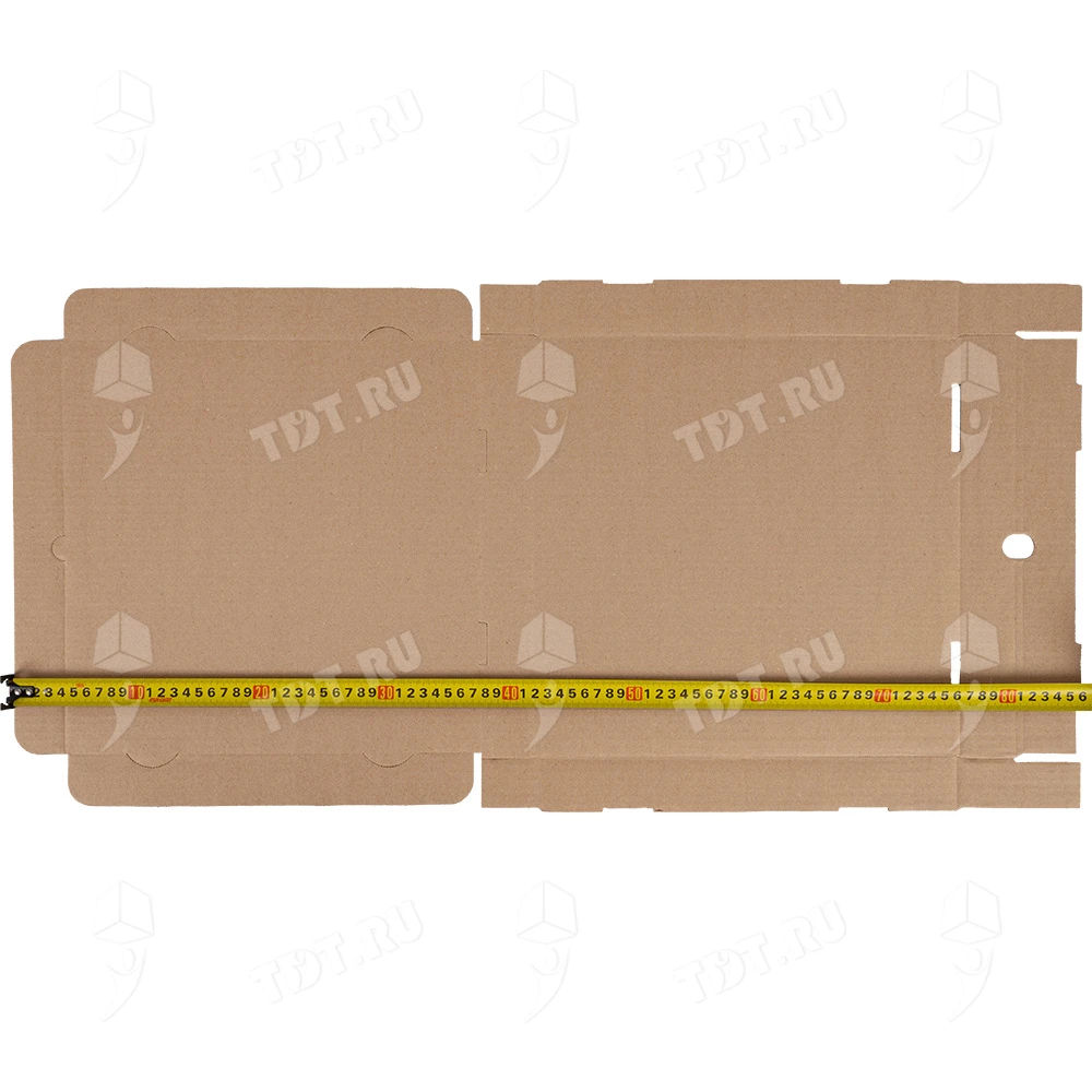 Бурая коробка для пиццы, длиной 330 мм, шириной 330 мм и высотой 40 мм. Изготовлена из трехслойного картона марки Т-23. Полезный объём — 4.36 л. Производится в России.