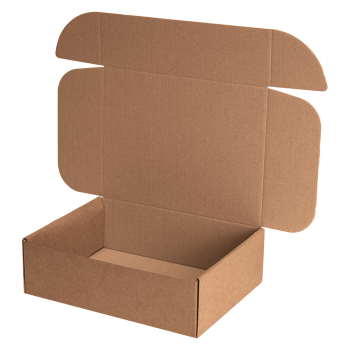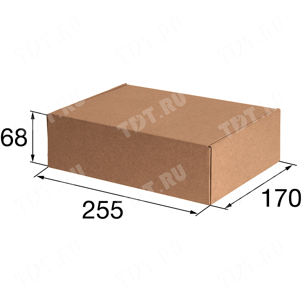 Самосборный короб №143, бурого цвета, длиной 255 мм, шириной 170 мм и высотой 68 мм. Изготовлен из микрогофрокартона Т-22К Е. Полезный объём — 2.95 л.