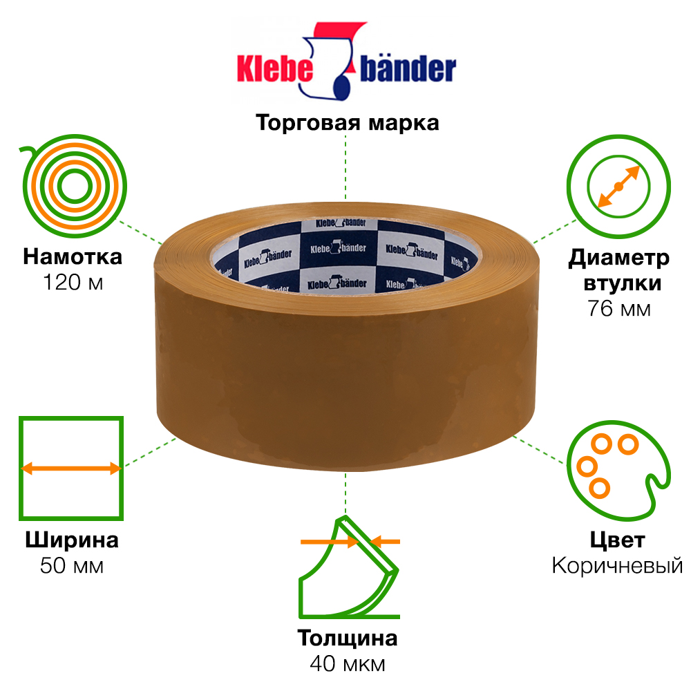 Клейкая лента Klebebander коричневая шириной 50 мм, диаметром втулки 76 мм, намоткой 120 метра, толщиной 40 мкм для ручной упаковки. Изготовлена на основе биосноориентированного полипропилена.