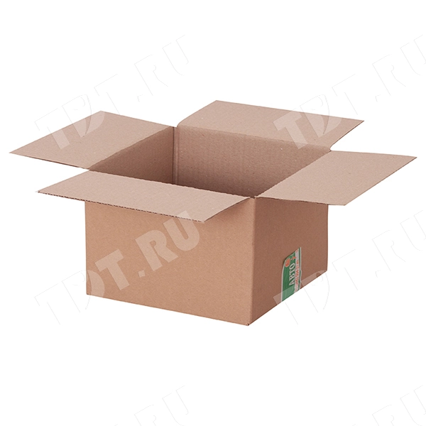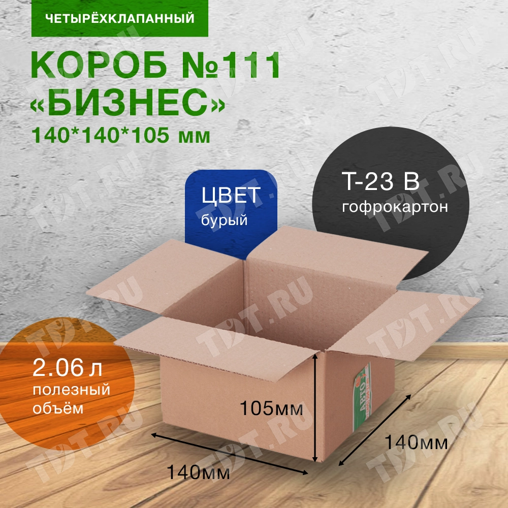 Короб №111 «Бизнес» бурого цвета, длиной 140 мм, шириной 140 мм и высотой 105 мм. Изготовлен из трехслойного картона марки Т-23 В. Полезный объём — 2.06 л.