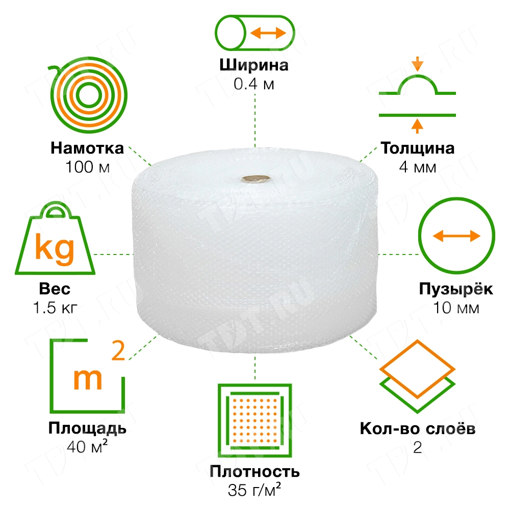 Прозрачная двухслойная воздушно-пузырчатая пленка «Оптима компакт», намоткой 100 м, шириной рулона 0.4 м, диаметром пузырька 10 мм, плотностью 35 г/м². Изготовлена из полиэтилена. Производится в России.