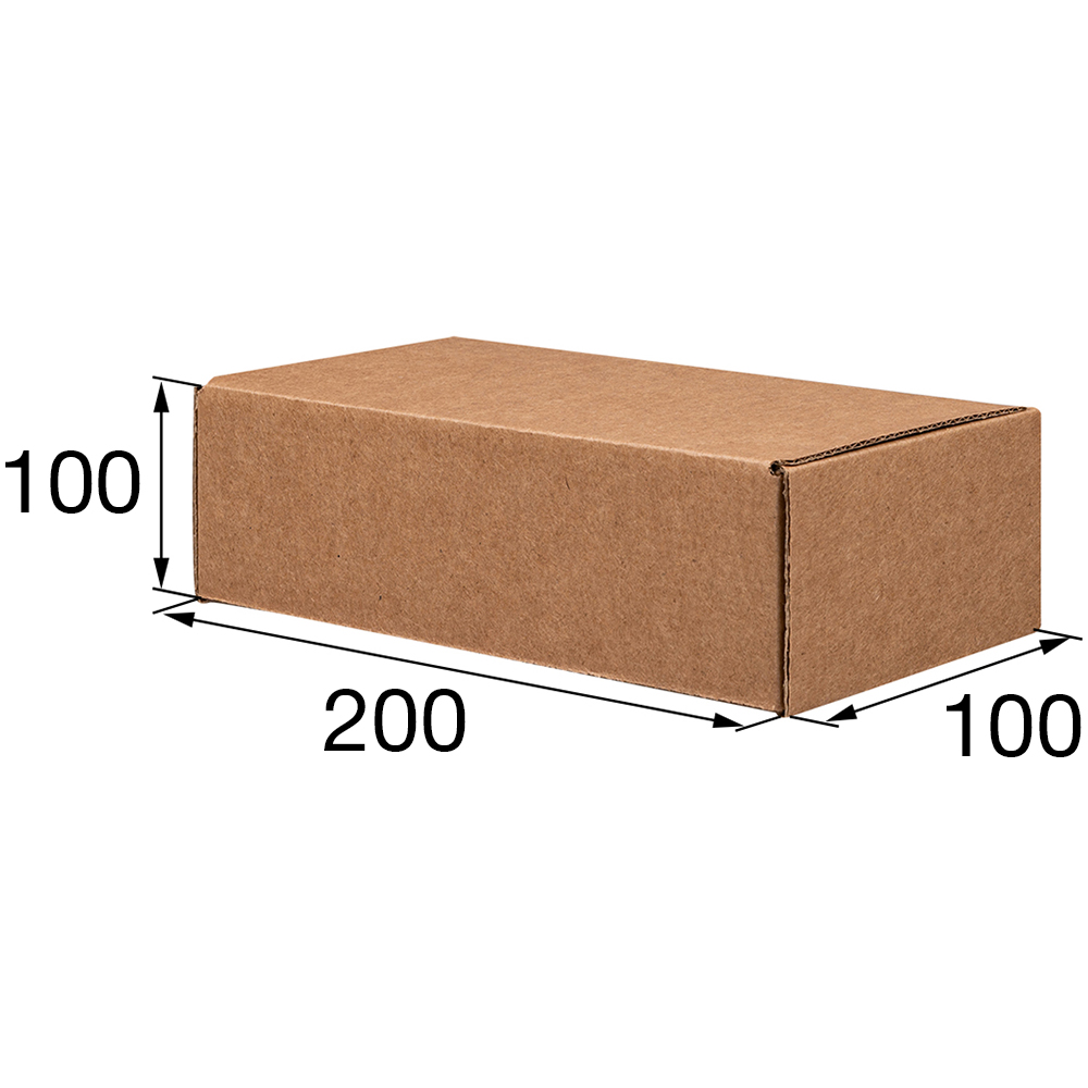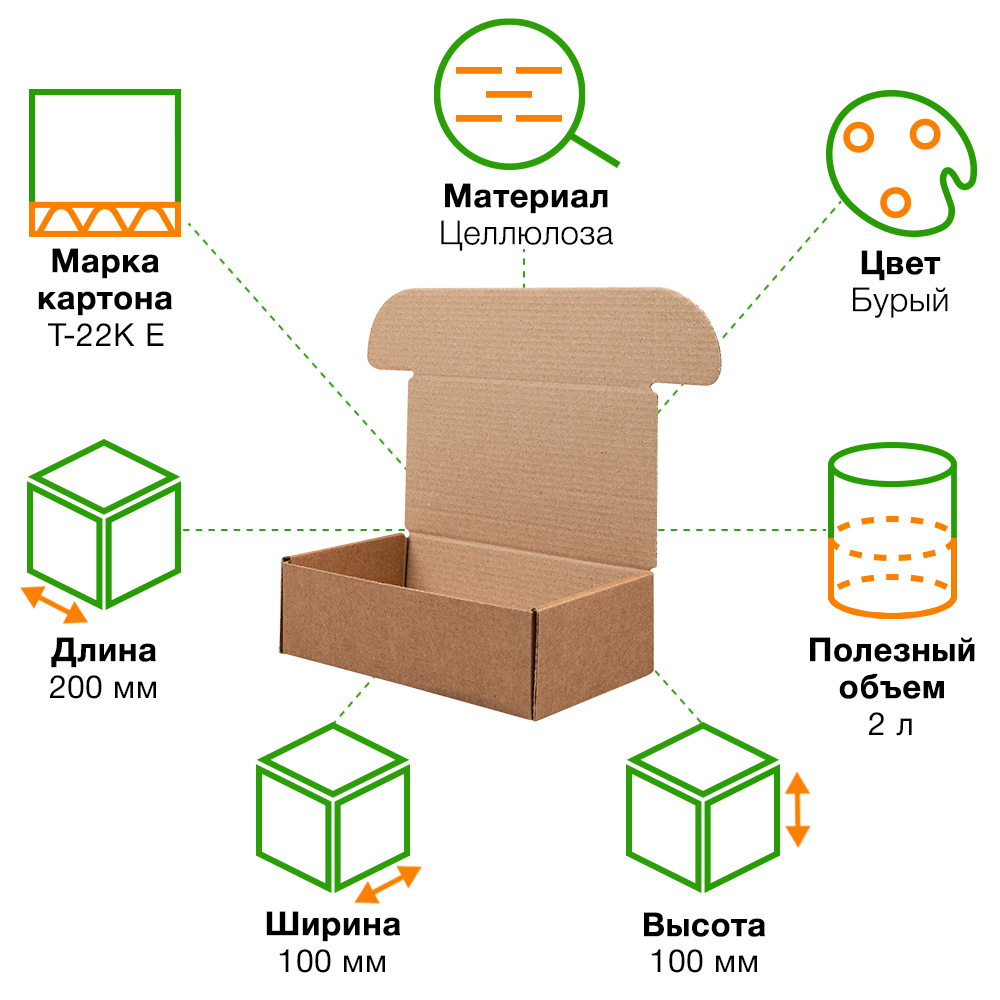 Самосборный короб №114 бурого цвета, длиной 200 мм, шириной 100 мм и высотой 100 мм. Изготовлен из микрогофрокартона Т-22К Е. Полезный объём — 2 л.