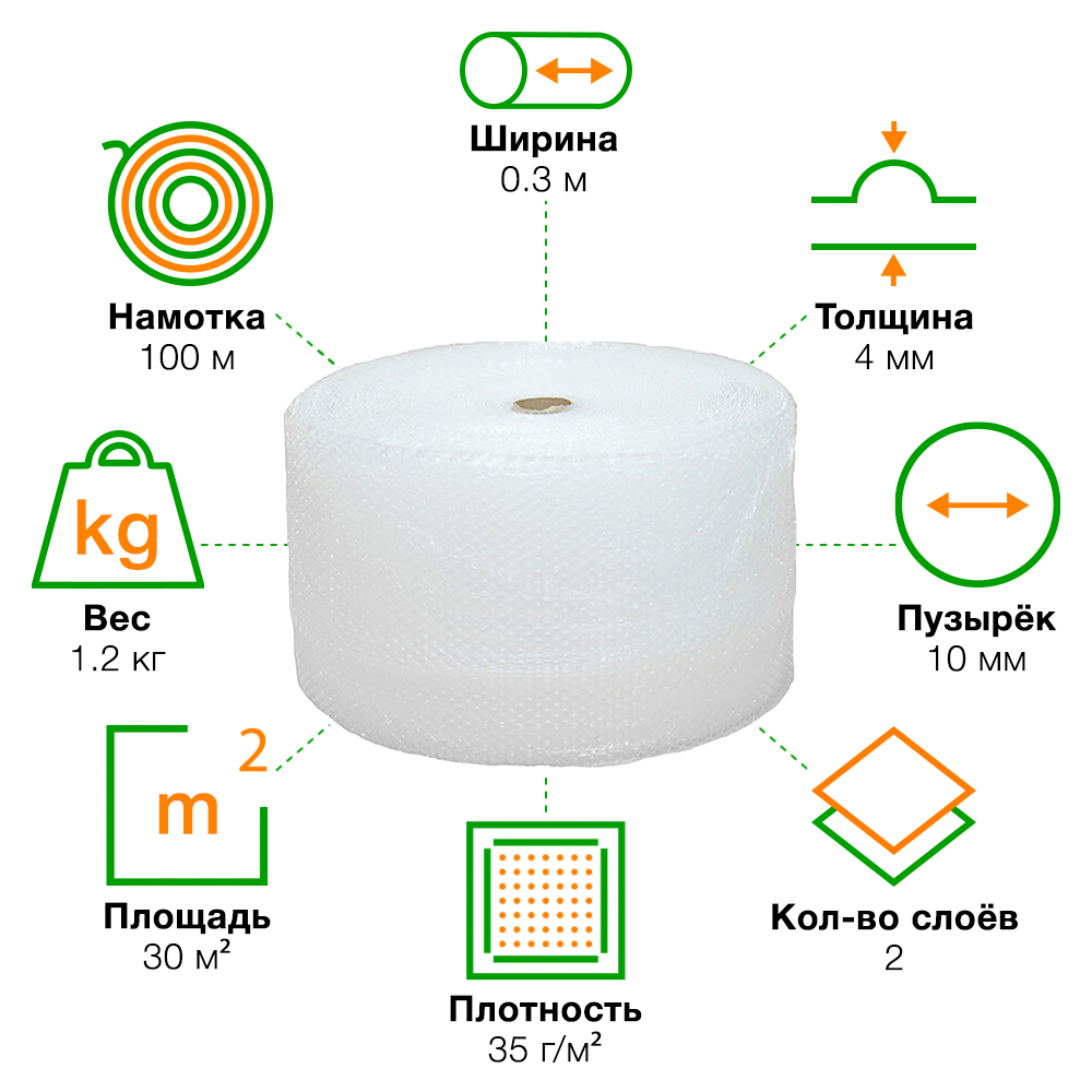 Прозрачная двухслойная воздушно-пузырчатая пленка «Оптима компакт», намоткой 100 м, шириной рулона 0.3 м, диаметром пузырька 10 мм, плотностью 35 г/м². Изготовлена из полиэтилена. Производится в России.
