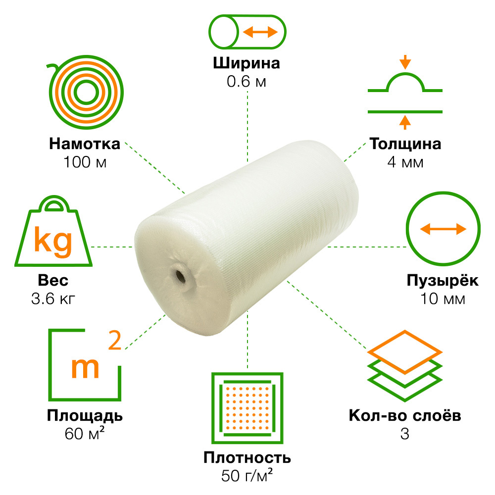 Прозрачная трёхслойная воздушно-пузырчатая пленка «Оптима компакт», намоткой 100 м, шириной рулона 0.6 м, диаметром пузырька 10 мм, плотностью 50 г/м². Изготовлена из полиэтилена. Производится в России.