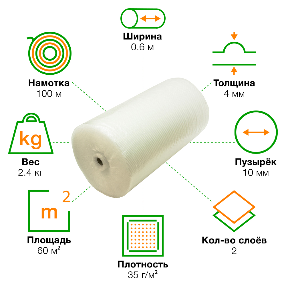 Прозрачная двухслойная воздушно-пузырчатая пленка «Оптима компакт», намоткой 100 м, шириной рулона 0.6 м, диаметром пузырька 10 мм, плотностью 35 г/м². Изготовлена из полиэтилена. Производится в России.