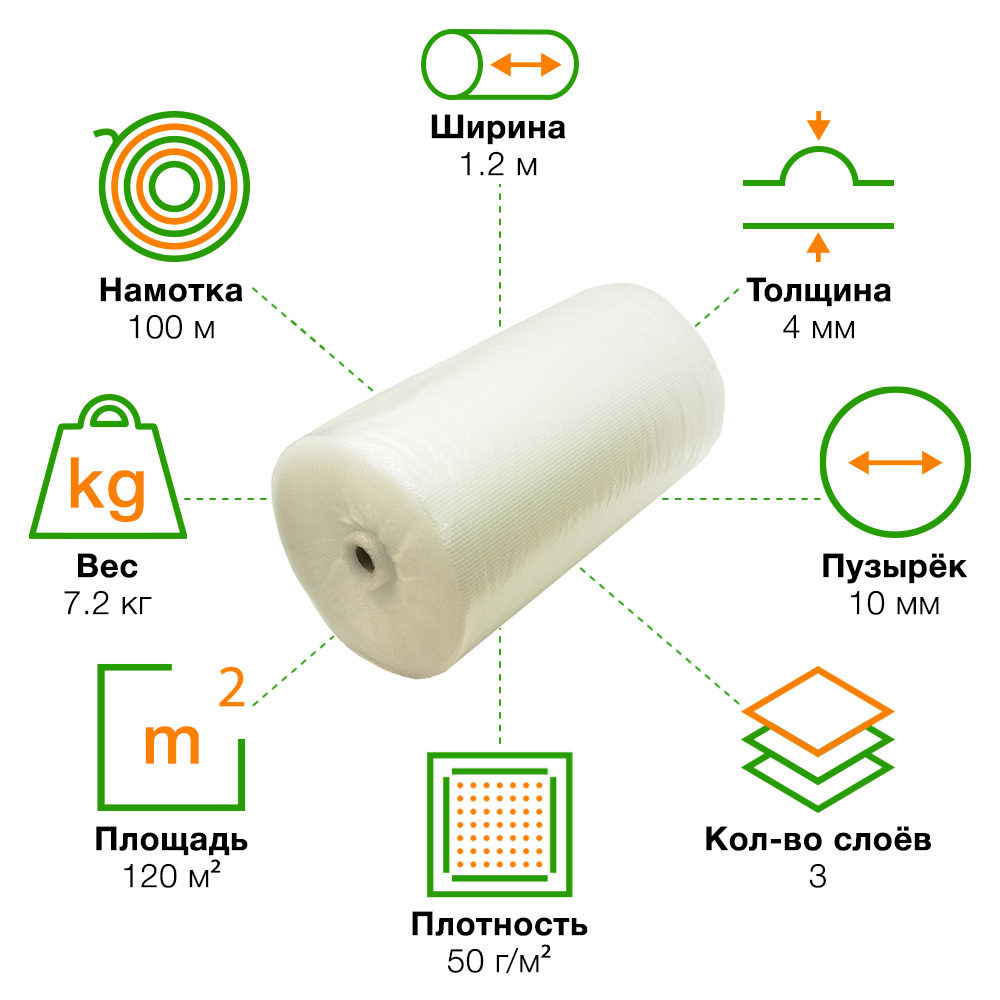 Прозрачная трёхслойная воздушно-пузырчатая пленка «Оптима», намоткой 100 м, шириной рулона 1.2 м, диаметром пузырька 10 мм, плотностью 50 г/м². Изготовлена из полиэтилена. Производится в России.