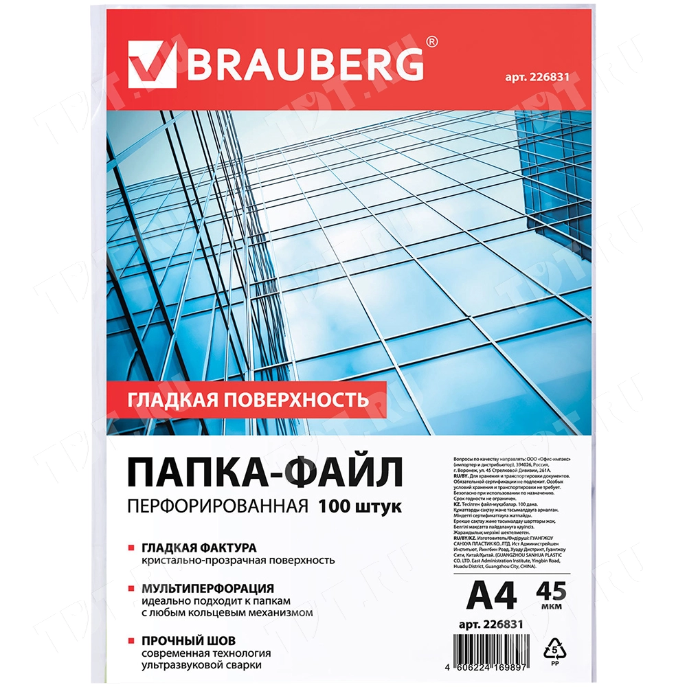 Папки-файлы с перфорацией BRAUBERG «STANDARD», формата А4, толщиной 45 мкм, прозрачного цвета, код производителя 226831, в упаковке по 100 штук. Производятся в России.