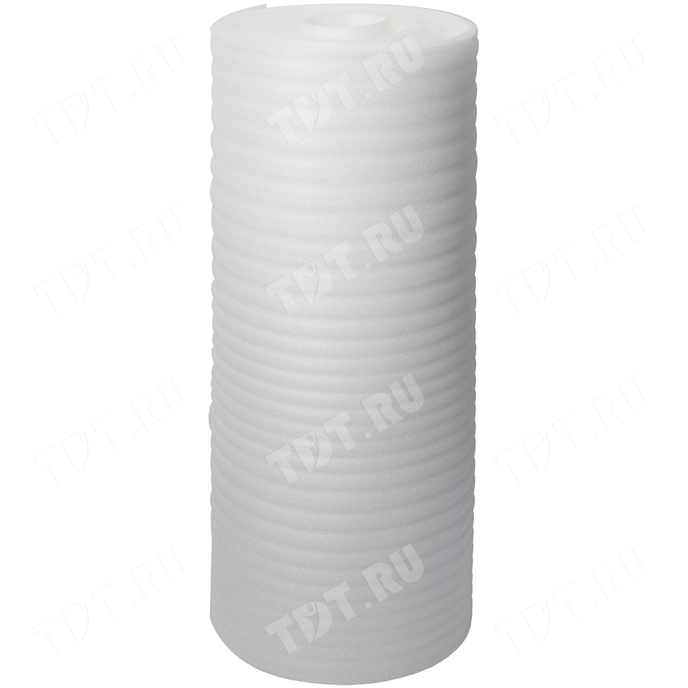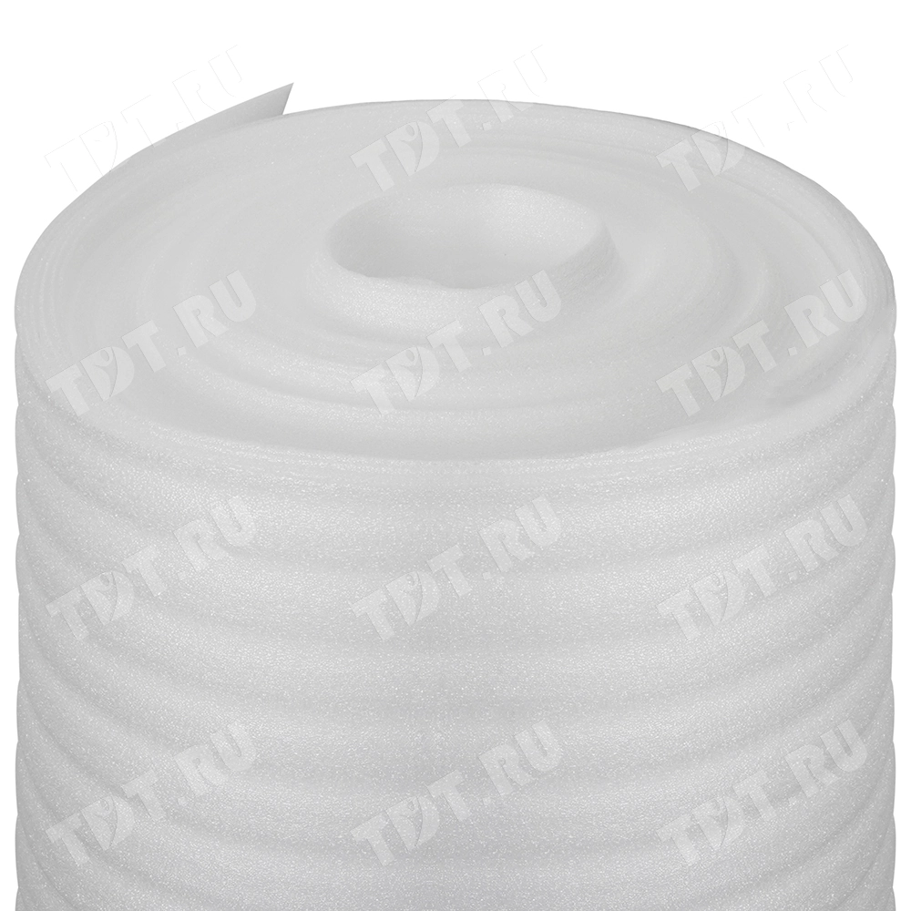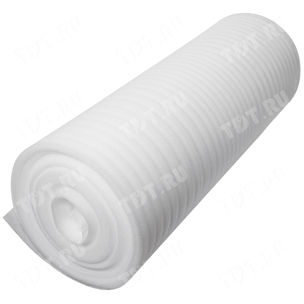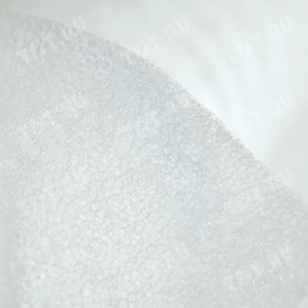 Вспененный полиэтилен, белого цвета, намоткой 50 м, толщиной 5 мм, шириной 1 м, площадью 50 м². Производится в России.