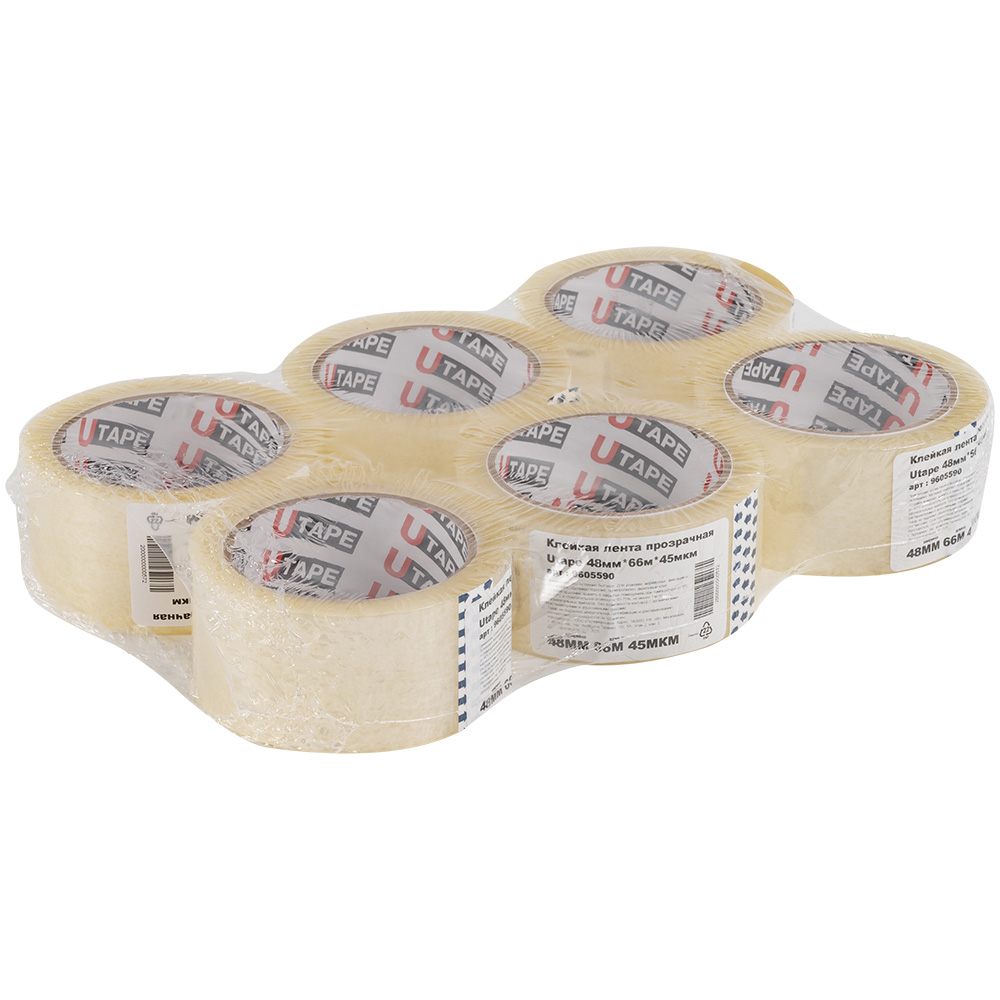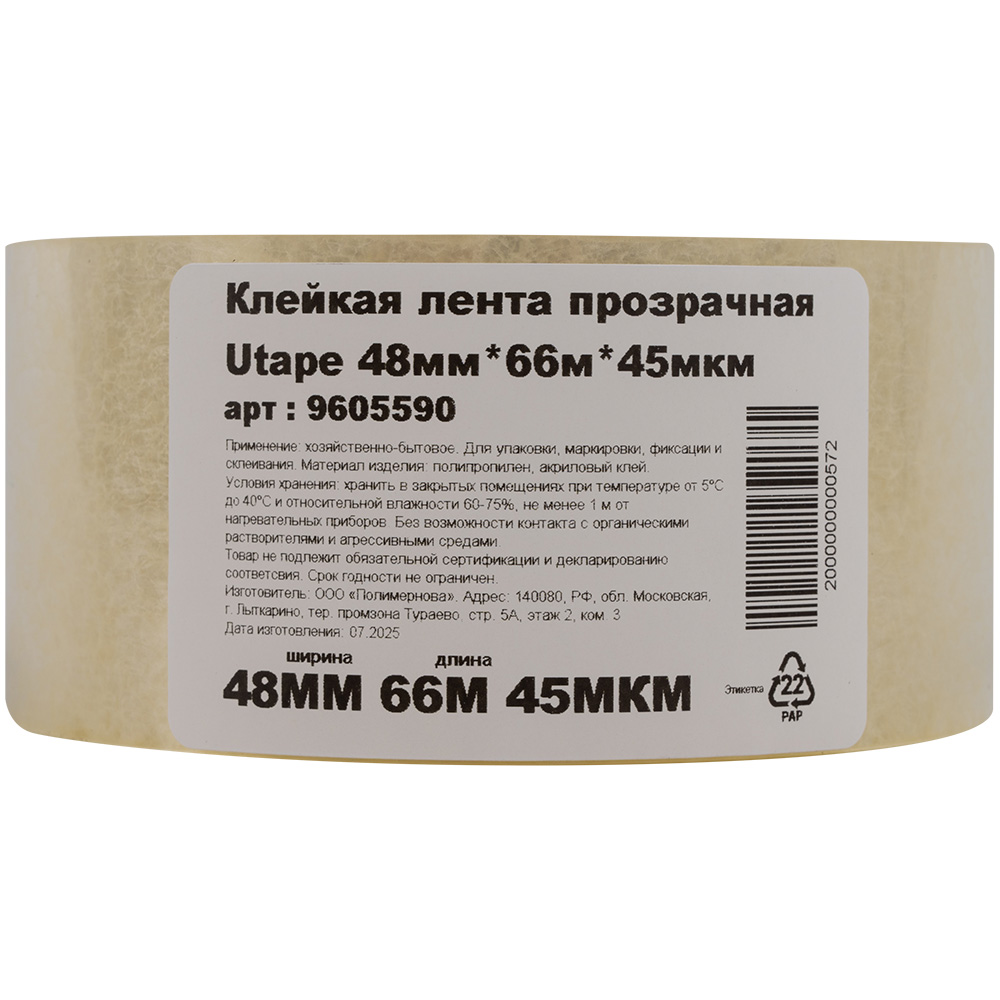 Клейкая лента Utape прозрачная шириной 48 мм, диаметром втулки 76 мм, намоткой 66 метров, толщиной 45 мкм для ручной упаковки. Изготовлена на основе полипропилена. Производитель ООО «Полимернова».