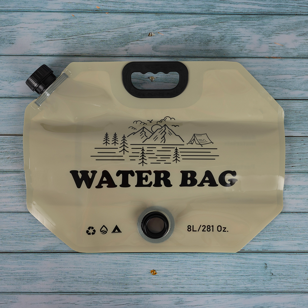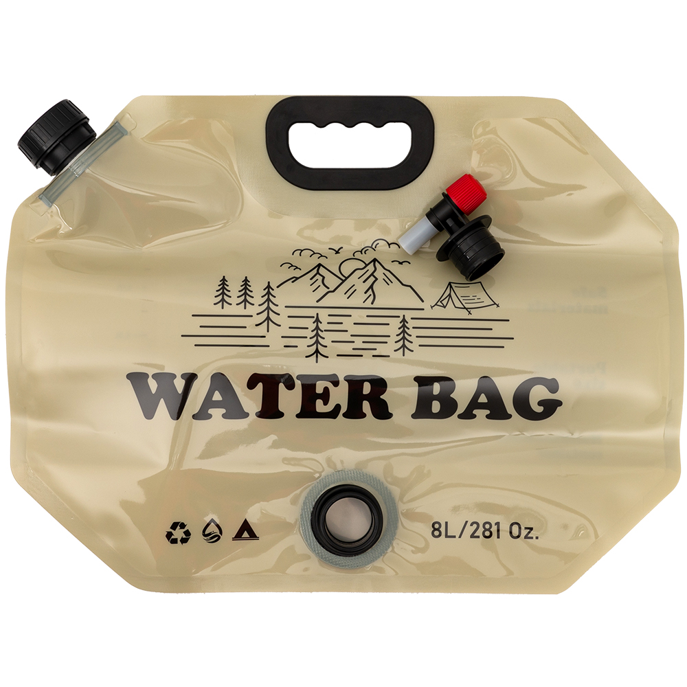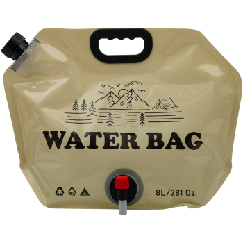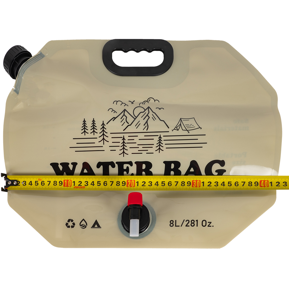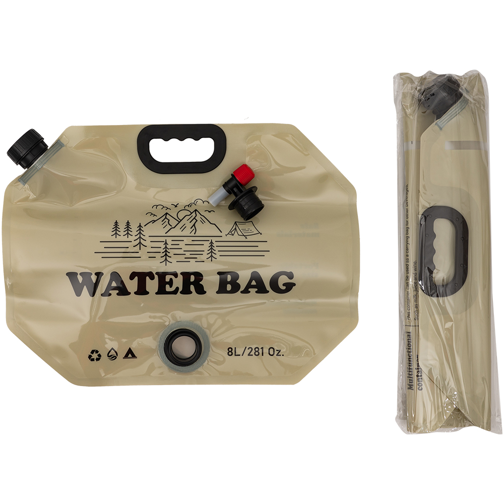 Складная сумка-канистра для хранения воды — ширина 42 см, глубина 7.5 см, высота 31 см, объём 8 л. Бежевый цвет. Материал — PET-G пластик. Занимает минимум места в сложенном виде — всего 15*15*7 см.