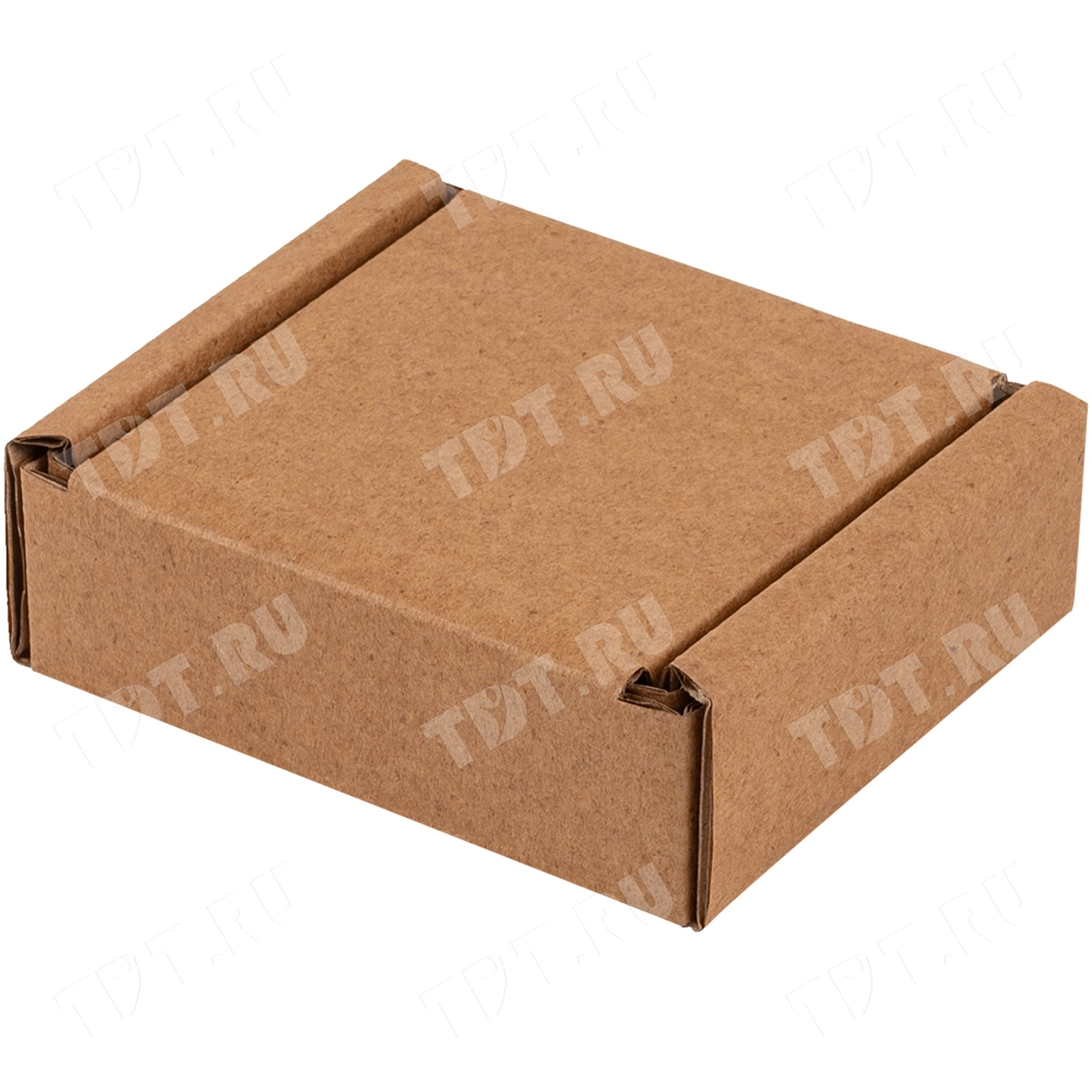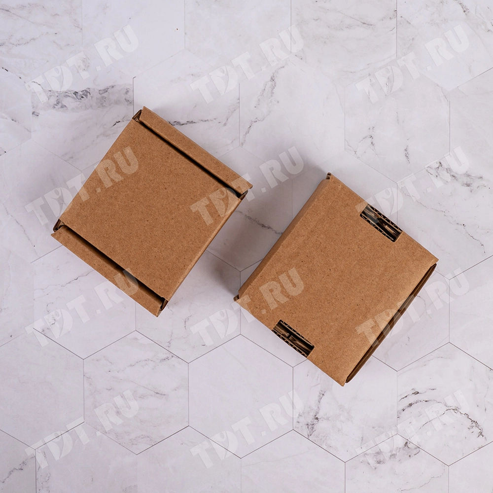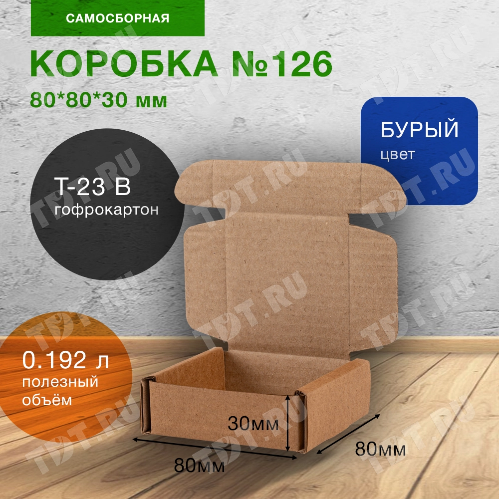 Самосборный короб №126 бурого цвета, длиной 80 мм, шириной 80 мм и высотой 30 мм. Изготовлен из гофрокартона Т-23 В. Полезный объём — 0.192 л.