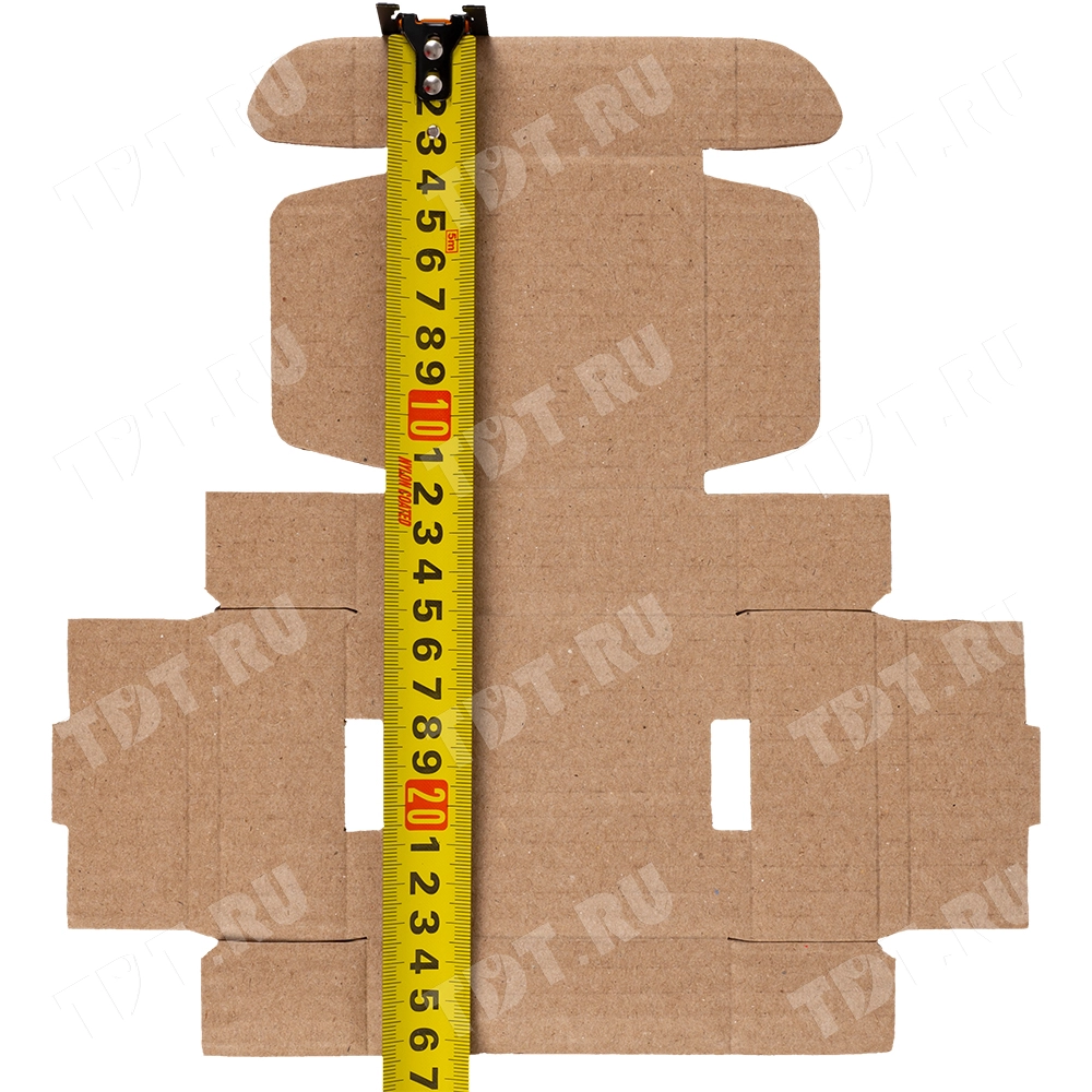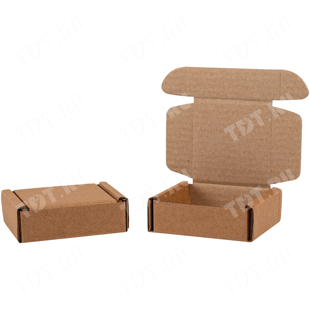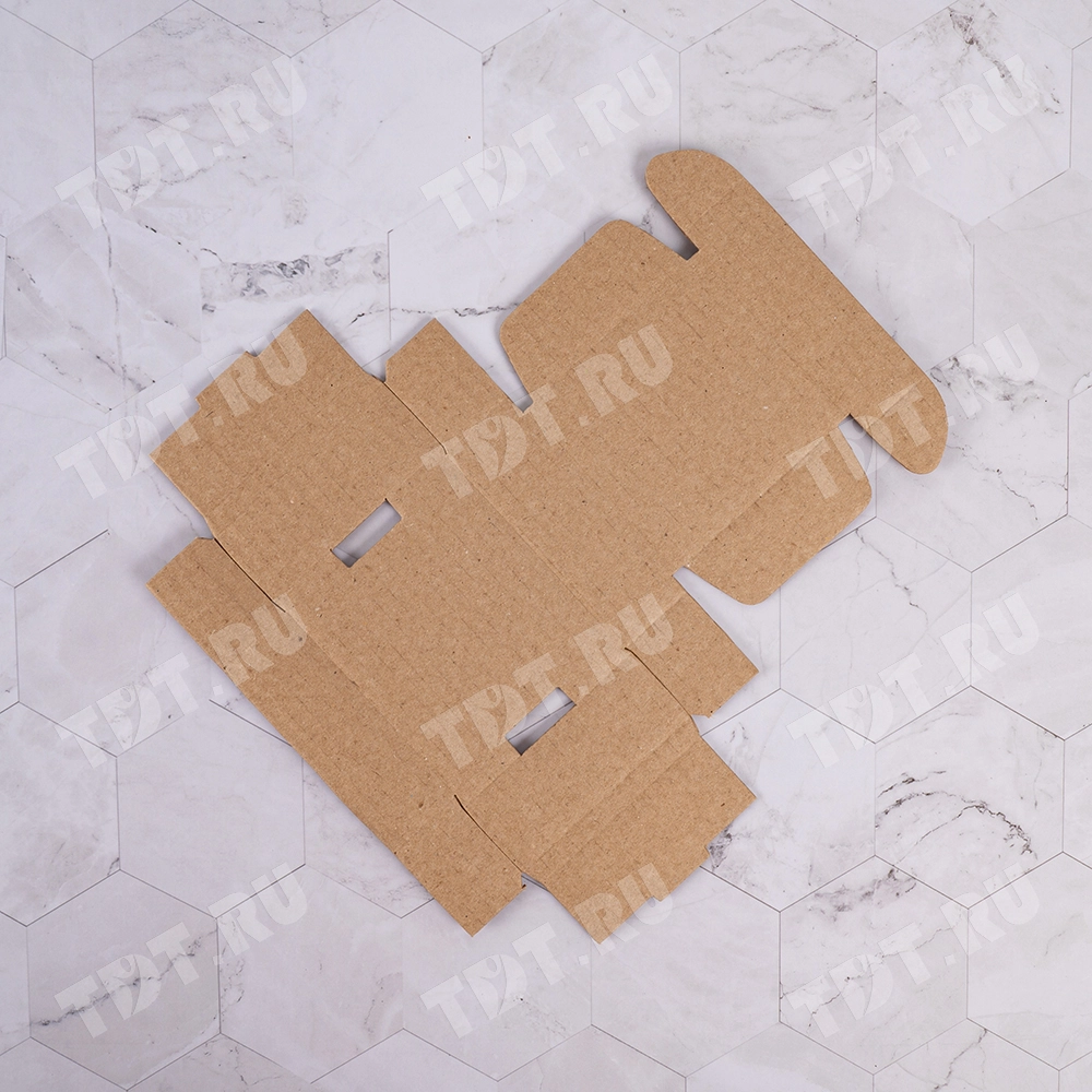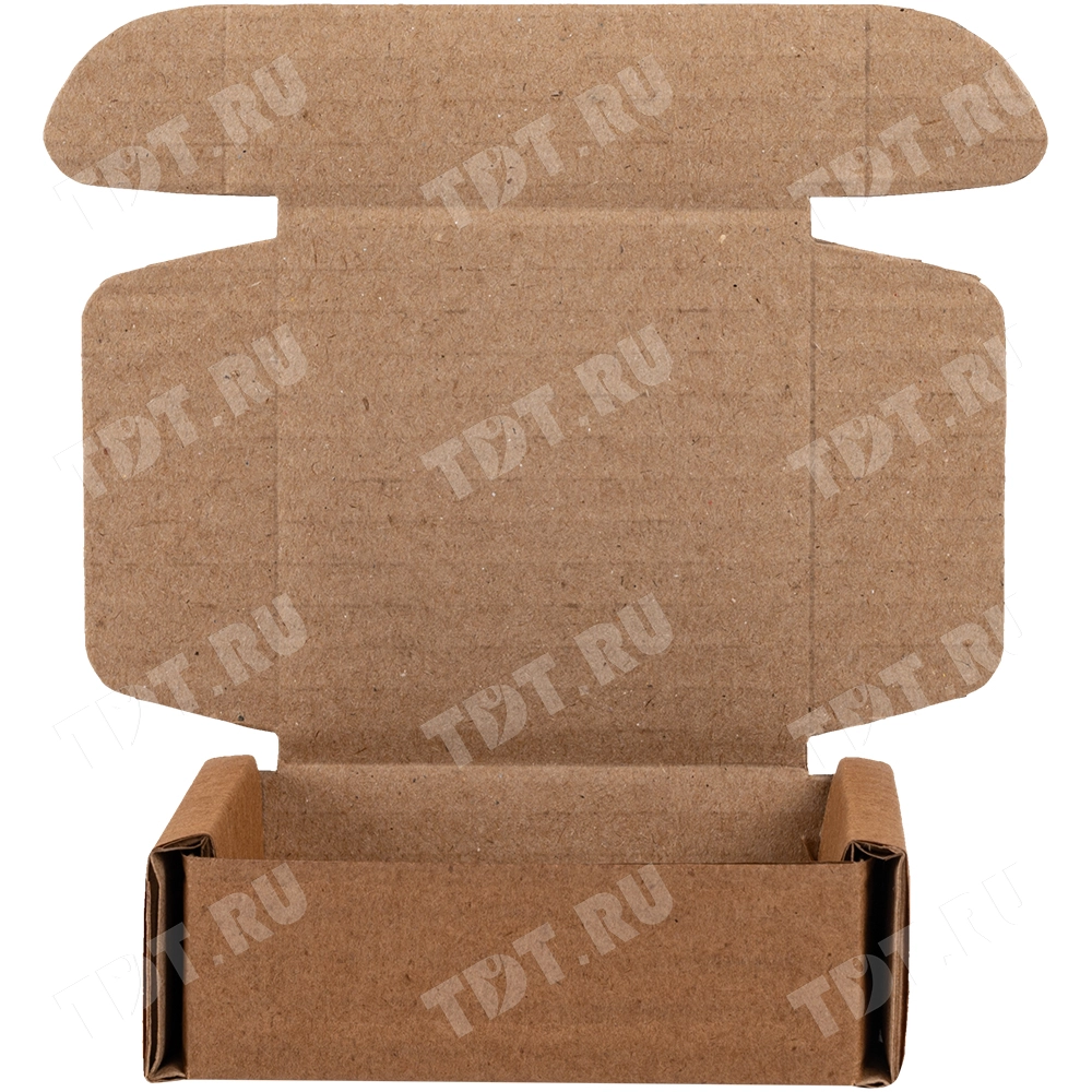 Самосборный короб №126 бурого цвета, длиной 80 мм, шириной 80 мм и высотой 30 мм. Изготовлен из гофрокартона Т-23 В. Полезный объём — 0.192 л.
