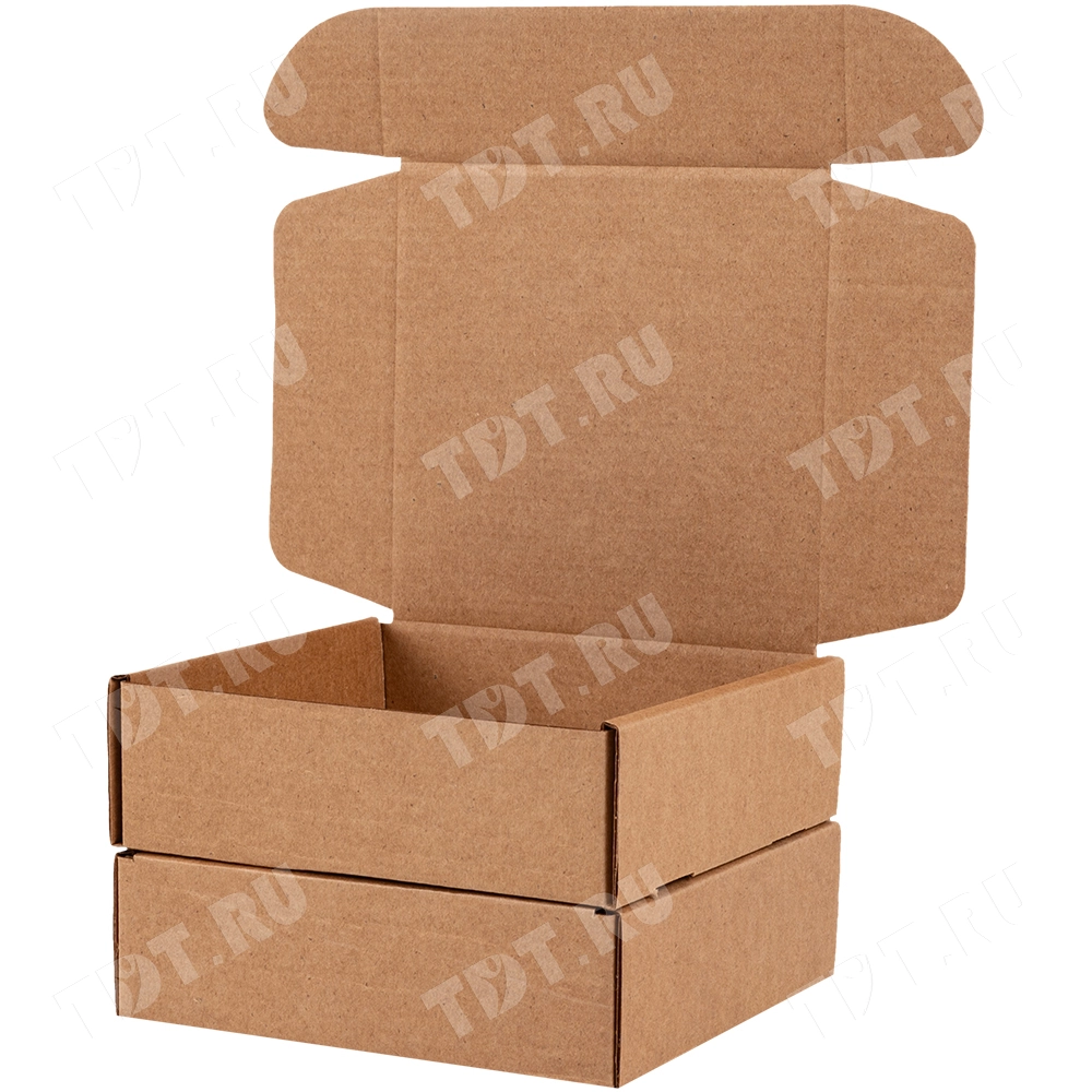 Самосборный короб №129 бурого цвета, длиной 125 мм, шириной 120 мм и высотой 40 мм. Изготовлен из гофрокартона Т-23 Е. Полезный объём — 0.6 л.