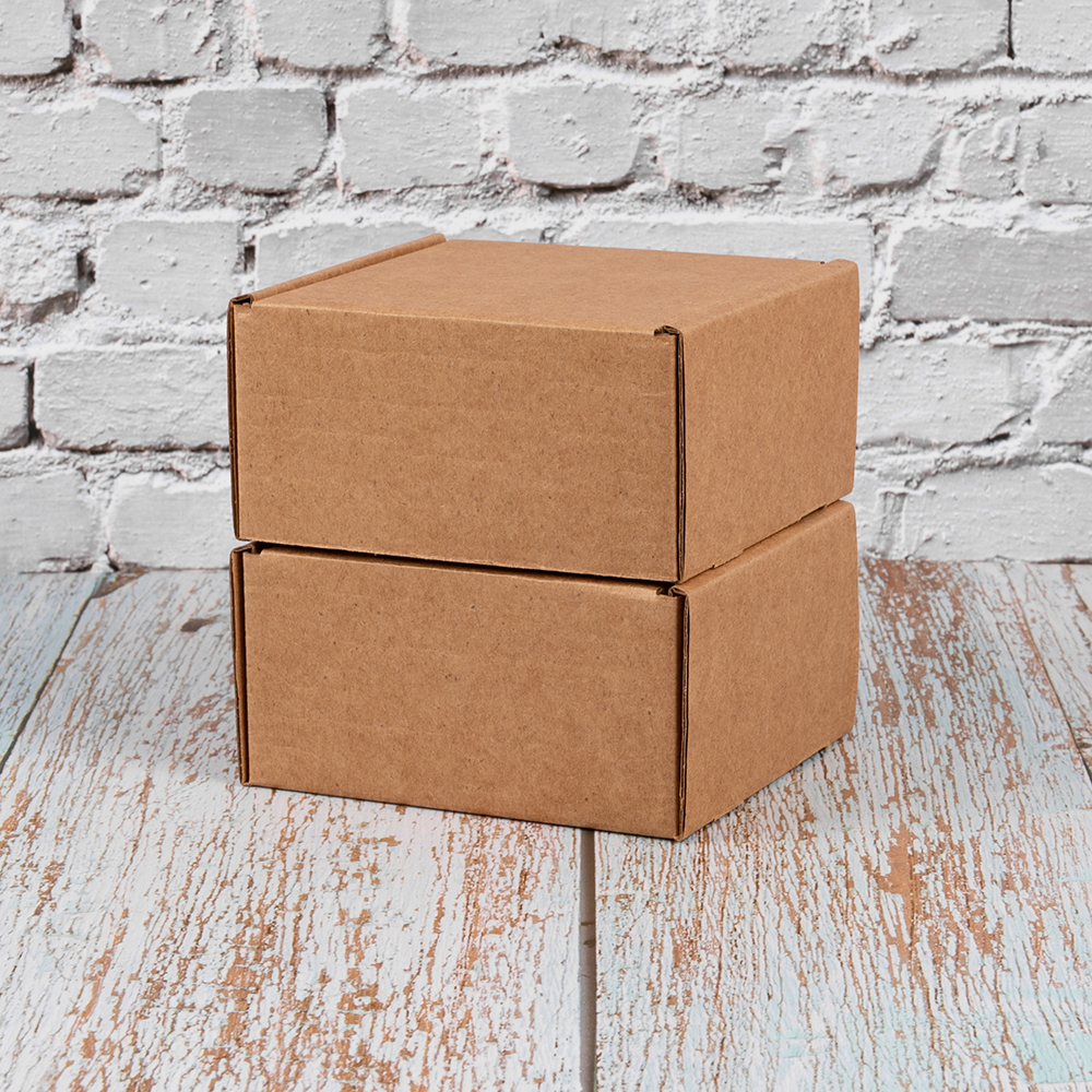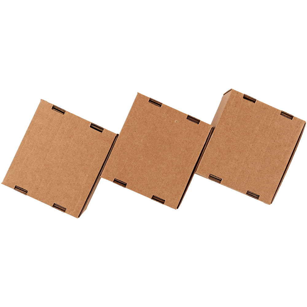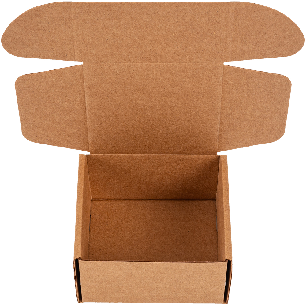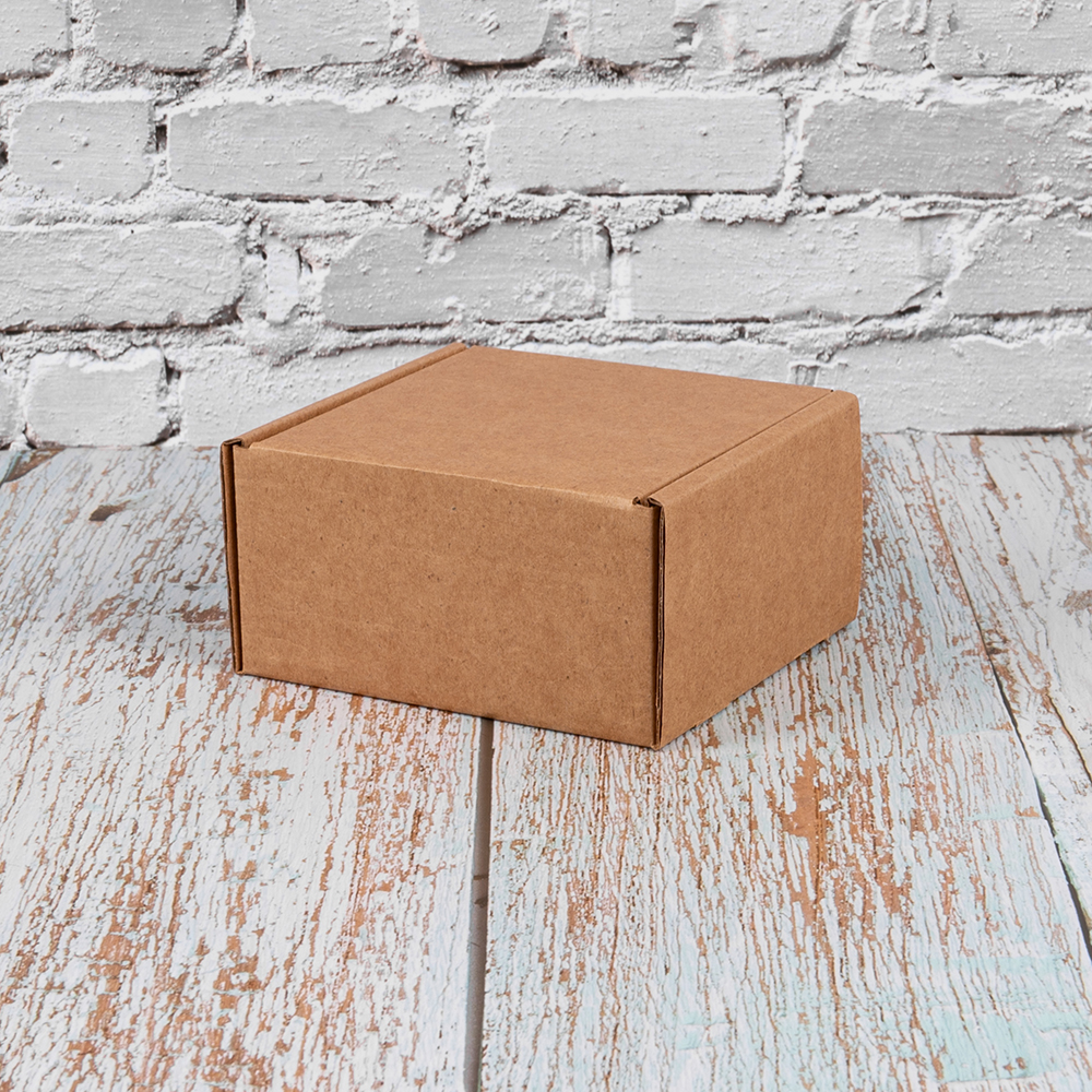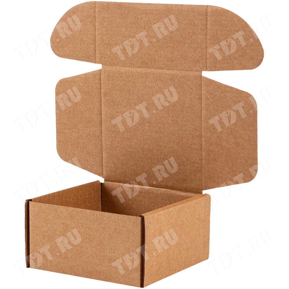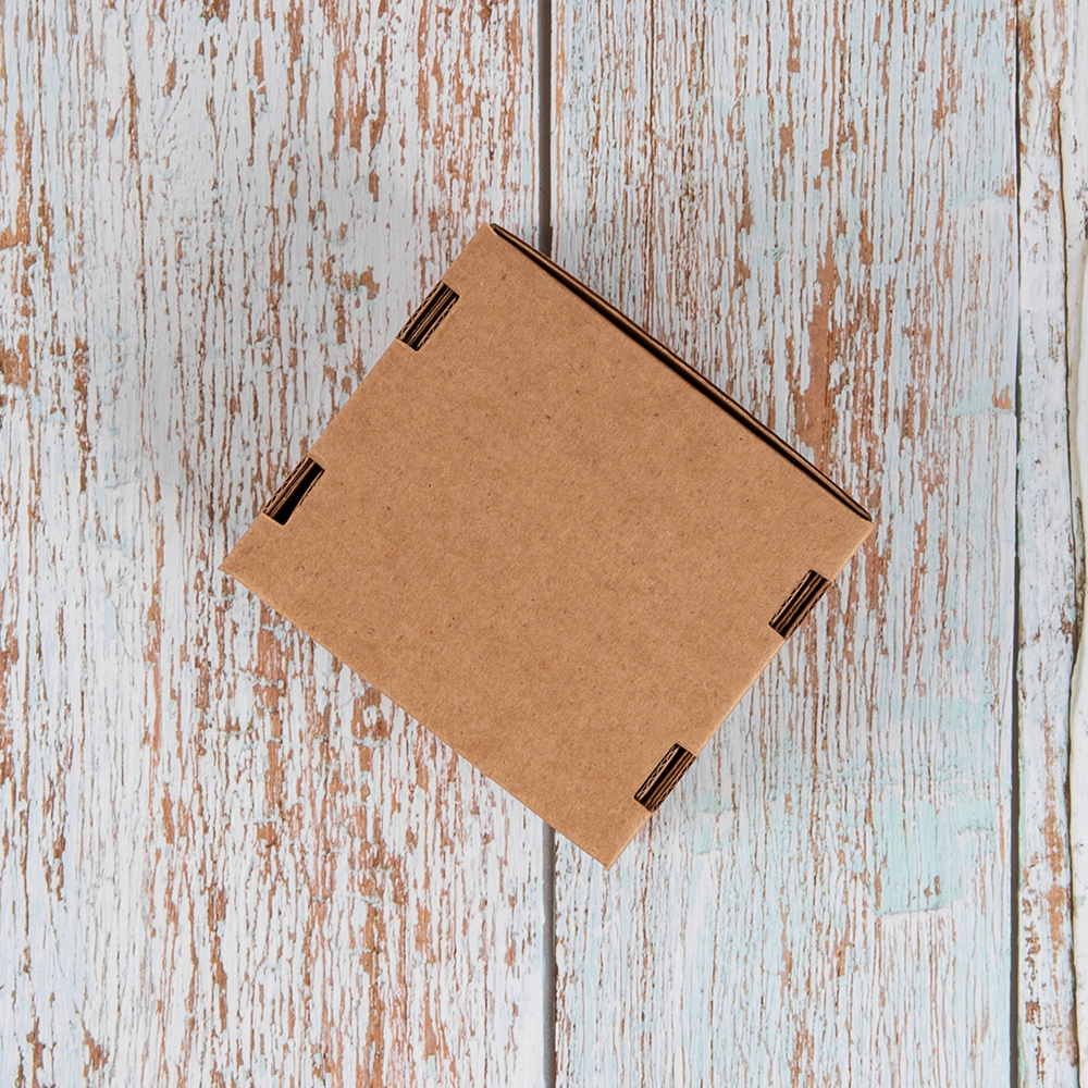 Самосборный короб №134 бурого цвета, длиной 90 мм, шириной 90 мм и высотой 50 мм. Изготовлен из гофрокартона Т-23 Е. Полезный объём — 0.41 л.