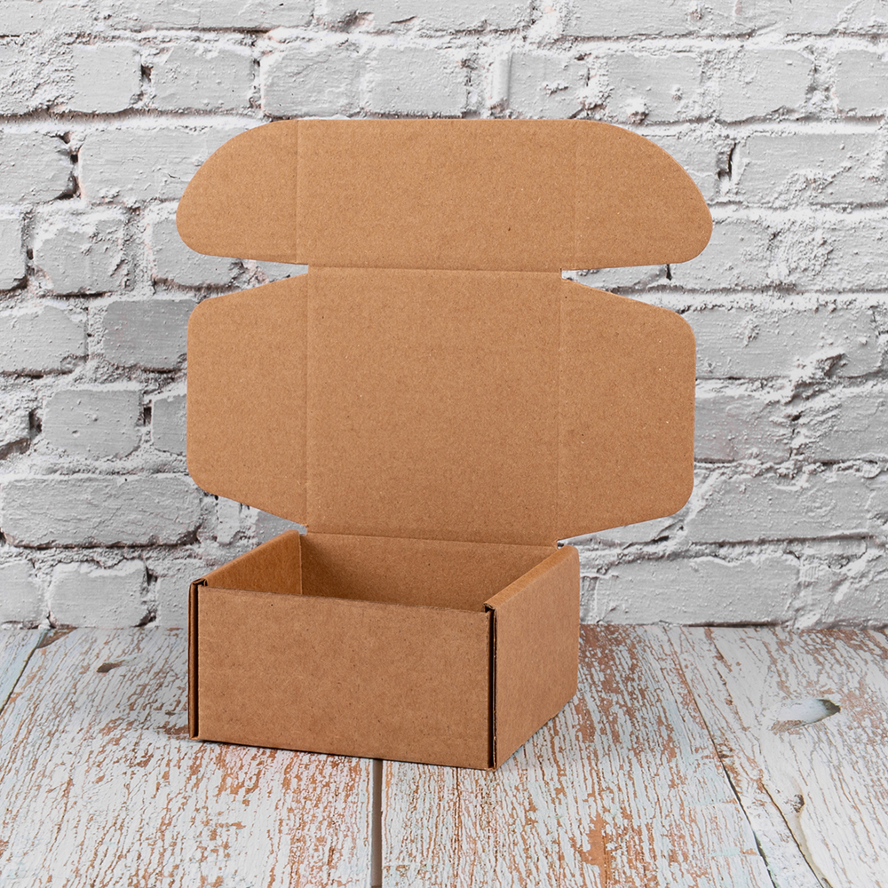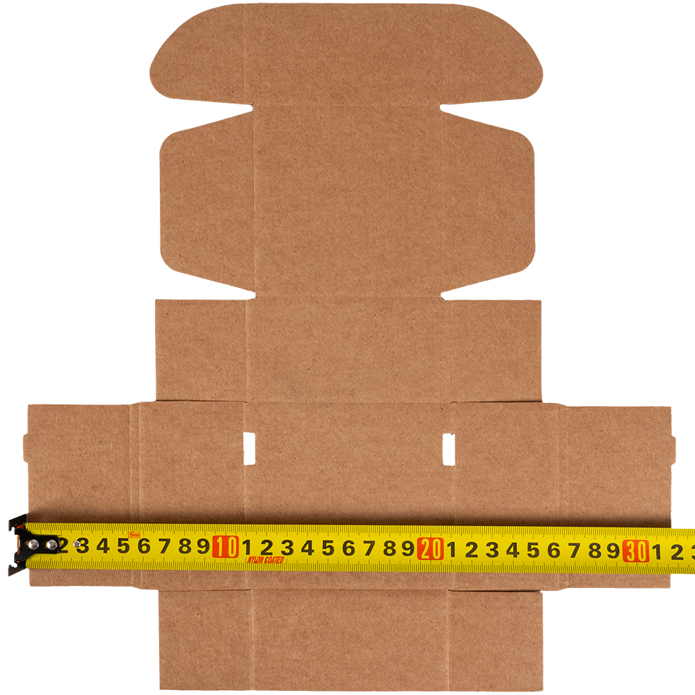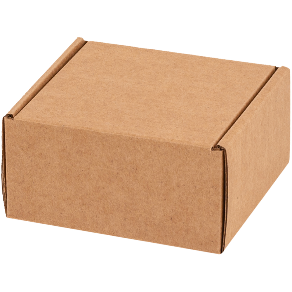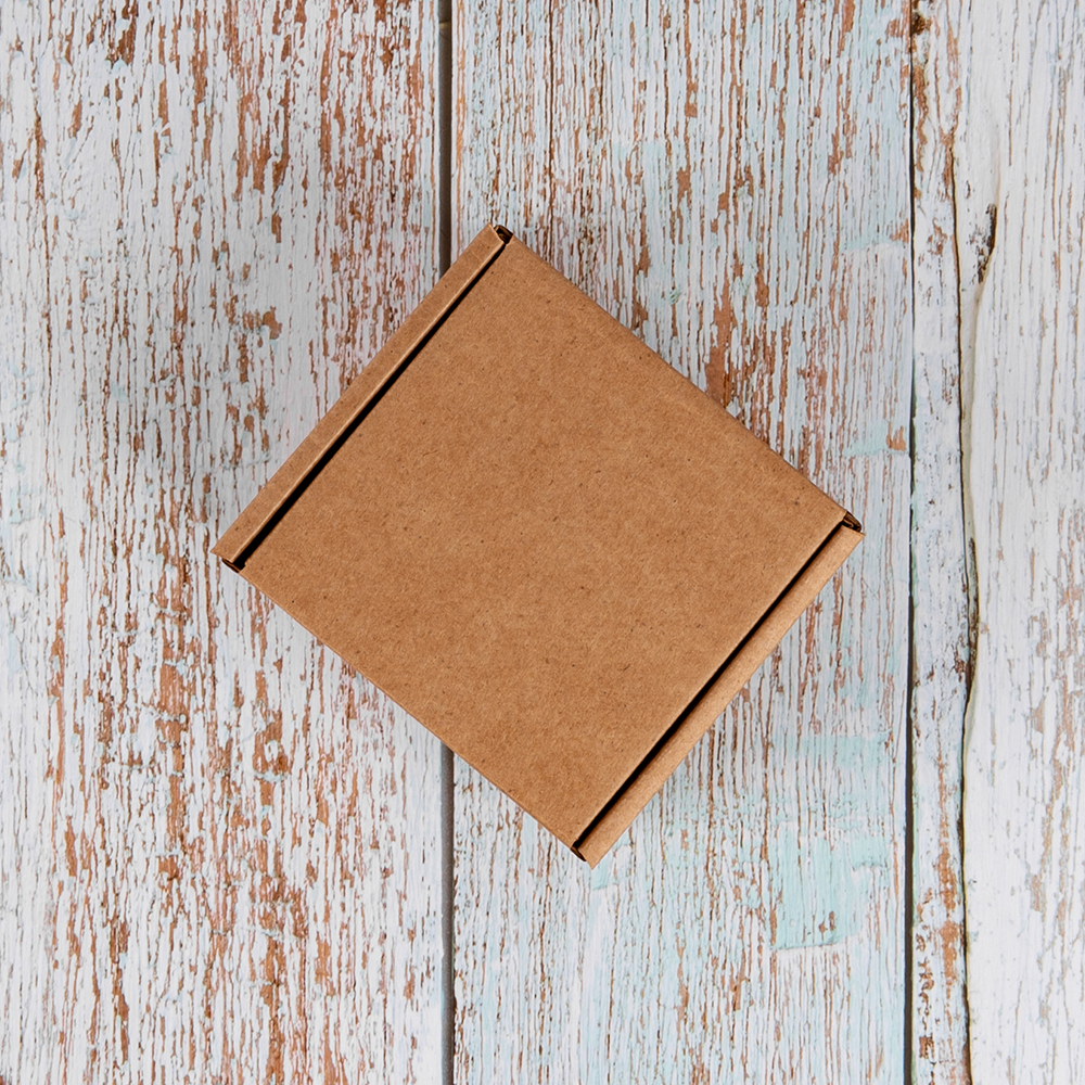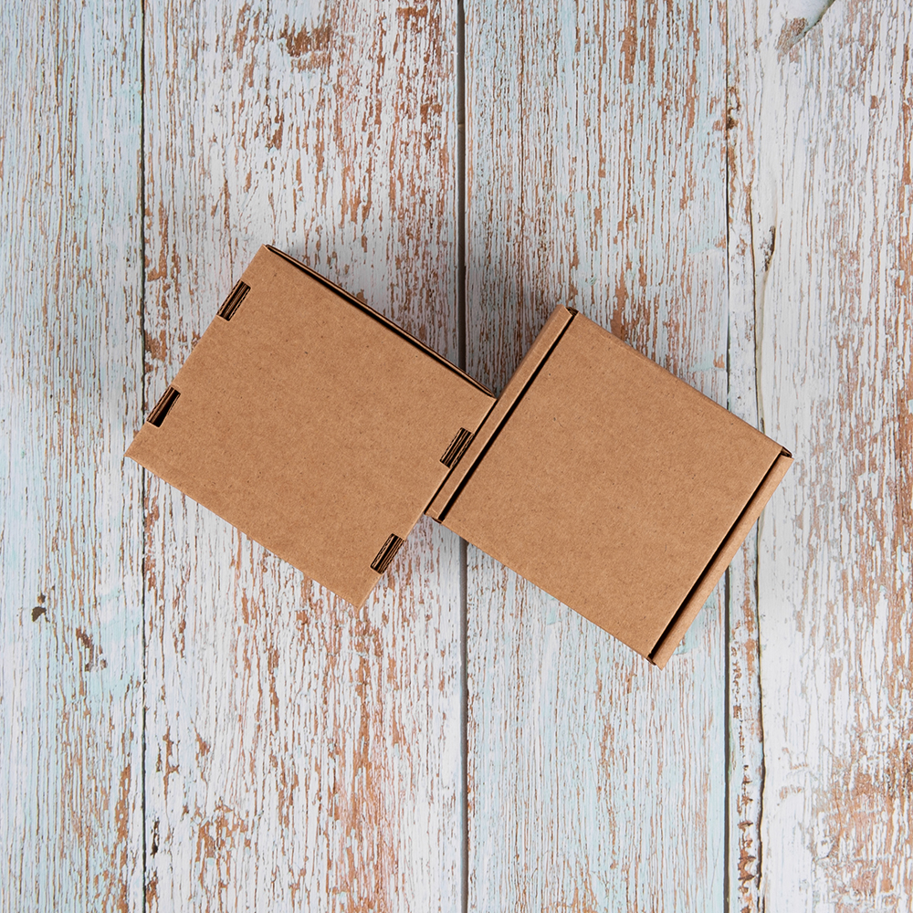 Самосборный короб №134 бурого цвета, длиной 90 мм, шириной 90 мм и высотой 50 мм. Изготовлен из гофрокартона Т-23 Е. Полезный объём — 0.41 л.