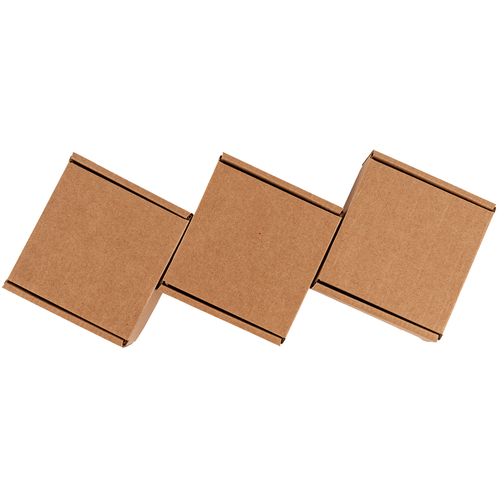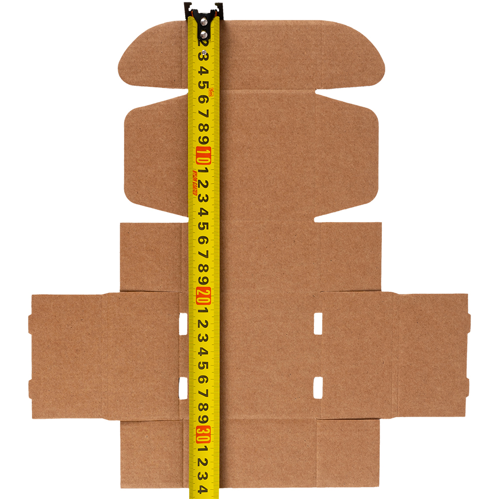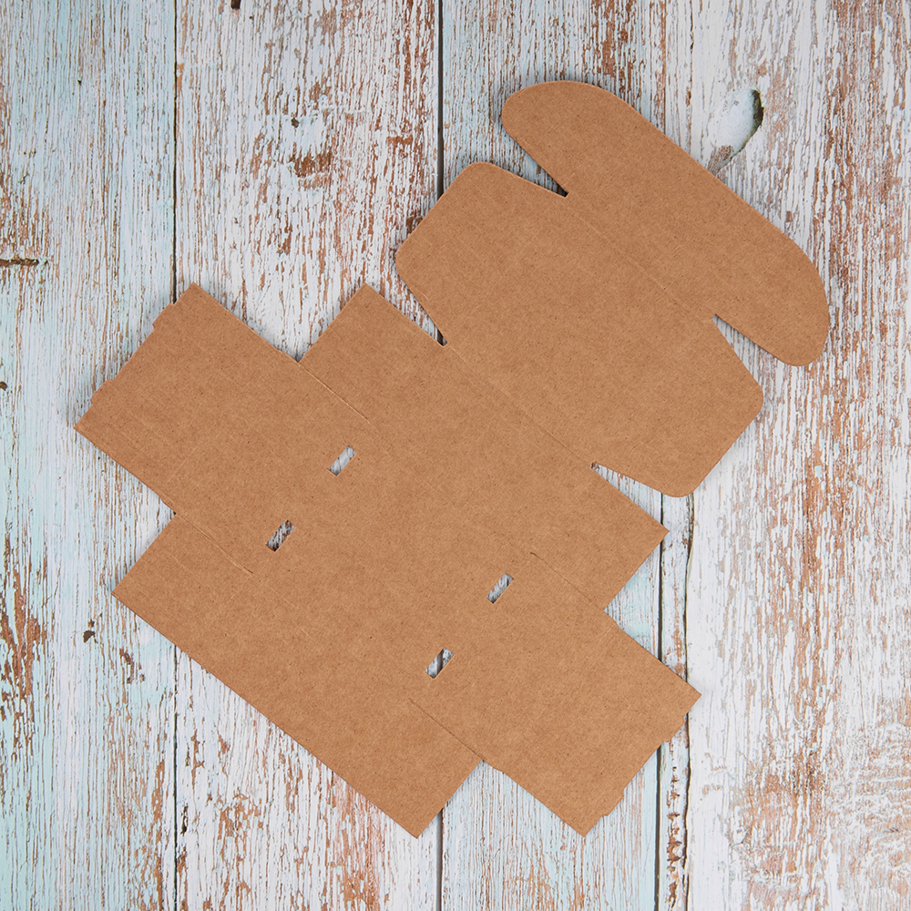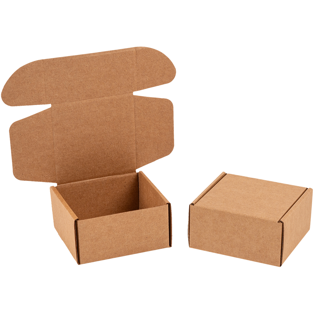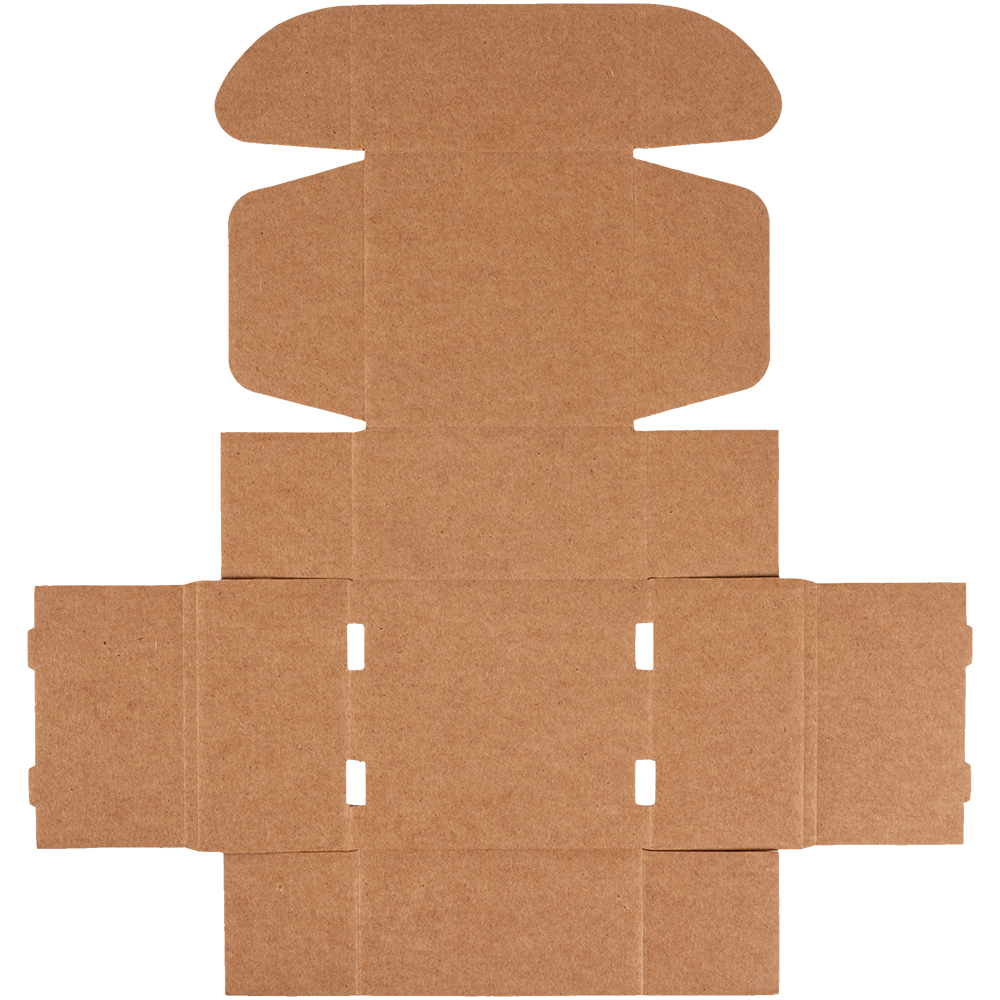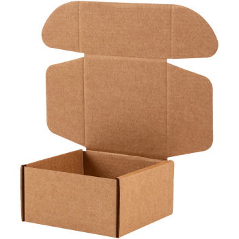 Самосборный короб №134 бурого цвета, длиной 90 мм, шириной 90 мм и высотой 50 мм. Изготовлен из гофрокартона Т-23 Е. Полезный объём — 0.41 л.