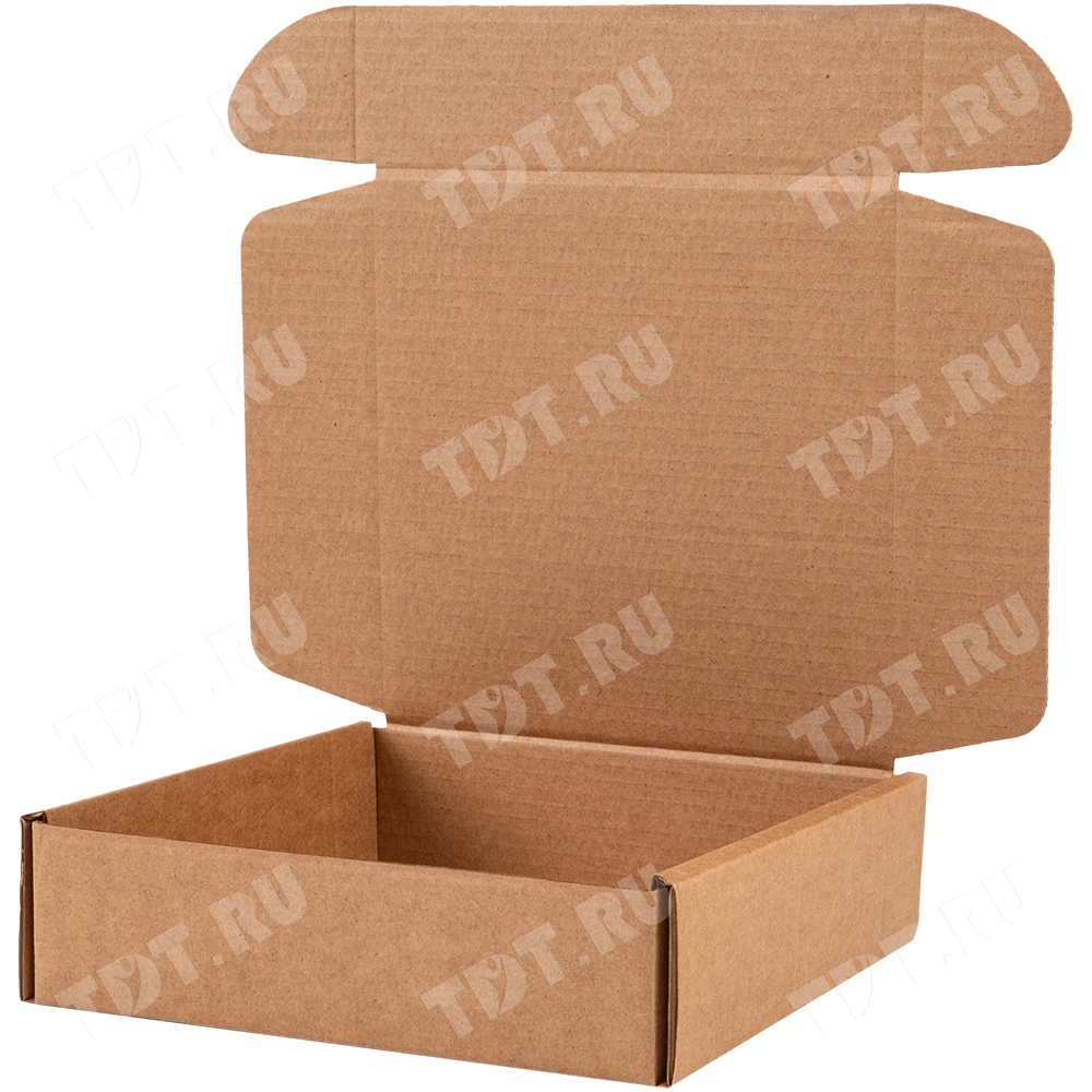 Самосборный короб №137 бурого цвета, длиной 230 мм, шириной 230 мм и высотой 65 мм. Изготовлен из гофрокартона Т-23 В. Полезный объём — 3.44 л.