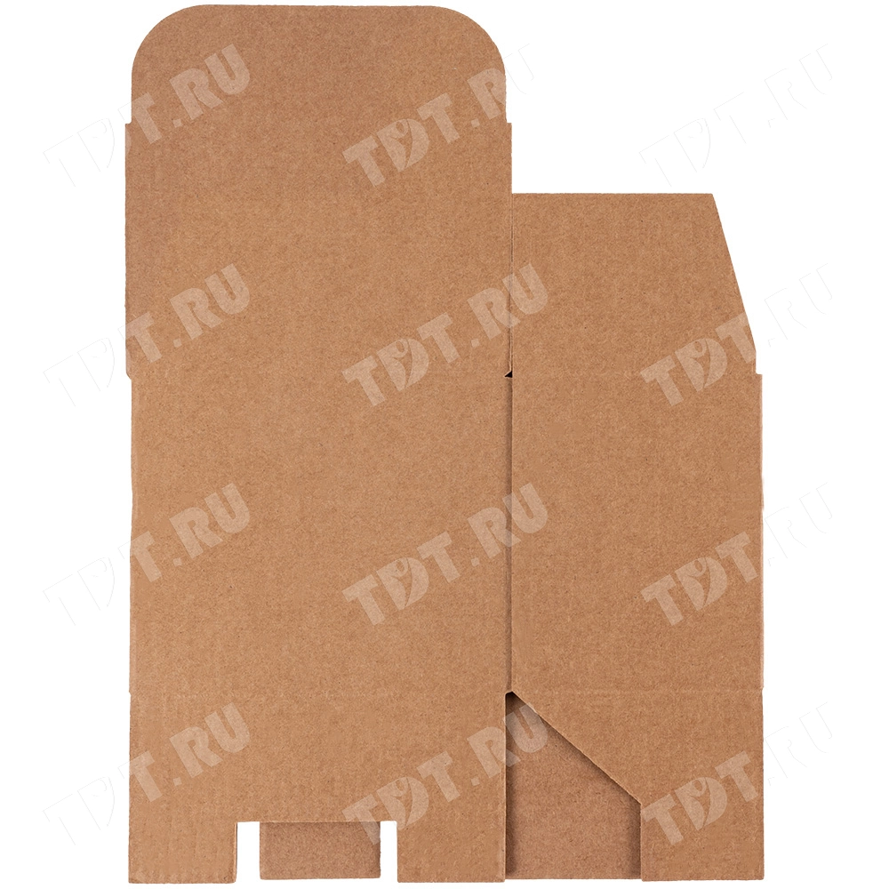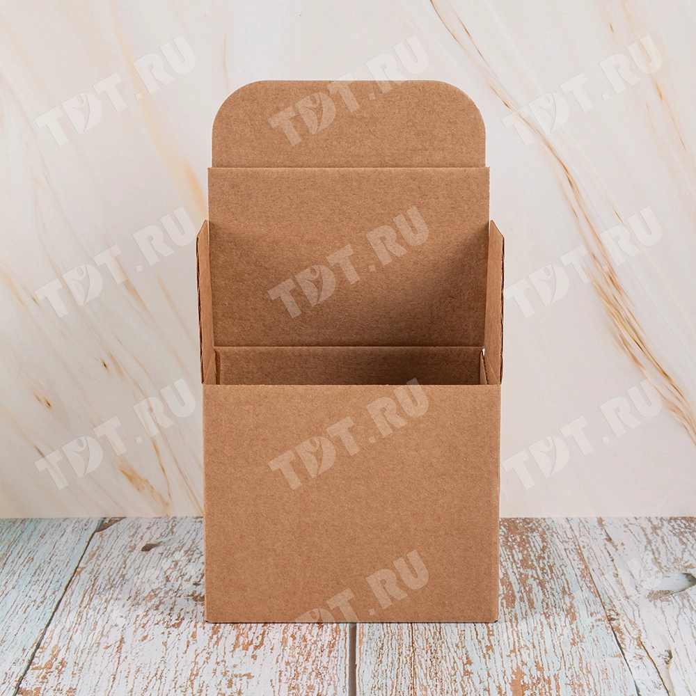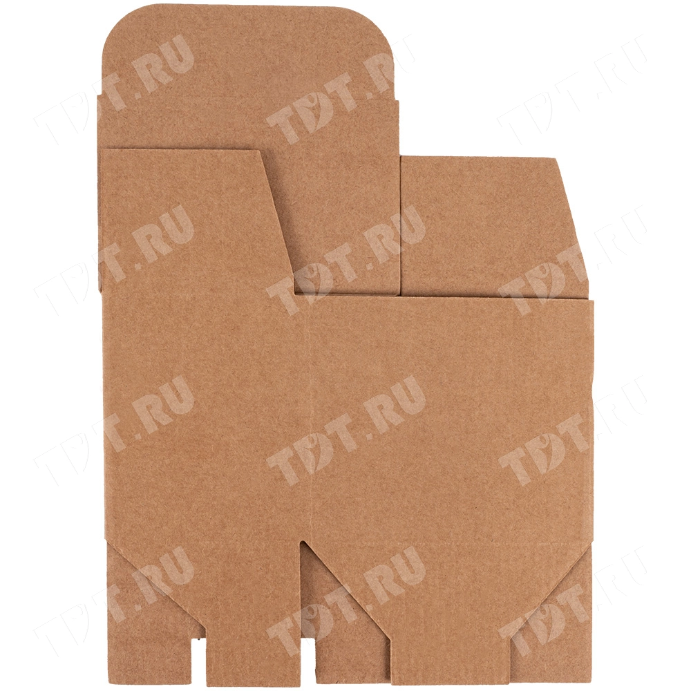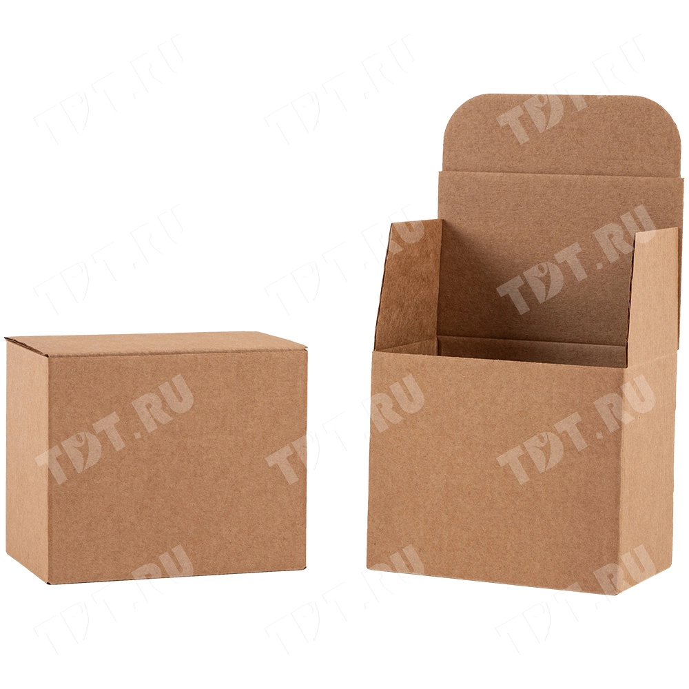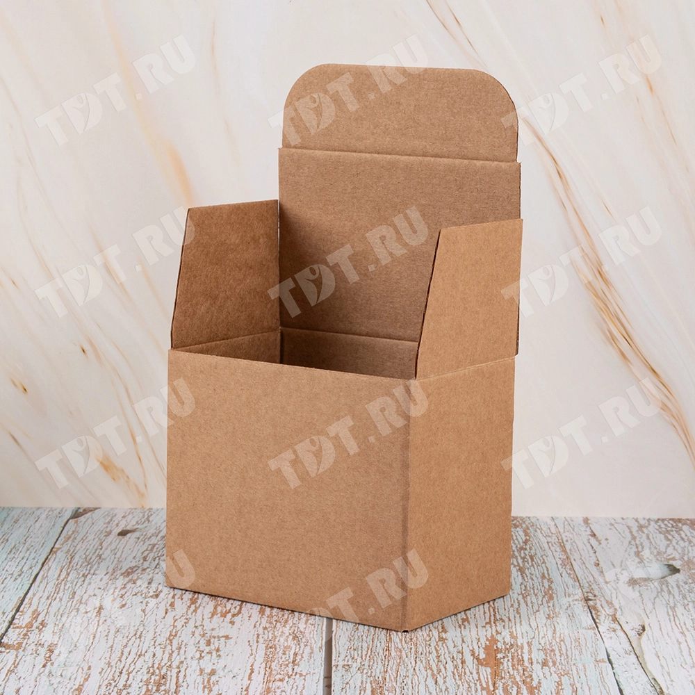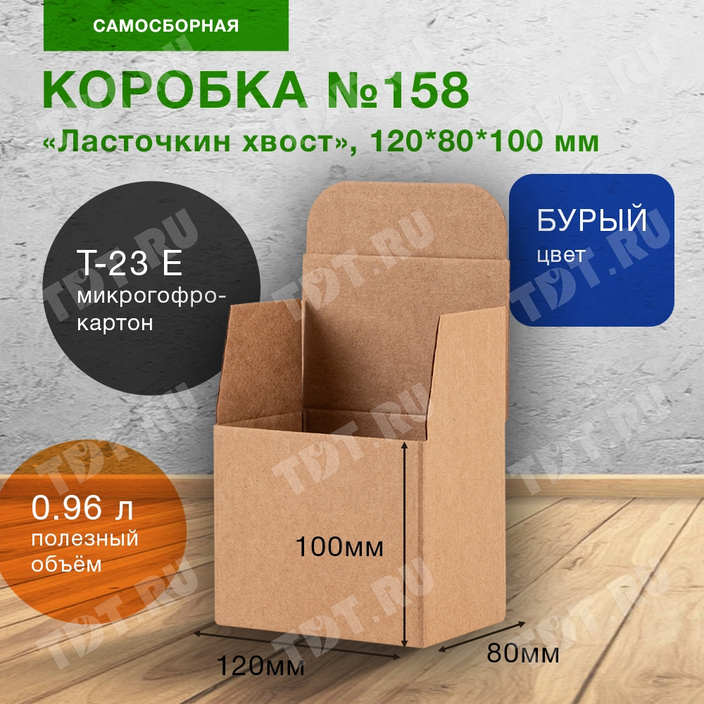 Самосборный короб №158 «Ласточкин хвост» бурого цвета, длиной 120 мм, шириной 80 мм и высотой 100 мм. Изготовлен из гофрокартона Т-23 Е. Полезный объём — 0.96 л.