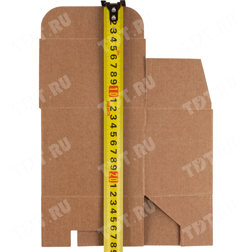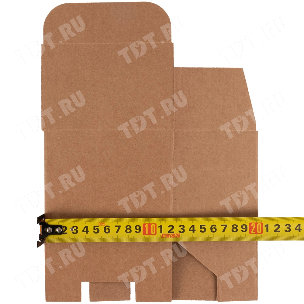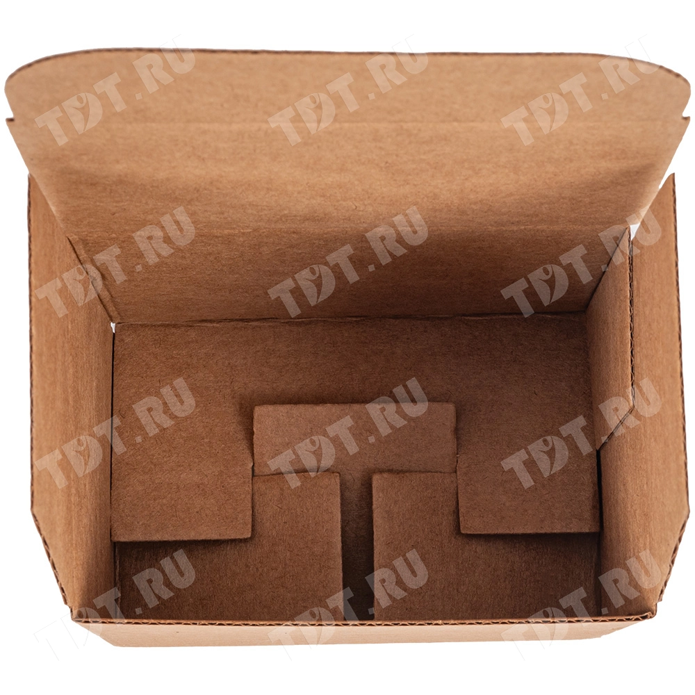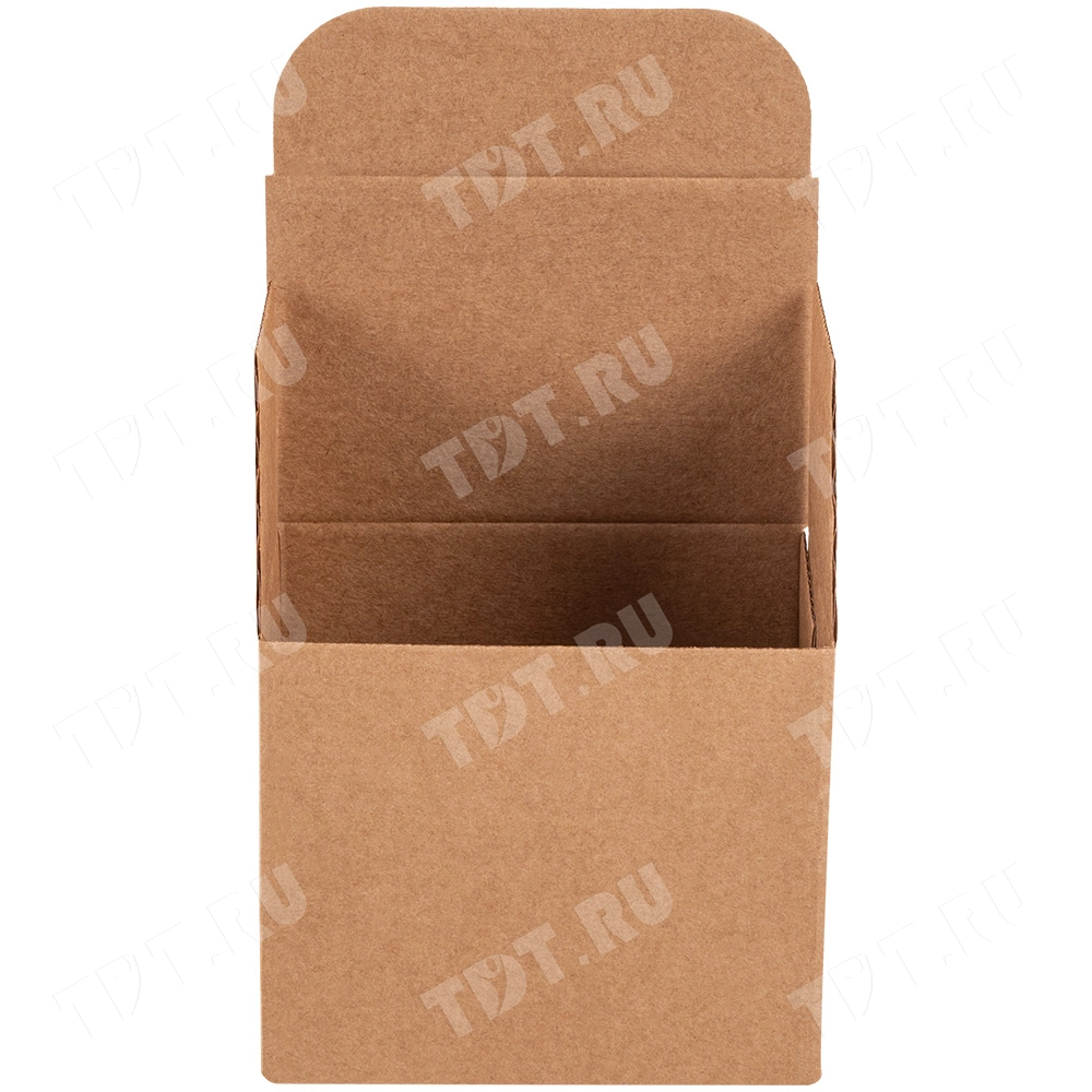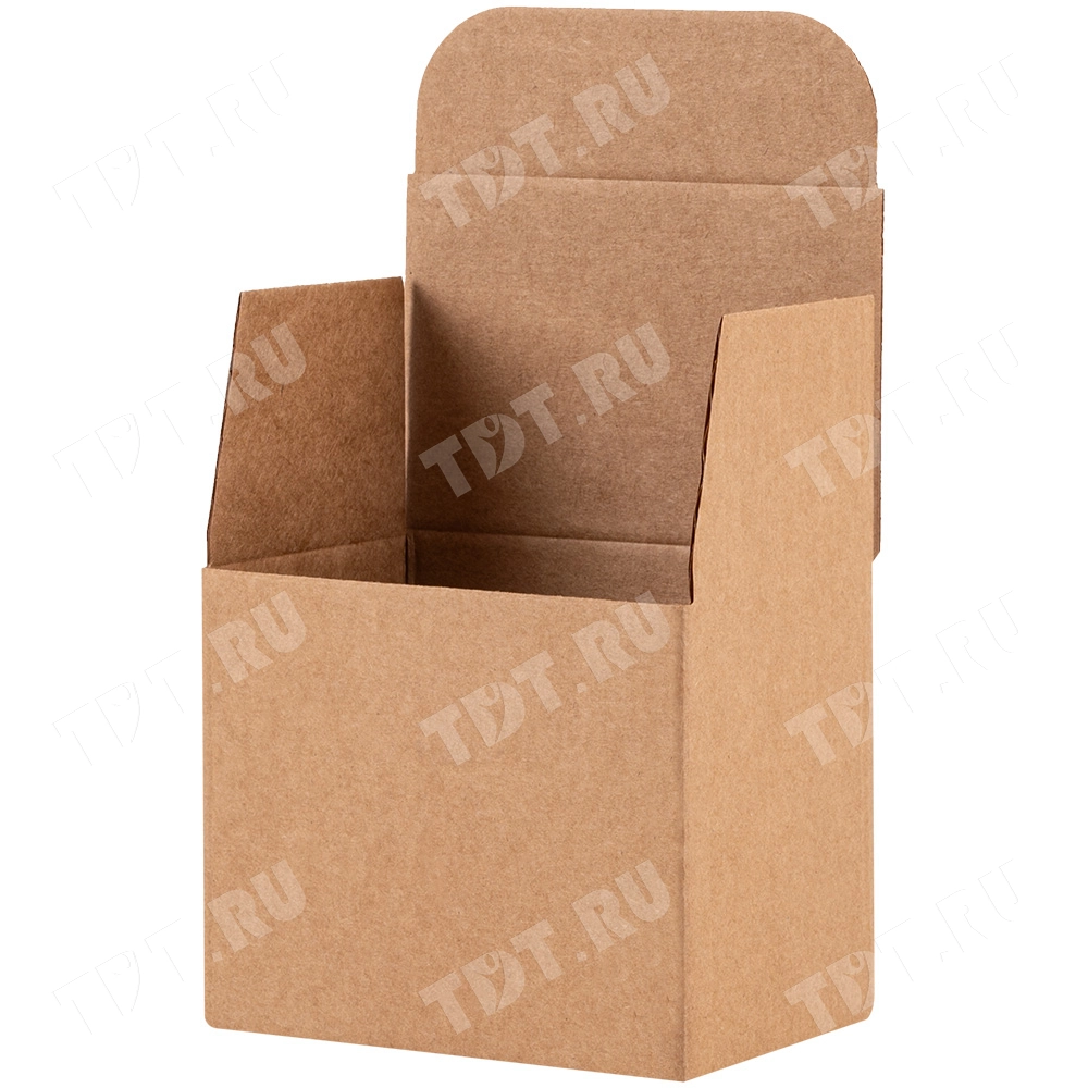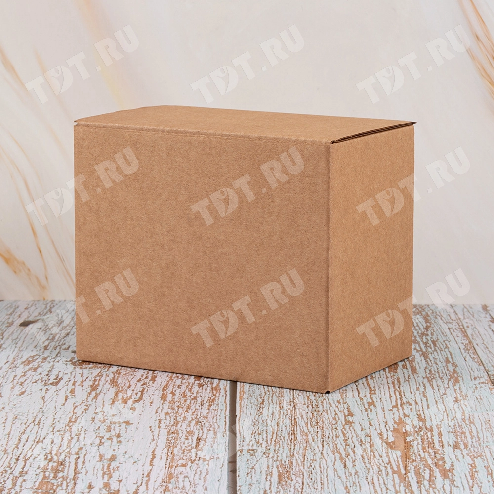 Самосборный короб №158 «Ласточкин хвост» бурого цвета, длиной 120 мм, шириной 80 мм и высотой 100 мм. Изготовлен из гофрокартона Т-23 Е. Полезный объём — 0.96 л.