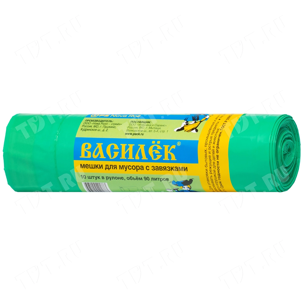 Мешки для мусора «Василёк» с завязками, зелёного цвета снаружи и белого внутри, объёмом 90 л, длиной 90 см, шириной 65 см, толщиной 30 мкм, в упаковке по 10 штук. Изготовлены из полиэтилена высокого давления (ПВД).