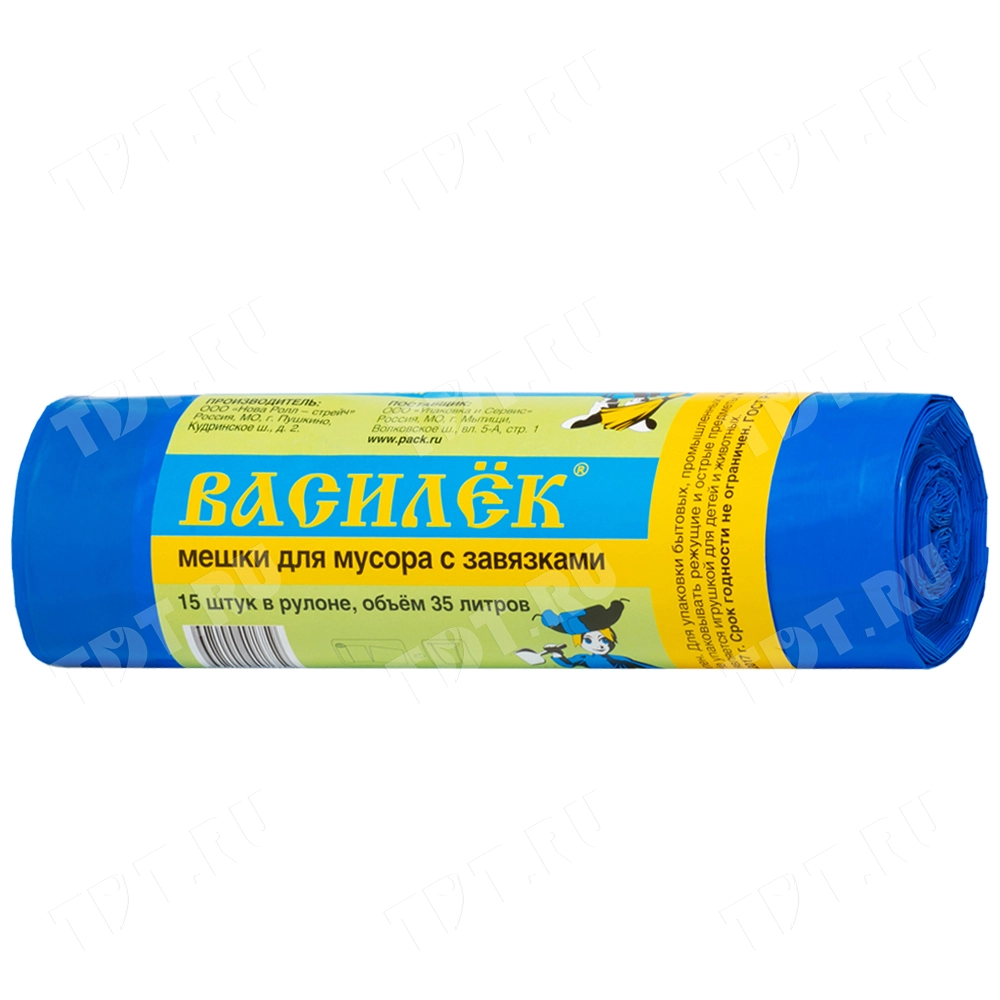 Мешки для мусора «Василёк» с завязками, синего цвета снаружи и белого внутри, объёмом 35 л, длиной 57 см, шириной 47 см, толщиной 25 мкм, в упаковке по 15 штук. Изготовлены из полиэтилена высокого давления (ПВД).