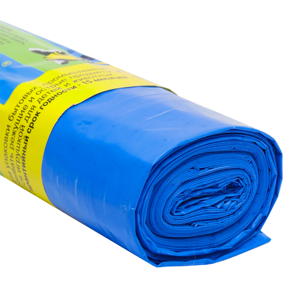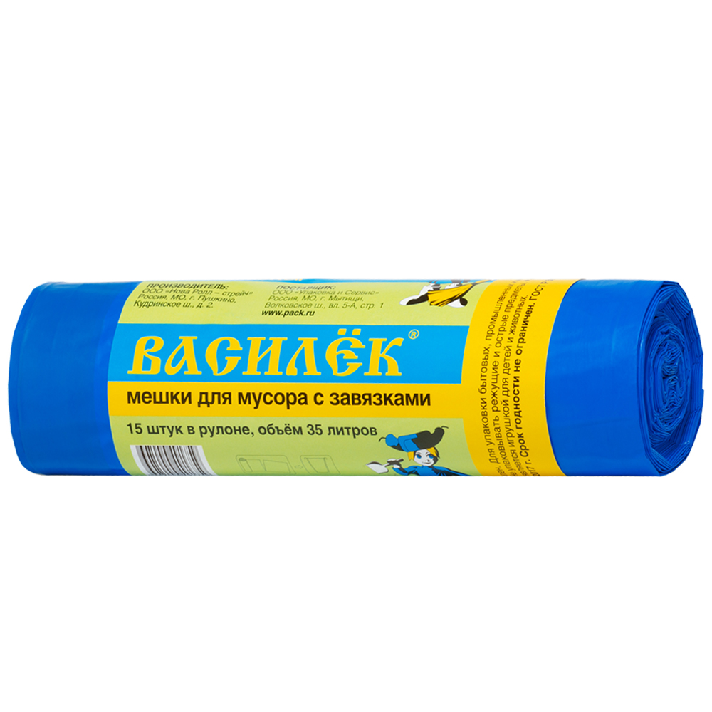 Мешки для мусора «Василёк» с завязками, синего цвета снаружи и белого внутри, объёмом 35 л, длиной 57 см, шириной 47 см, толщиной 25 мкм, в упаковке по 15 штук. Изготовлены из полиэтилена высокого давления (ПВД).