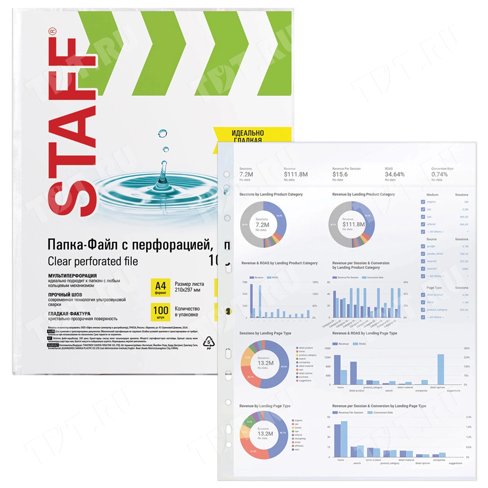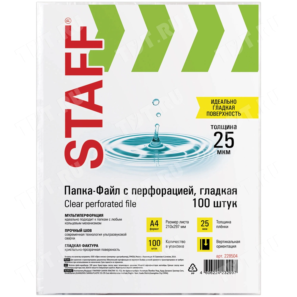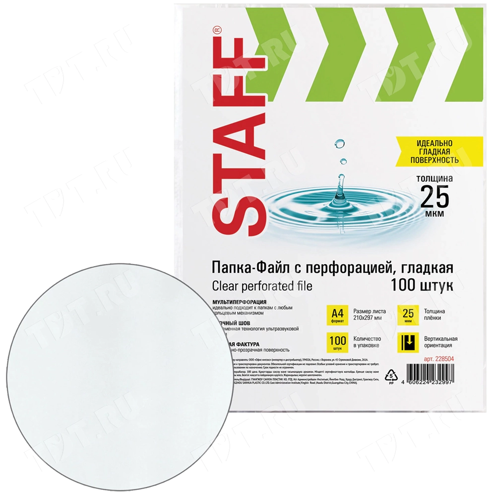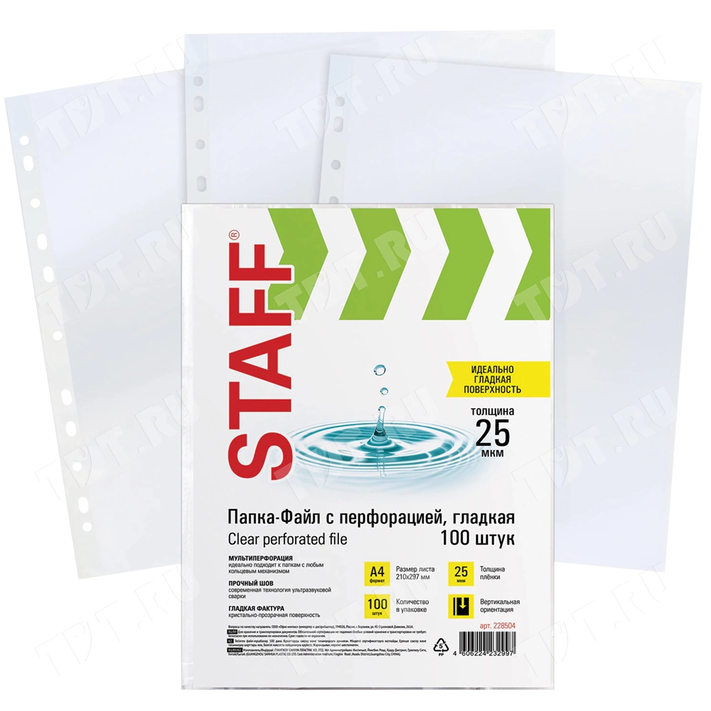 Папки-файлы с перфорацией STAFF «Эконом», формата А4, толщиной 25 мкм, прозрачного цвета, код производителя 228504, в упаковке по 100 штук. Производится в Китае.