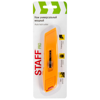 Универсальный мощный нож STAFF «PRO» с автофиксатором, код производителя 238734, шириной лезвия 18 мм. Материал корпуса – ABS пластик. Производится в Китае.