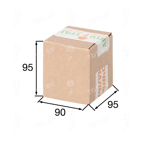 Короб К-404 бурого цвета, длиной 90 мм, шириной 95 мм и высотой 95 мм. Изготовлен из трехслойного картона марки Т-23 В. Полезный объём — 0.8 л.