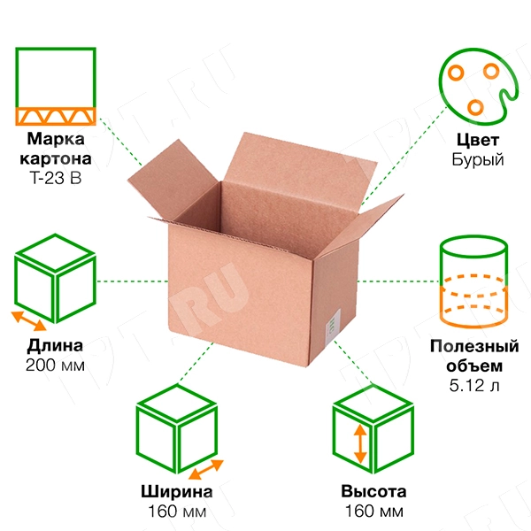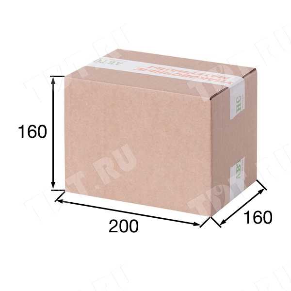 Короб К-405, длиной 200 мм, шириной 160 мм и высотой 160 мм. Изготовлен из трехслойного картона марки Т-23. Полезный объём — 5.12 л.