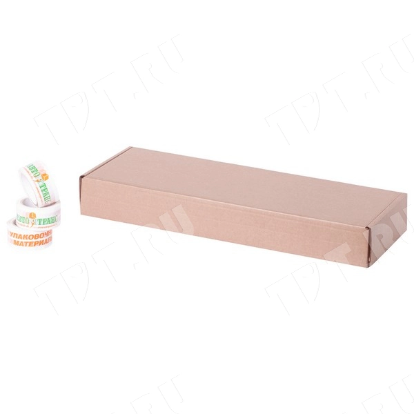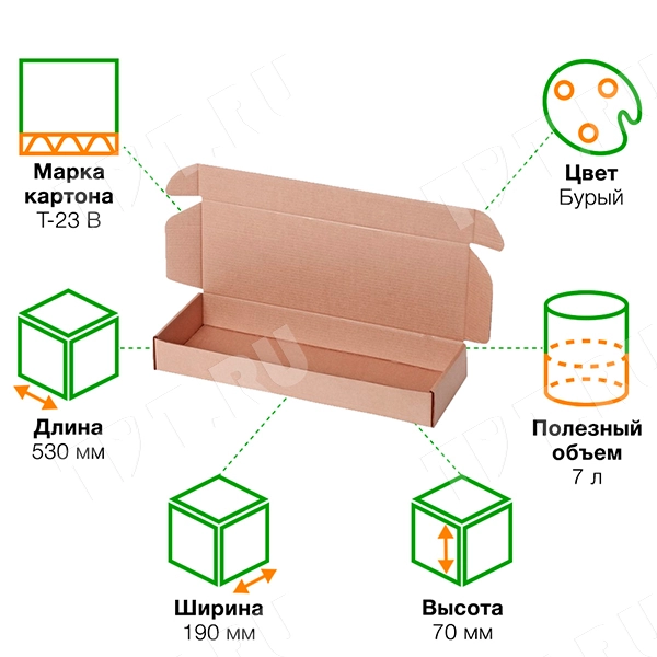 Короб КС-256 бурого цвета, длиной 530 мм, шириной 190 мм и высотой 70 мм. Изготовлен из гофрокартона Т-23 В. Полезный объём — 7 л.